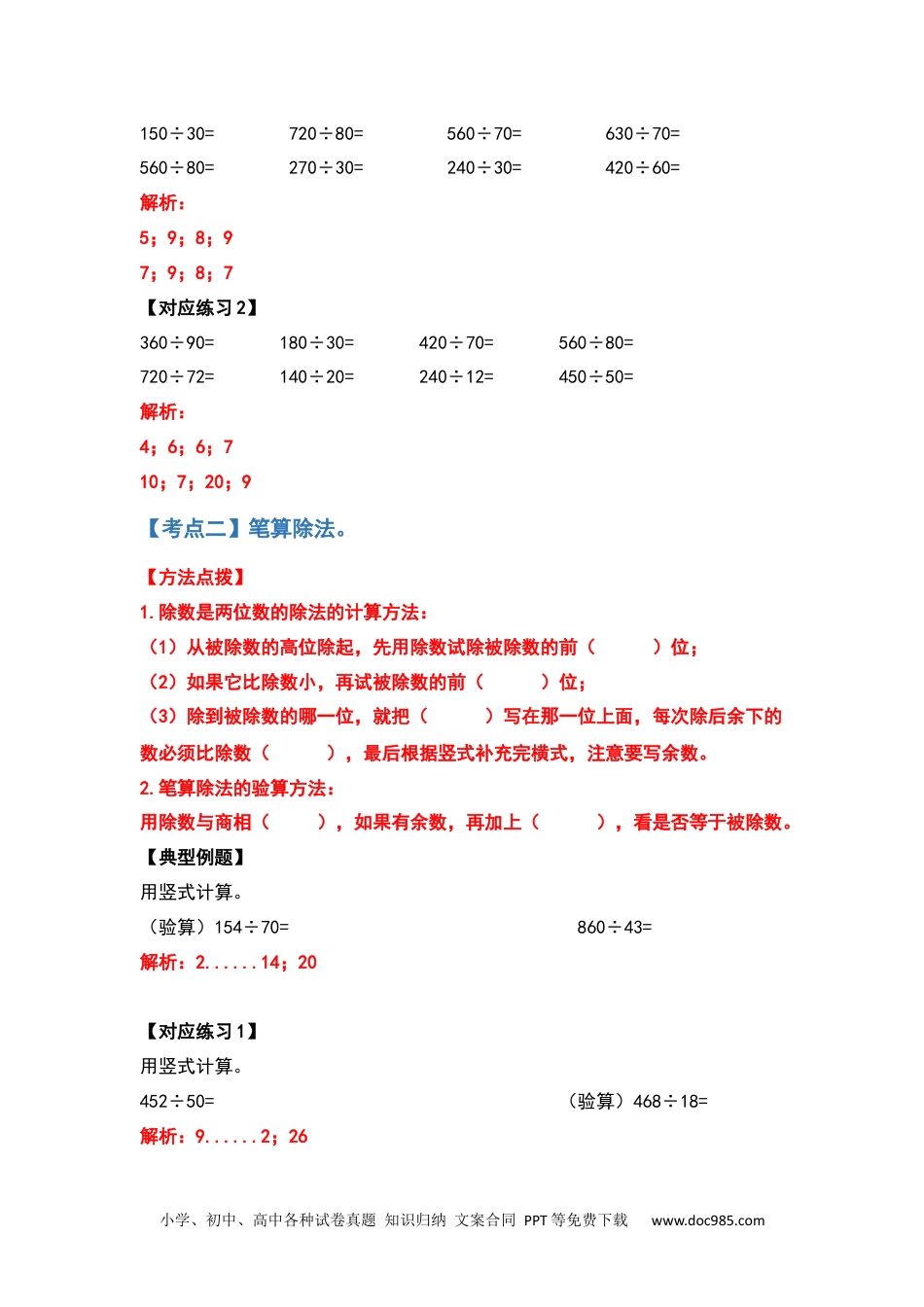 小学、初中、高中各种试卷真题知识归纳文案合同PPT等免费下载www.doc985.com四年级数学上册典型例题系列之第六单元除数是两位数的除法计算题部分(解析版)编者的话:《四年级数学上册典型例题系列》是基于教材知识点和常年考点考题总结和编辑而成的,其优点在于选题典型,考点丰富,变式多样。本专题是第六单元除数是两位数的除法计算题部分,后续内容为《第六单元除数是两位数的除法应用题部分》。本部分内容主要是以除法的竖式计算方法和与商有关的规律为基础出题,考试多以计算、填空、选择为主,难度较小,考题典型,共分为十个考点,欢迎使用。小学、初中、高中各种试卷真题知识归纳文案合同PPT等免费下载www.doc985.com【考点一】口算除法。【方法点拨】①整十数除整十数或几百几十数的口算,可以想乘法算除法,也可以先去掉被除数和除数末尾相同个数的0,再计算。例如:160÷20想乘法算除法:20×8=160,所以160÷20=8。②把160和20末尾的0各去掉一个,相当于算16÷2=8,所以160÷20=8。【典型例题】1.480里面有()个80,所以480÷80=();320是40的()倍,所以320÷40=()。2.在计算560÷20时,先把被除数和除数同时去掉()个0,再计算()÷()=()。解析:1.6;6;8;82.1;56;2;28【对应练习1】口算。小学、初中、高中各种试卷真题知识归纳文案合同PPT等免费下载www.doc985.com150÷30=720÷80=560÷70=630÷70=560÷80=270÷30=240÷30=420÷60=解析:5;9;8;97;9;8;7【对应练习2】360÷90=180÷30=420÷70=560÷80=720÷72=140÷20=240÷12=450÷50=解析:4;6;6;710;7;20;9【考点二】笔算除法。【方法点拨】1.除数是两位数的除法的计算方法:(1)从被除数的高位除起,先用除数试除被除数的前()位;(2)如果它比除数小,再试被除数的前()位;(3)除到被除数的哪一位,就把()写在那一位上面,每次除后余下的数必须比除数(),最后根据竖式补充完横式,注意要写余数。2.笔算除法的验算方法:用除数与商相(),如果有余数,再加上(),看是否等于被除数。【典型例题】用竖式计算。(验算)154÷70=860÷43=解析:2......14;20【对应练习1】用竖式计算。452÷50=(验算)468÷18=解析:9......2;26小学、初中、高中各种试卷真题知识归纳文案合同PPT等免费下载www.doc985.com【对应练习2】用竖式计算。989÷43=(验算)648÷16=解析:23;40......8【对应练习3】用竖式计算。364÷52=(验算)858÷28=解析:7;30......18【考点三】试商。【方法点拨】试商的方法:在计算除数是两位数的除法时,一般按照“四舍五入”法把除数看作和它接近的整十数来试商,其中用“四舍”法把除数看作整十数来试商,商容易偏大;用“五入”法把除数看作整十数来试商,商容易偏小。【典型例题】计算239÷78时,把78看做()来试商,商是(),会偏(),所以要把商调整为()。解析:80;2;小;3【对应练习1】计算547÷63时,把63看作()来试商,商是(),会偏(),所以要把商调整为()。解析:60;9;大;8【对应练习2】计算814÷19时,把19看作()来试商,商是(),会偏(),所以要把商调整为()。解析:20;40;小;41;42小学、初中、高中各种试卷真题知识归纳文案合同PPT等免费下载www.doc985.com【对应练习3】3.637÷78,笔算时,把除数看作()试商,商是(),会偏(),所以要把商调整为()。解析:80;7;小;8【对应练习4】在算式653÷92中,把92看作90来试商时,会出现()。A.初商偏大B.初商偏小C.初商正好D.无法确定解析:B【对应练习5】判断题:试商时运用“四舍”法,商易小;运用“五入”法,商易大。()解析:错误【对应练习6】在□÷64的试商中,把64看做60来试商,初商可能会();在252÷36中把36看作40来试商时,初商可能会()。(填偏大、偏小)解析:偏大;偏小【对应练习7】在计算197÷28时,把除数28看作30来试商,初商会()(填“偏大”或“偏小”),所以把商改为()。解析:偏小;7【考点四】估算。【方法点拨】根据被除数和除数的特点,先把不是整十数或几百几十的数看成与它接近的整小学、初中、高中各种试卷真...
