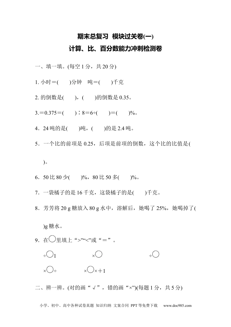 小学、初中、高中各种试卷真题知识归纳文案合同PPT等免费下载www.doc985.com期末总复习模块过关卷(一)计算、比、百分数能力冲刺检测卷一、填一填。(每空1分,共20分)1.小时=()分钟吨=()千克2.的倒数是(),()的倒数是0.35。3.=0.375=()∶8=6÷()=()%。4.24吨的是()吨,()的是2.4吨。5.一个比的前项是0.25,后项是前项的倒数,这个比的比值是()。6.50比80少()%,80比50多()%。7.一袋橘子的是16千克,这袋橘子的是()千克。8.芳芳将20g糖放入80g水中,溶解后,她喝了25%,她喝掉了()g糖水。9.在里填上“>”“<”或“=”。÷1×÷×÷××+1二、辨一辨。(对的画“√”,错的画“×”)(每题1分,共5分)小学、初中、高中各种试卷真题知识归纳文案合同PPT等免费下载www.doc985.com1.百分数一定都小于1。()2.自然数(0除外)的倒数都小于它本身。()3.某班女生人数与男生人数的比是2∶3,则女生人数占全班人数的。()4.一个非零数乘真分数的积一定小于这个数除以真分数的商。()5.小明从家到学校用16分钟,小丽从家到学校用20分钟,小明和小丽的速度比是5∶4。()三、选一选。(把正确答案的字母填在括号里)(每题1分,共5分)1.m为一个非零自然数,在下面的算式中,()的得数最大。A.m×B.m÷C.m×D.m÷2.一个比的比值是2.25,将这个比化成最简单的整数比是()。A.2.25∶1B.9∶4C.4∶9D.93.把千克糖平均分成3份,每份是1千克的()。A.B.C.4.a,b是两个不为0的数,如果a×=b×,那么()。小学、初中、高中各种试卷真题知识归纳文案合同PPT等免费下载www.doc985.comA.a<bB.a=bC.a>bD.无法确定5.甲、乙两数的比是3∶2,乙数是60,甲数是()。A.90B.48C.45D.24四、计算挑战。(共44分)1.直接写出得数。(每题1分,共12分)×=+=12÷=2.4×=2.6-=1÷25%=8÷=20%×7=-×50%=×49×=×÷×=×÷÷=2.求下列各比的比值。(每题2分,共6分)0.75∶3.75∶20%∶3.化简下列各比。(每题2分,共6分)0.5a∶0.3a小时∶20分钟45∶小学、初中、高中各种试卷真题知识归纳文案合同PPT等免费下载www.doc985.com4.下面各题怎样算简便就怎样算。(每题3分,共12分)+++0.75÷×+1÷÷×5.解方程。(每题2分,共8分)120+x=168-3x=小学、初中、高中各种试卷真题知识归纳文案合同PPT等免费下载www.doc985.comx+15%x=3.225.6÷70%x=5%五、看图列式计算。(每题3分,共6分)1.2.小学、初中、高中各种试卷真题知识归纳文案合同PPT等免费下载www.doc985.com六、解决问题。(每题5分,共20分)1.一个篮球的价钱是120元,一个排球的价钱是一个篮球的,是一个足球的。一个足球多少钱?2.春节,丽丽买了一双手套和一条围巾送给奶奶,共用去48元。一条围巾的价格是一双手套的。一双手套和一条围巾各多少元?3.某天,叔叔先骑了一小时后,小明才从对面出发。叔叔还要骑多少小时,才能和小明相遇?小学、初中、高中各种试卷真题知识归纳文案合同PPT等免费下载www.doc985.com4.李阿姨这次住院医疗费共计8000元,需要自己承担的医疗费是多少元?小学、初中、高中各种试卷真题知识归纳文案合同PPT等免费下载www.doc985.com答案一、1.286252.3.931637.54.87.25.6.37.5607.258.259.>>>><二、1.×2.×3.√4.√5.×三、1.B2.B3.B4.C5.A四、1.181.81.74201.412.0.75∶3.75=0.2∶=×=20%∶=×=3.0.5a∶0.3a=0.5∶0.3小学、初中、高中各种试卷真题知识归纳文案合同PPT等免费下载www.doc985.com=5∶3小时∶20分钟=12∶20=3∶545∶=(45×50)∶=250∶34.+++0.75=+=2÷=÷(1.6+1.6)=÷3.2=÷=点拨:形如a÷(b-c+d)的不能简算,只能先算出括号内的结果。×+1÷小学、初中、高中各种试卷真题知识归纳文案合同PPT等免费下载www.doc985.com=×+=×=÷×=÷×=×12×=5.120+x=168解:x=168-120x=48x=48×x=60-3x=解:3x=-3x=x=×x=小学、初中、高中各种试卷真题知识归纳文案合同PPT等免费下载www.doc985.comx+15%x=3.22解:1.15x=3.22x=3.22÷1.15x=2.85.6÷70%x=5%解:5.6÷0.7x=0.050.7x=5.6÷0.050.7x=112x=112÷0.7x=160五、1.24÷=40(人)2.60×=75(本)六、1.120×÷=120××=80(元)2.手套:48÷=18(元)围巾:48-18=30(元)小学、初中、高中各种试卷真题知识归纳文案合同PPT等免费下载www.doc985.com或18×=30(元)点拨:先求出单位“1”的量。3.÷=÷=1(小时)4.300+(8000-300)×(1-70%)=300+7700×0.3=2610(元)