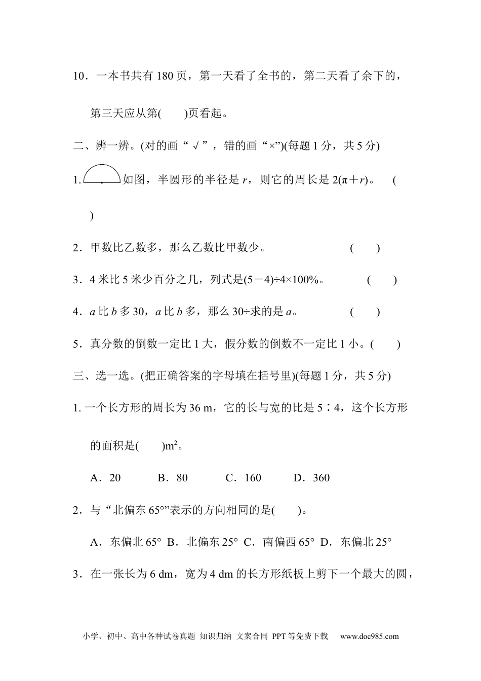 小学、初中、高中各种试卷真题知识归纳文案合同PPT等免费下载www.doc985.com期末总复习模块过关卷(四)常考、易错题能力冲刺检测卷一、填一填。(每题2分,共20分)1.小时的是()分钟,比50t多是()t。2.()kg增加它的后是27kg,()km比40km少。3.2∶0.5的比值是(),把t∶200kg化成最简单的整数比是()。4.一个圆的半径扩大到原来的3倍,周长扩大到原来的()倍,面积扩大到原来的()倍。5.9∶()==0.375=6÷()=()%。6.把0.67、、66.7%、按从小到大的顺序排列:()。7.5∶9中的前项加15,要使比值不变,比的后项应加上()。8.右图中,r2=81,圆的面积是(),它的周长是()。9.六年级同学植树150棵,有6棵没有成活,成活率是()。小学、初中、高中各种试卷真题知识归纳文案合同PPT等免费下载www.doc985.com10.一本书共有180页,第一天看了全书的,第二天看了余下的,第三天应从第()页看起。二、辨一辨。(对的画“√”,错的画“×”)(每题1分,共5分)1.如图,半圆形的半径是r,则它的周长是2(π+r)。()2.甲数比乙数多,那么乙数比甲数少。()3.4米比5米少百分之几,列式是(5-4)÷4×100%。()4.a比b多30,a比b多,那么30÷求的是a。()5.真分数的倒数一定比1大,假分数的倒数不一定比1小。()三、选一选。(把正确答案的字母填在括号里)(每题1分,共5分)1.一个长方形的周长为36m,它的长与宽的比是5∶4,这个长方形的面积是()m2。A.20B.80C.160D.3602.与“北偏东65°”表示的方向相同的是()。A.东偏北65°B.北偏东25°C.南偏西65°D.东偏北25°3.在一张长为6dm,宽为4dm的长方形纸板上剪下一个最大的圆,小学、初中、高中各种试卷真题知识归纳文案合同PPT等免费下载www.doc985.com所剪的圆的面积是()dm2。A.12.56B.28.26C.50.24D.113.044.20g盐水中有2g盐,那么盐和水的质量比是()。A.1∶8B.1∶9C.1∶10D.1∶115.两根铁丝长都为2m,从第一根上截去它的,从第二根上截去m,余下的部分相比较,()。A.第一根长B.第二根长C.同样长D.无法判断四、计算挑战。(共40分)1.口算。(每题1分,共8分)×=0.64×=9÷=×÷×=÷=0.125÷=1÷25%=÷×÷=2.怎样算简便就怎样算。(每题3分,共12分)2×9×24÷××0.75×4.2小学、初中、高中各种试卷真题知识归纳文案合同PPT等免费下载www.doc985.com3.解方程。(每题3分,共6分)(1-20%)x=92x-x=254.计算下面各图中阴影部分的面积。(每题4分,共8分)5.妙算正方形的个数。(6分)(1)完成上面的填空。(2)照这样画下去,第6个图形有多少个正方形?小学、初中、高中各种试卷真题知识归纳文案合同PPT等免费下载www.doc985.com五、解决问题。(每题5分,共30分)1.六年级三个班的同学一起做彩旗,(1)班同学做了40面,(2)班同学做的是(1)班同学的,且比(3)班多,(3)班同学做了多少面彩旗?2.某部队进行野战训练,连夜行军,走了全程的,离中点还有10km,全程需走多少千米?3.丽丽新家客厅的茶几面是圆形的,它的半径是40cm。茶几的面积比方垫的面积大多少平方厘米?小学、初中、高中各种试卷真题知识归纳文案合同PPT等免费下载www.doc985.com4.如图是公园中的一个花瓣形状的门洞,这个门洞由4个直径相等的半圆组成。它的周长和面积各是多少?5.打字员用3天录入一份稿件,第一天录入全部的40%,第二天录入余下的50%,第三天录入60页。这份稿件一共有多少页?6.广告绘画师用黑色和红色涂料调配出棕色涂料,已知黑色涂料比红色的多200g,黑色涂料和红色涂料的配比是7∶3。黑色和红色涂料各用了多少克?小学、初中、高中各种试卷真题知识归纳文案合同PPT等免费下载www.doc985.com答案一、1.862.52.21303.47∶24.395.24121637.56.<66.7%<0.67<7.278.254.3456.529.96%10.61点拨:第三天应从第(两天共看的页数+1)页看起。二、1.×2.√3.×4.×5.√三、1.B2.D3.A4.B5.B四、1.0.4271412.2×9×=2×9×+2×9×=9+2=11点拨:形如a×b×,要把a×b看作一个整体,“分配”给括号内的每个数。小学、初中、高中各种试卷真题知识归纳文案合同PPT等免费下载www.doc985.com24÷=24÷=57.6点拨:形如a÷(b+c)的不能用乘法...