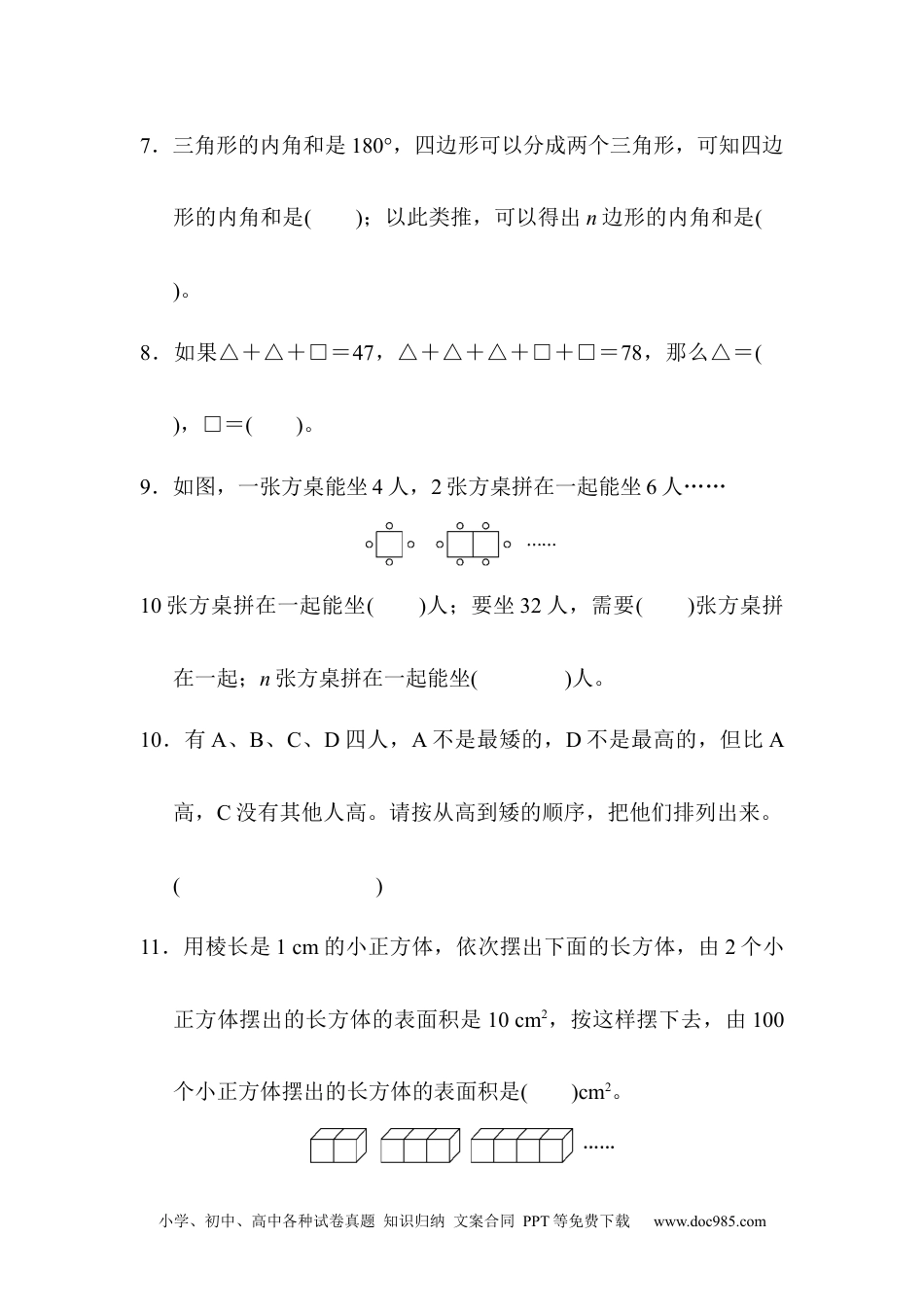小学、初中、高中各种试卷真题知识归纳文案合同PPT等免费下载www.doc985.com卷总复习测试(四)一、填空题。(每题3分,共36分)1.按规律填数。(1)1、4、9、16、()、()……(2)1、1、2、3、5、()、()、21、34……2.同一平面内,不在同一条直线上的4个点可以连()条线段,10个点可以连()条线段。3.有11个乒乓球,其中有一个是次品,比其他球要轻一些,用天平至少称()次可以保证找出次品。4.一条直线上有A、B、C、D、E、F、G七个点,以这些点为端点的线段共有()条。5.用100个图形按照一定规律排列如下:……第100个图形是(),其中△共有()个。6.张老师打电话通知舞蹈队的16名队员到校排练。如果每分钟通知1人,接到电话的人马上又通知其他的人,至少用时()分钟。小学、初中、高中各种试卷真题知识归纳文案合同PPT等免费下载www.doc985.com7.三角形的内角和是180°,四边形可以分成两个三角形,可知四边形的内角和是();以此类推,可以得出n边形的内角和是()。8.如果△+△+□=47,△+△+△+□+□=78,那么△=(),□=()。9.如图,一张方桌能坐4人,2张方桌拼在一起能坐6人……10张方桌拼在一起能坐()人;要坐32人,需要()张方桌拼在一起;n张方桌拼在一起能坐()人。10.有A、B、C、D四人,A不是最矮的,D不是最高的,但比A高,C没有其他人高。请按从高到矮的顺序,把他们排列出来。()11.用棱长是1cm的小正方体,依次摆出下面的长方体,由2个小正方体摆出的长方体的表面积是10cm2,按这样摆下去,由100个小正方体摆出的长方体的表面积是()cm2。小学、初中、高中各种试卷真题知识归纳文案合同PPT等免费下载www.doc985.com12.某城际客运汽车行驶于A、B、C三个城市之间,汽车站应准备()种不同的车票。二、选择题。(每题2分,共20分)1.A、B、C、D四位同学排成一排照相,B与C要求站在一起,一共有()种不同的站法。A.3B.6C.8D.122.右图中共有()个角。A.5B.6C.15D.213.用一只平底锅烙饼,每次最多只能烙2张。如果烙一张饼要2分钟(正、反两面各1分钟),那么烙3张饼至少需要()分钟。A.2B.3C.6D.154.右图中共有()个三角形。小学、初中、高中各种试卷真题知识归纳文案合同PPT等免费下载www.doc985.comA.16B.22C.26D.275.老师要从4名女生、3名男生中各选一人担任节目主持人,共有()种不同的选择方案。A.4B.6C.7D.126.如图,搭1间房子要5根小棒,搭2间房子要9根小棒,搭3间房子要13根小棒……搭20间房子要()根小棒。A.80B.81C.90D.1007.小敏星期天想帮妈妈做下面的事情:用洗衣机洗衣服(20分钟),扫地(6分钟),擦家具(10分钟),晾衣服(5分钟)。经过合理安排,她做完这些事情至少要用()。A.20分钟B.25分钟C.30分钟D.36分钟小学、初中、高中各种试卷真题知识归纳文案合同PPT等免费下载www.doc985.com8.一座大楼共15层,每两层间的楼梯阶数都相同。已知A上楼的速度比B快一倍,两人都从第一层开始上,当B到达第6层时,A在第()层。A.9B.10C.11D.129.图中共有()个长方形。A.16B.17C.18D.2010.有A、B、C、D、E五个同学进行乒乓球比赛,每两人比赛一场,已知A赛4场,B赛3场,C赛2场,D赛1场,那么E赛()场。A.1B.2C.3D.4三、解决问题。(1~4题每题5分,其余每题6分,共44分)1.先仔细观察下列各图中正方形与直角三角形的个数之间有什么关系,再把下表填写完整。小学、初中、高中各种试卷真题知识归纳文案合同PPT等免费下载www.doc985.com正方形的个数1234…10…n直角三角形的个数048……2.婷婷有10元、20元、50元的人民币各2张,她可以付多少种不同价格的货款?3.某市出租车收费标准如下表:里程收费/元3km以内83km以上到8km以下,每增加1km28km以上,每增加1km3于晴准备乘出租车外出,已知行程是10km,她要付多少元车费?小学、初中、高中各种试卷真题知识归纳文案合同PPT等免费下载www.doc985.com4.如图,D是BC延长线上一点,你能推出∠1=∠2+∠3吗?5.甲、乙、丙、丁四人同时参加校运动会的100米赛跑,分别获一、二、三、四名。赛后,他们是这样说的:甲:丙是第一名,我是第三名;乙:我是第一名,丁是第四名;丙:丁是第二名,我是...