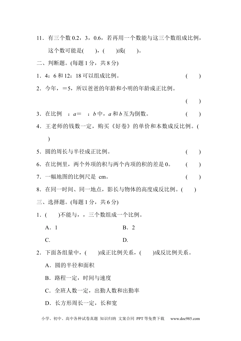 小学、初中、高中各种试卷真题知识归纳文案合同PPT等免费下载www.doc985.com第四单元达标测试卷一、填空题。(每空1分,共24分)1.():20=0.5÷()=:==()%2.在30的因数中选4个数组成一个比例,可以是()。3.一个长方形精密零件的长为5mm,宽为3.2mm,在一幅图纸上这个零件的长为10cm,那么这幅图纸的比例尺是(),在这幅图纸上这个零件的宽是()cm。4.一个长4dm,宽2.5dm的长方形,按21放大,放大后图形的面积是()dm2。5.是()比例尺,它表示实际距离相当于图上距离的()倍,用数值比例尺表示是(),在这幅地图上,量得A、B两地相距2.5厘米,则A、B两地间的实际距离是()km。6.在一个比例中,两个内项的积是最小的质数,已知一个外项是,另一个外项是()。7.如果3.6a=b,则a与b成()比例;小明的身高和体重()比例,长方体的体积一定,底面积和高成()比例。8.如果3a=5b(a≠0,b≠0),那么ab=()()。9.大小两个正方形,边长的比是23,周长的比是(),面积的比是()。10.在比例35:10=21:6中,如果将第一个比的后项增加30,第二个比的后项应加上()才能使该比例成立。小学、初中、高中各种试卷真题知识归纳文案合同PPT等免费下载www.doc985.com11.有三个数0.2,3,0.6,若再用一个数能与这三个数组成比例,这个数可能是(),()或()。二、判断题。(每题1分,共8分)1.4:6和12:18可以组成比例。()2.今年,=5,所以爸爸的年龄和小明的年龄成正比例。()3.在比例:a=:b中,a和b互为倒数。()4.王老师的钱数一定,购买《好卷》的单价和本数成反比例。()5.圆的周长与半径成正比例。()6.在比例里,两个外项的积与两个内项的积的差是0。()7.一幅地图的比例尺是cm。()8.在同一时间、同一地点,影长与物体的高度成反比例。()三、选择题。(每题1分,共6分)1.()不能与,,三个数组成一个比例。A.1B.2C.D.2.下面各组量中,()成正比例关系,()成反比例关系。A.圆的半径和面积B.路程一定,时间与速度C.全班人数一定,出勤人数和出勤率D.长方形周长一定,长和宽小学、初中、高中各种试卷真题知识归纳文案合同PPT等免费下载www.doc985.comE.树苗的成活率一定,成活的树苗和树苗总数F.圆柱的侧面积一定,底面直径和高3.已知x的等于y的(x≠0,y≠0),则x:y等于()。A.920B.45C.54D.2094.下面图()表示的是成正比例关系的图象。5.君合小区的草坪长120m,宽80m,把它的平面图画在作业本上,选用比例尺()比较合适。A.B.C.D.6.比例尺1001,它表示()A.图上距离是实际距离的B.实际距离是图上距离的C.图上距离100cm,实际距离是1mD.实际距离1cm,图上距离是100m四、解比例。(12分)x:0.4=0.3:0.820:x=:小学、初中、高中各种试卷真题知识归纳文案合同PPT等免费下载www.doc985.com=(3.5-x):7=0.4:1.4五、动手操作。(每题5分,共10分)1.小明家在学校正西方向,距学校200m;小亮家在学校正东方向,距学校400m;小红家在学校正北方向,距学校250m。在下图中画出他们三家和学校的位置平面图(比例尺110000)2.按要求画图。画出A按21放大后的图形;画出B按13缩小后的图形。小学、初中、高中各种试卷真题知识归纳文案合同PPT等免费下载www.doc985.com六、一根木料锯成4段要24分钟,照这样计算,把这根木料锯成8段,要用多少分钟?(5分)七、用方砖给一间教室铺地。如果用边长为4分米的方砖,需要500块;如果改用边长为8分米的方砖来铺,需要多少块?(5分)八、解决问题。(每题5分,共30分)1.六年级同学在植树节参加“爱绿护绿”植物活动,原计划40人去栽,每人要栽15棵;实际增加10人去栽,每人可以少栽多少棵?2.童星玩具厂要生产1200辆玩具汽车,前4天生产了240辆,照这样计算,生产完剩下的玩具汽车,还需多少天?小学、初中、高中各种试卷真题知识归纳文案合同PPT等免费下载www.doc985.com3.(变式题)在一幅比例尺是13000000的地图上,量得某地到北京的铁路线长12cm,在另一幅比例尺是14000000的地图上,某地到北京的铁路线长多少厘米?4.在比例尺是15000000的地图上,量得A,B两地的距离是6厘米,甲、乙两辆汽车同时从A,B两地相向出发,2小...