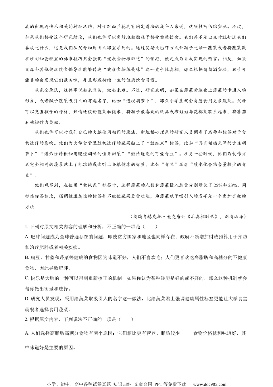 小学、初中、高中各种试卷真题知识归纳文案合同PPT等免费下载www.doc985.com高三语文一、现代文阅读(25分)(一)现代文阅读Ⅰ(本题共4小题,13分)阅读下面的文字,完成下面小题。世界各地的人们正在食用过多的错误食物,这为全球健康灾难打下了基础。超过20亿人处于超重或肥胖状态。超过3.4亿的5~19岁的儿童和青少年超重或肥胖,占这一年龄群体全球人口的18%,而在1975年,这个比例只有4%。这不再是富裕世界的独有问题:超过1000万非洲儿童处于超重或肥胖状态。高达20%的全球医疗保健支出被用于肥胖问题,包括预防和治疗肥胖或者相关疾病,比如心脏病和二型糖尿病。政府预算正在像腰围一样危险地膨胀。这个无法回避的问题是高脂肪高糖分食物造成的。我们选择这类食物的一个原因在于,它们通常比更有营养、脂肪较少的食物便宜。另一个驱动力是味道:我们觉得这些食物比扁豆、甘蓝和芹菜更加可口。实际上,研究表明,我们不仅认为不健康的食物更加可口,而且更喜欢吃被我们认为不健康的食物。对抗肥胖最常见的策略是通过奖励或惩罚诱导我们回避可口的食物。父母将西兰花隐藏在意面酱中,或者承诺提供甜食奖励,以便让孩子摄入西兰花。这些策略似乎都不太奏效。虽然每年有数十亿美元被用在饮食计划、替代食品和泻药上,但是肥胖率仍然在持续上升。更加成功的方法是改变我们对于低糖低脂营养食物的看法。我们需要让好东西产生吸引力。一系列迷人的实验展示了人类大脑在受到合适激励时多么容易改变品味。研究人员让被试者品尝两杯相同的葡萄酒,并且宣称两个杯子里装的是价格不同的产品。被试者表示,在饮用他们所认为更加昂贵的葡萄酒时,他们感到更加快乐。这不是想象的作用。当他们在功能性磁共振扫描仪中进行同样的实验时,饮用他们所认为的昂贵葡萄酒的被试者大脑中与快乐体验相关的区域出现了更加活跃的神经活动。和“真实”艺术品的例子一样,他们的确更加享受这种味道。巧克力实验也得到了相同的结果。看起来,当我们拥有享受预期时,我们更容易享受某种事物。这一现象适用于从电影到啤酒的各种消费品,被称为“营销安慰剂效应”。这是因为,从生物学上说,快乐本身不是目的,而是一种机制,是为了劝说我们追求对进化有用的目标。这种机制可以得到重新校正。“大脑之所以提供快乐,是因为它可以让人知道哪些活动应该重复、哪些活动应该回避,要想做出良好的决策,你需要对经历质量做出良好的衡量,”葡萄酒研究的参与者之一安东尼奥·兰格尔说,“作为改进这种衡量的途径,将关于经历的其他信息来源添加进来是合理的。特别地,如果你在认知上确信某种经历是好的,那么将其添加到你目前对于快乐的衡量之中就是合理的。”此时,较高的标价会使人相信,他们将会品尝到美味的葡萄酒——于是,他们真的品尝到了美味的葡萄酒。这意味着如果你能说服自己相信西兰花很好吃,你就会发现西兰花真的很好吃,你的前额叶皮层也会小学、初中、高中各种试卷真题知识归纳文案合同PPT等免费下载www.doc985.com真的出现与快乐相关的神经活动。对于对西兰花具有固定看法的成年人来说,这项技巧很难实施。不过,如果我们接受这个研究结论,我们也许可以更好地鼓励孩子接受健康饮食。我们并不是出生时就知道我们喜欢吃什么,这是我们从父母和周围人那里学到的。通过奖励或恐吓方式让孩子吃绿叶蔬菜或者将蔬菜藏在沙司和蛋糕里的标准技巧只会强化“健康食物很难吃”的预期,使之成为自我实现的预言。相反,如果父母和其他健康饮食倡导者能够传达“健康食物很美味”这一竞争性真相,那么根据葡萄酒实验,孩子可能真的会发现它们很美味,并且形成持续一生的健康饮食习惯。我完全承认,这件事说起来容易,做起来难。不过,研究表明,如果在蔬菜旁边画上蔬菜的卡通人物形象,或者赋予蔬菜吸引人的有趣名字,比如“透视胡萝卜”,那么小学生就会自愿食用更多蔬菜。父母可以充当孩子的榜样,热情地谈论菠菜和糙米,将孩子最喜欢的玩具或布娃娃与花椰菜联系起来,将蘑菇和核桃作为奖励。我们也许可以对我们自己的大脑使用相同的魔法。斯坦福心理系的研究人员调查了名称和标签对于食物选择的影响。他们为...