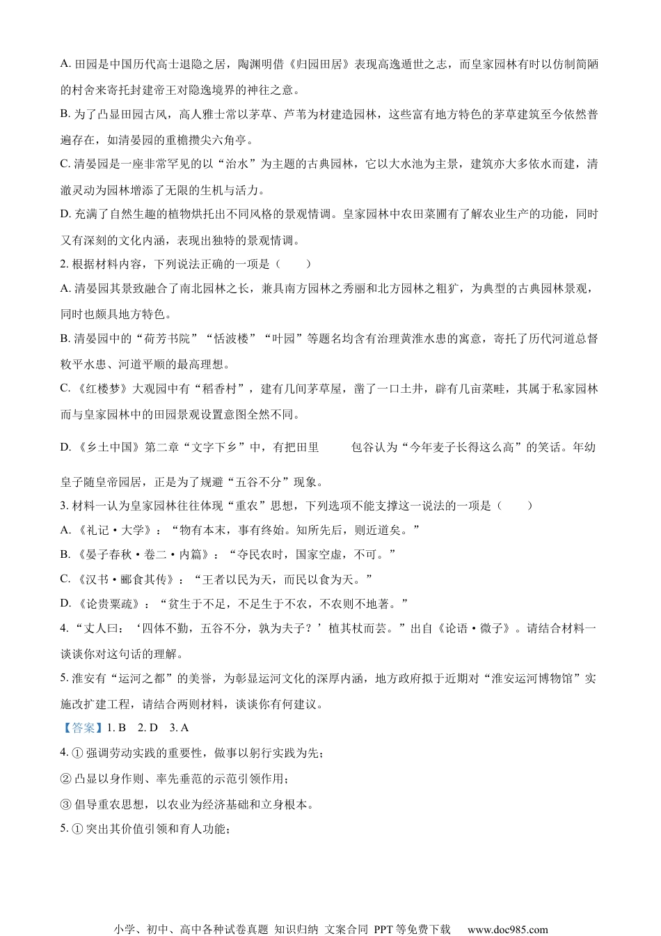 小学、初中、高中各种试卷真题知识归纳文案合同PPT等免费下载www.doc985.com江苏省淮阴中学2022-2023学年度第二学期阶段性考试高三语文试题2023.05一、现代文阅读(35分)(一)现代文阅读I(本题共5小题,17分)阅读下面的文字,完成下面小题。材料一:皇家园林中有一种景致主要以模仿农家田园村落风光为主题,清代对此类风光最为重视,在皇家园林中大加经营,算得上是古园林景观的集大成者。皇家园林中的田园景观充分体现了古代帝王的“重农”思想。古代中国一贯以农业为经济基础和立国根本,历代王朝多对农业高度重视,早在周代天子就有亲耕之礼。后世帝王在皇家园林设置农田菜圃,除了偶尔演耕之外,主要目的是为了“观稼”,就是通过御苑中的农田来观察庄稼的长势,具有类似试验田的性质,在一定程度上突破宫禁的限制,成为皇帝了解农业生产的一个重要窗口,同时也有寄托农业丰收愿望的含义。景观大多模仿简陋朴素的村舍,常常被看作是帝王崇尚节俭的美德的重要体理,同时也寄托了量高统治者对隐逸脱尘的人生境界的向往之意,含义非常复杂。皇家田园景观还有一个相对次要的功能,就是教育皇子。古代年幼的皇子一般随皇帝一起园居,从小灌输其重农思想,不至于长大后“五谷不分”。(摘编自贾瑞《中国皇家园林》)材料二:纵贯中国东部的京杭不但是一条沟通南北的大动脉,也是一条重要的文化线路,沿岸古城、古镇、古建筑密布。淮安就是大运河线路上的枢纽古城,至今仍保存着一座清晏园,是昔日江南河道总督署的西花园。雍正七年(1729年)朝廷在清江浦设立“江南河道总督”一职,置建总督署,使之成为全国最重要的治水衙门。西花园初名“淮园”,当时方塘荷花密布,香气远溢,池边有南亭和画舫斋等建筑,嵇曾筠作诗夸耀:“十亩莲塘澄晓镜,数枝枫叶敌春花。”乾隆初期担任河督的满族名臣高斌在园中新建厅堂亭榭,构成荷芳书院十六景,以迎接乾隆帝首次南巡。其中有两座碑亭分别存放康熙帝“澹泊宁静”“绩奏安澜”御碑,还有一座水榭临近垂柳依依的池岸,题为“藕花风漾钓鱼丝”。嘉庆年间,河督吴璥取“澹泊宁静”碑铭,改园名为“澹园”,后又取“河清海晏”之意改名为“清晏园”。小学、初中、高中各种试卷真题知识归纳文案合同PPT等免费下载www.doc985.com现存建筑大部分均为重建,但仍大致呈现出清末的历史格局。园门东向,入门即见一组湖石假山,石峰嶙峋,洞穴幽然。沿曲廊北转,过月亮门西折,为蕉吟馆,其西为大水池,形态近方,具有端庄稳重的气质。池北有五间歇山正厅,巍峨宏敞,即为荷芳书院。池中央立一座重檐攒尖六角亭,通过曲桥与东岸相接——此亭在道光年间一度以茅草覆顶,后改瓦顶。淮安地区河湖密布,盛产芦苇,古代贫民多以芦苇、茅草为材建造民居,后有官员在园林中以精致的手段进行仿造,称“淮屋”,别有异趣。清晏园继承了这一特点,使得这座地位显赫的总督署花园表现出强烈的文人草堂风味,可惜近现代以后这些富有地方特色的茅草建筑均已不存。书院西有紫藤花馆,内藏一株300年以上树龄的古藤。方池西岸建恬波楼,其南水面上有一座重建的清晏舫,再现了昔日画舫斋的神韵。方池南岸,堆叠大型黄石假山,山北临水建槐香楼,与书院、水心亭形成一条中轴线。园西的是关帝庙。庙南原有一所旧宅院,并入清晏园后,为了纪念叶挺将军而定名为“叶园”。园南原有一座路家花园,后来也与清晏园合并,在蜿蜒的河道边新建扇面亭、楼台建筑和曲折游廊。清晏园的性质是一座衙署花园,主要供历代总督驻节期间游憩赏玩,园主更迭频繁,与大家熟悉的皇家园林有很大差异。首先,这是一座非常早见的以“治水”为主题的古典因林。此园不同时期的名称以及匾额均含有治理黄淮水患的寓意——“澹园”“清晏”皆一语双关,既形容人品澹泊或天下太平,也形容风平浪静;“荷芳书院”既形容荷池之芬芳,又兼取“河防”的谐音:“恬波楼”表示“安澜平波”之意,都进一步体现“人定胜天”“力挽狂澜”的治水主题。中国古典园林中的匾额是凸显主题和渲染意境的重要手段,这些题名寄托了历代河道总督敉平水患、河道平顺的最高理想。从整体格局上看,清晏园具有疏朗旷达的特点,...