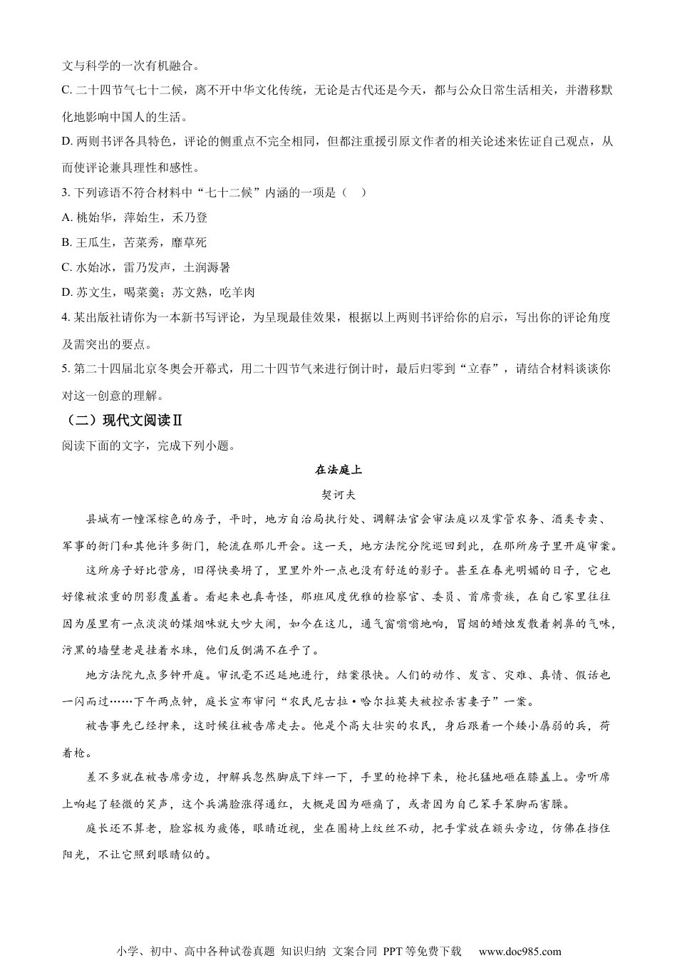 小学、初中、高中各种试卷真题知识归纳文案合同PPT等免费下载www.doc985.com2022届江苏省泰州市高三四模语文试题一、现代文阅读(一)现代文阅读I阅读下面的文字,完成下列小题。材料一:画家徐冬冬和新闻人徐立京,两个经历不同、专注领域各异的深耕者,在二十四节气七十二候的诗意生命美学追寻中,产生了强烈的共鸣,并化为厚积薄发的智慧表达。140余幅色彩浓烈、肌理独特的节候主题中国抽象画作,近80篇解读七十二候的细腻深沉的美文,以及与王蒙、丁一汇、薛其坤、陈来等文化、气象学、量子物理学、哲学不同领域大家的睿智对话,共同构成了《二十四节气七十二候》这一符号性的时代文化力作。二十四节气七十二候在中华文明史上究竟意味着什么?如果我们把视野投向宏阔深邃的史前史,可能会看得更为清晰。四大原生农耕文明起源地中,尼罗河流域、两河流域、印度河流域,“干、热、水、平、肥”齐全而率先起步并相互交流促进。一段辉煌灿烂之后,古印度河文明首先消失,古埃及文明和古两河文明也先后没落,环地中海大文明圈进入主导,以商业、海洋、农耕、游牧混合形态演化、演进。其人和先于地利,地利先于天时。而中国独处东方独特大地理单元,季风气候显著,气候复杂多样。二十四节气七十二候在广大而尽精微的长期农耕实践中,渐次成为中华文明的底色、基座与内核。二十四节气七十二候起于生存繁衍层面的“农事功用”,并逐步孕育衍生出家国凝聚层面的“文化认同”和个体感悟层面的“生命美学”。农事功用映照人与自然的关系,文化认同映照人与人的关系,生命美学映照人与自身的关系。在可见的未来,二十四节气七十二候的农事功用价值将持续削减,文化认同价值则会随着中国实力的增强而被反复提起并不断强化。中国申报二十四节气为人类非物质文化遗产成功,就是文化认同的标志性事件。生命美学价值与每个人的生命息息相关,历经十年打磨而成的《二十四节气七十二候》一书,正是生命美学价值拥抱一个大时代到来的显现。身处这个大时代,每个人都要面临两个发展悖论的挑战:恒温走廊之困和生物算法之危。先说“恒温走廊之困”。进入21世纪,人的生活圈逐步进入由住宅、汽车、火车、飞机、宾馆、商圈组成的“恒温走廊”。肉体对四季变化的直接感知被一再物理性弱化。只有智能传媒推送的头条文章时不时提醒,节气又变了。二十四节气由此成为当代社会联系个体与宇宙自然最紧密的文化纽带。正如徐立京所言:“站在21世纪大都市的建筑丛林中,即便只是看到人行道上普通的绿化树,我都开始读懂这一枝一叶在每一候每一季里的变化,以及它们和浩瀚宇宙的联系。”再说“生物算法之危”。赫拉利在《未来简史》中第一次提出每个生命体本质上就是算法这样令人沮丧但绝非耸人听闻的观点。如何避免沦为整体文明进步下的数据肉身,二十四节气成为极好的生命美学的小学、初中、高中各种试卷真题知识归纳文案合同PPT等免费下载www.doc985.com载体和切入点。徐冬冬在“创作谈”里写道:“从每时、每日、每候的阴阳两气交合变化,感悟宇宙世界之变,悟道万物生命之心,带来《二十四节气七十二候》对灵魂的独白,达于对生命本质的表达。”徐立京在自序中写道:“追寻二十四节气七十二候的脚步,去体会天地之变、四季之变、生命之变,每天都变得不一样了。”这是两位作者的深切体悟,也是大时代的优美韵律。(摘编自王岸柳《生命美学诗意观止》)材料二:《二十四节气七十二候》普及了节气、物候等相关知识。大多数人对二十四节气比较熟悉,而七十二候或许了解不多。它是古代指导农事活动的历法补充,是根据黄河流域地理、气候的自然现象编写而成。如果说二十四节气是以大观小,从季候、农事、风俗等大变化来认识具体的事物与现象,那么七十二候则是以小见大,在大千世界中精选那些最生动、最鲜明的自然对象,总结出节气演变的规律。无论是何种角度,节气、物候都体现了中国人对天地和生命的热爱,这正是贯穿本书的线索。作者徐立京在自序中写道:“把自己放进大自然中,问天,问地,问春夏秋冬,更问自己的内心。”于是,我们读到了兼具理性和感性的节气科普内容。作者以“万物含新意”开题:“作为二...