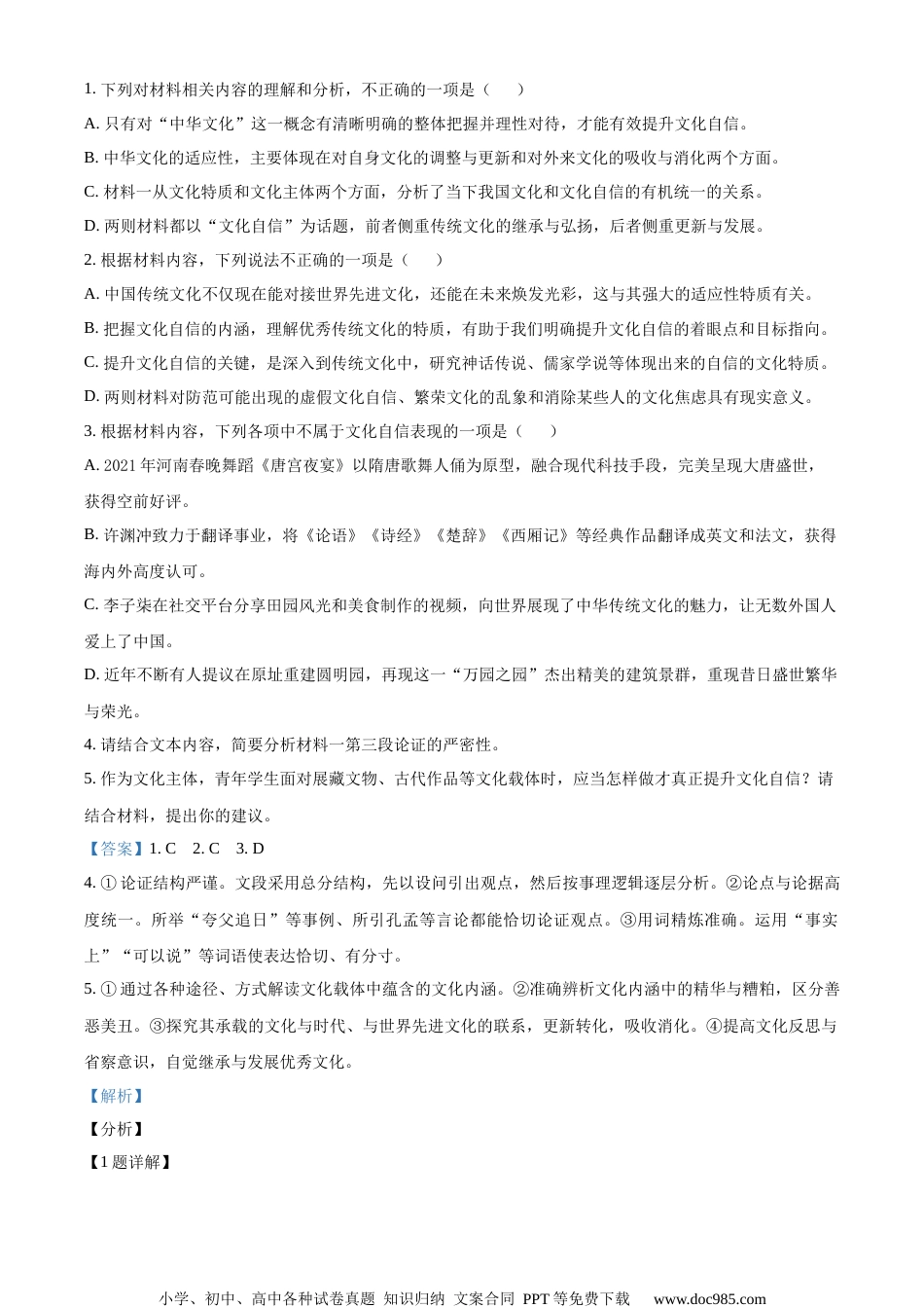 小学、初中、高中各种试卷真题知识归纳文案合同PPT等免费下载www.doc985.com迎南通二模综合练习(二)一、现代文阅读(35分)(一)现代文阅读Ⅰ(本题共5小题,19分)阅读下面的文字,完成下面小题。材料一:所谓文化,通常是指一个民族的整体生活方式和它的价值系统。而文化自信则是指一个民族基于对自己民族文化的积极肯定、自觉珍惜而形成的一种对其坚守、传承和发扬光大的文化心理和行为取向。文化自信就其内涵而言,包含两重含义:一是作为一种文化类型自身所具有的文化特质,二是作为这种文化类型的文化主体的文化性格。这就是说,文化自信是一种文化类型的精神特质和文化主体的担当性格的有机统一。当然,作为统一的中华文化,它是一个有机整体,是同一种文化类型在特定的社会历史条件下合规律性发展的文化之链,但是它又存在着传统与现代、历史与当下、客体与主体的不同方面、不同内容和不同性质的区分。因此,我们要增强和提升文化自信就必须对这一概念有一个清晰明确的整体把握和理性对待。否则,就可能在所谓文化自信、繁荣文化的旗号下造成混乱。那么,继承与弘扬我们民族的优秀传统文化能不能重建我们的文化自信呢?这涉及我们民族的优秀传统文化作为一种独特的文化类型,它自身的文化特质问题。事实上,我们民族文化的一个显著的特质就是“自信”,它是一种具有高度自信精神的文化。中国传统文化在它最初萌生时的神话传说中,就是以自信、自强为精神特质的。人们所熟悉的“夸父追日”“精卫填海”“女娲补天”等等,不就充满了一种发奋而自信的精神吗?儒家学说的创始人孔子、孟子、荀子就把中国传统文化的自信精神理性化、理论化了。孔子说“我欲仁,斯仁至矣”,孟子说“如欲平治天下,当今之世,舍我其谁也”,荀子则提出了“制天命而用之”的命题,这些不正充满了一种一往无前的担当而自信的精神吗?宋儒张载提出的“为天地立心,为生民立命,为往圣继绝学,为万世开太平”,明清时期王夫之的“六经责我开生面”,顾炎武的“天下兴亡、匹夫有责”,以及林则徐的“苟利国家生死以,岂因祸福避趋之”,这些思想可以说是一脉相承,无不是充满了一种无畏而自信的精神。如果说增强和提升文化自信,我们的着眼点要放在坚定对我们民族优秀传统文化的自信上,那么它的落脚点和目标指向就应该放在培养和造就一代又一代具有文化自信的文化主体上。人是文化的主体,又是文化的创造者。离开了作为主体的人,就无所谓文化,而任何优秀的文化也只能是海市蜃楼。因此,培养和造就具有文化自信的文化主体才是我们要着实下功夫的关键所在。(摘编自唐凯麟《如何增强和提升文化自信》)材料二:小学、初中、高中各种试卷真题知识归纳文案合同PPT等免费下载www.doc985.com《解放日报》副刊《朝花周刊》记者就“中国文化自信”这一主题专访了原文化部长、作家王蒙,以下为访谈节选。朝花周刊:您为什么认为中国传统文化是一个必须面对的时代话题?王蒙:中国的文化传统是活的传统,是与现代世界接轨的传统,是以天下为己任的传统。我们的文化自信,包括了对自己文化更新转化、对外来文化吸收消化的能力,包括了适应全球大势、进行最佳选择与为我所用、不忘初心又谋求发展的能力。文化的高低分野,不仅代表着公民的个人素质,也可以从一个侧面彰显出一个国家和社会的文明程度,是一个国家软实力的体现。因此,不论有多么困难,我们必须面对这个时代课题。朝花周刊:中国传统文化到底是什么样的文化?它和世界先进文化可否对接?王蒙:中国文化有一种适应的能力,有一种变化发展的能力,既有自我保护的能力,又有所谓见贤思齐、见不贤而内自省的能力。也许,我们看到了中华文化的古老,甚至也看到了中华文化的不够用,但是我们还看到了中华文化的适应性,它有自我调整和自我更新的能力,有汲取和消化外来影响的能力。现在我们有了一种前所未有的对传统文化的热情。原因很简单,因为我们的国家有了巨大的发展,因为对国家前途已经有了自信,所以才有了文化自信。我们所说的文化自信,包括对传统文化中积极、优秀的方面的自信,包含了我们对自己发展模式的自信,也包含了我们对自己文化...