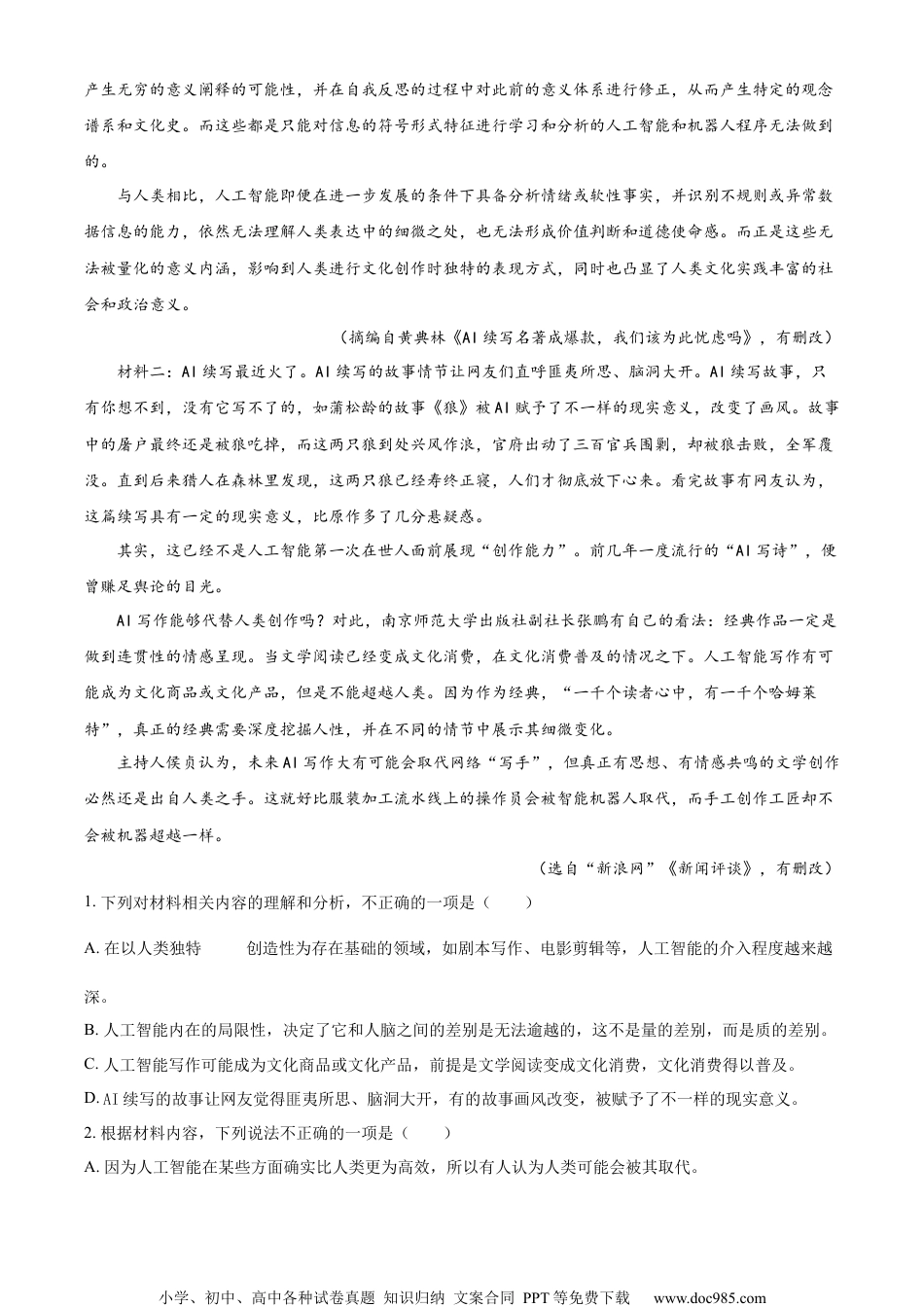 小学、初中、高中各种试卷真题知识归纳文案合同PPT等免费下载www.doc985.com常州市田家炳高级中学2022~2023年度高三三模考试语文2023.5.26一、现代文阅读(35分)(一)现代文阅读(本题共5小题,17分)阅读下面的文字,完成下面小题。材料一:近来人工智能(AI)续写经典小说,情节曲折却又颇有创意,在一些文化社区和视频网站引发热议。一时间,人类作家能否保住饭碗再次成为讨论话题。这种担忧并非文学创作领域所独有。在新闻业中,新闻算法程序或所谓的新闻写作机器人早已实现广泛应用。这些程序除了能撰写和发布新闻资讯外,还能基于用户的新闻信息消费行为特征,对后续新闻主题进行智能化筛选和推送,让新闻信息分发更加准确有效。自动新闻写作软件“叙事科学”(NarrativeScience)的开发者甚至认为,未来此类人工智能软件还将逐渐转移到“新闻产业链的上端”——解释性新闻。同样,在剧本写作、电影剪辑、音乐创作、艺术设计等超越纯粹重复劳动,以人类独特的创造性为存在基础的领域,人工智能的介入程度也越来越深。所有这一切,是否意味着人工智能终将取代人类,成为文化生产的主角?不可否认,人工智能在不少方面确实比人类要高效得多,但若仅据此就得出人类必将被其取代的结论,显然为时过早,无论人工智能多么接近人脑,其内在的局限性决定了两者之间的差别始终是一条无法逾越的鸿沟。而这绝不只是量的差别,更是质的差别。人工智能获得和人一样的自我意识,成为和人平起平坐的意识主体,甚至反过来控制人类,这样的场景基本上只存在于科幻电影的虚构剧情中。人工智能可以通过深度学习以及自然语言生成技术完成诗歌创作或小说续写,但这并不意味着机器的“思考”过程就等同于人类的思维过程,更不意味着人工智能算法机制生产出来的诗歌或新闻等文本产品,与人类生产出来的类似作品具有同等的创造性或文化特征。其根本原因在于,人工智能技术始终无法突破符号操控的层次,也就无法出现具有心灵和主体观念的机器。它无法像人类那样具有自我意识,从而可以制造出复杂的概念、价值和意义体系。尽管人工智能算法能对特定的结构化信息进行识别。甚至随着技术的进步,它可以对情绪、情感以及态度等相对复杂和模糊的信息进行甄别和定位,但人工智能在对这些信息进行处理的过程中自身并不会产生相应的复杂情绪和情感反应。它始终不会产生“自我”概念,对“自己”在做什么以及为什么要这么做进行解释,从而赋予自身的存在一种意义和价值。而人类意识的独特之处则在于,人类不仅知道自己在做什么,这样做的意义为何,而且对自身行为的意义进行阐释,将其与复杂的情感和社会语境相结合,从而小学、初中、高中各种试卷真题知识归纳文案合同PPT等免费下载www.doc985.com产生无穷的意义阐释的可能性,并在自我反思的过程中对此前的意义体系进行修正,从而产生特定的观念谱系和文化史。而这些都是只能对信息的符号形式特征进行学习和分析的人工智能和机器人程序无法做到的。与人类相比,人工智能即便在进一步发展的条件下具备分析情绪或软性事实,并识别不规则或异常数据信息的能力,依然无法理解人类表达中的细微之处,也无法形成价值判断和道德使命感。而正是这些无法被量化的意义内涵,影响到人类进行文化创作时独特的表现方式,同时也凸显了人类文化实践丰富的社会和政治意义。(摘编自黄典林《AI续写名著成爆款,我们该为此忧虑吗》,有删改)材料二:AI续写最近火了。AI续写的故事情节让网友们直呼匪夷所思、脑洞大开。AI续写故事,只有你想不到,没有它写不了的,如蒲松龄的故事《狼》被AI赋予了不一样的现实意义,改变了画风。故事中的屠户最终还是被狼吃掉,而这两只狼到处兴风作浪,官府出动了三百官兵围剿,却被狼击败,全军覆没。直到后来猎人在森林里发现,这两只狼已经寿终正寝,人们才彻底放下心来。看完故事有网友认为,这篇续写具有一定的现实意义,比原作多了几分悬疑惑。其实,这已经不是人工智能第一次在世人面前展现“创作能力”。前几年一度流行的“AI写诗”,便曾赚足舆论的目光。AI写作能够代替人类创作吗?对此,南京师范大学出版社副社长张鹏有自己的看法...
