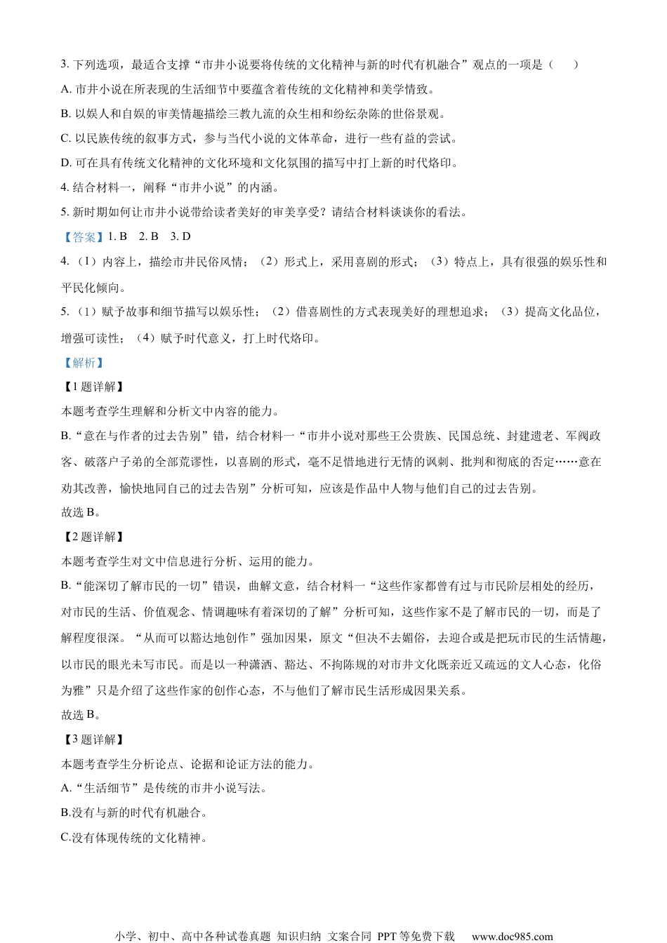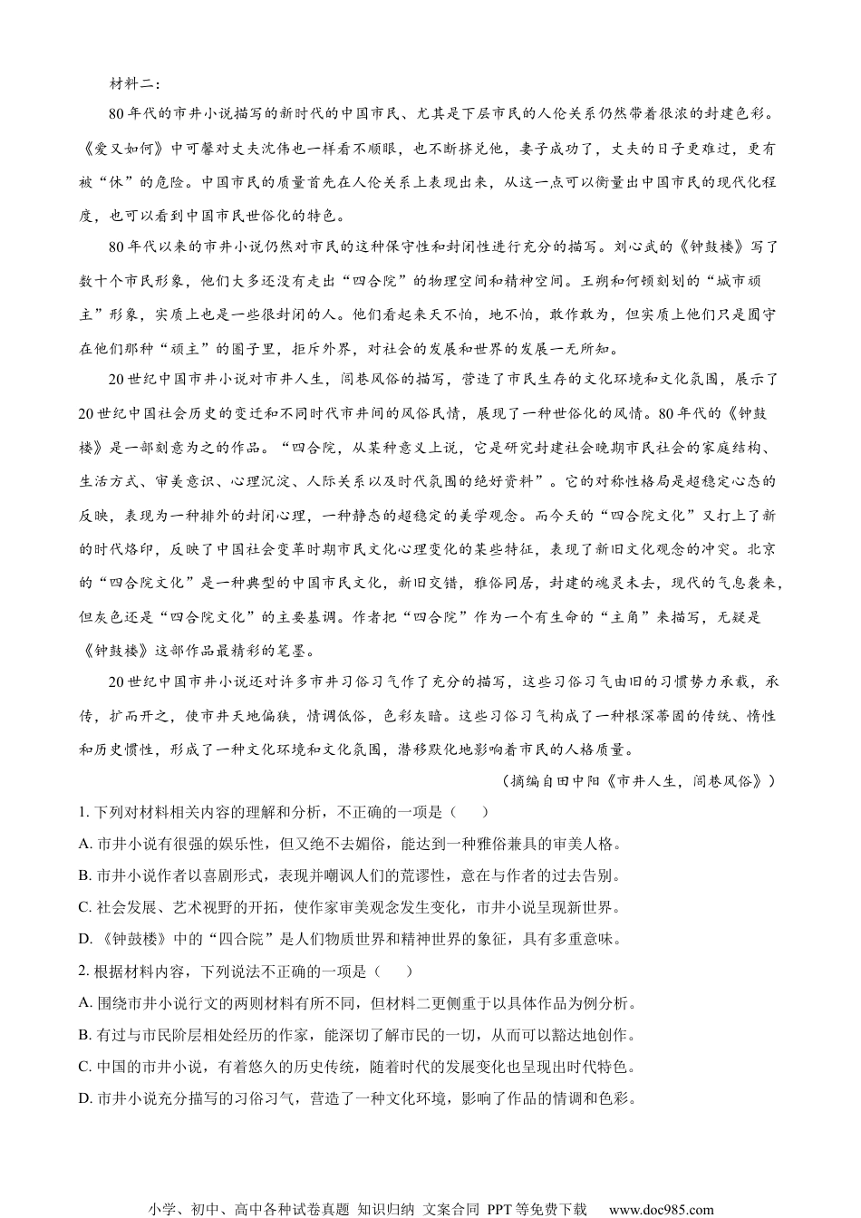 小学、初中、高中各种试卷真题知识归纳文案合同PPT等免费下载www.doc985.com2023届江苏省南通市高三三模(高考适应性检测三)语文试题(三模)一、现代文阅读(共35分)(一)现代文阅读I(本题共5小题,17分)阅读下面的文字,完成下面小题。材料一:历史悠久的市井小说,在所表现的社会生活中蕴含着传统的文化精神和美学情致。市井小说注重对民族文化传统的发掘,有着传统的艺术精神,在市井民俗风情的描绘中,来展示丰厚的历史文化积淀,并善于在传奇故事和细节描写中来突现人物命运和性格,具有很强的娱乐性,符合传统的阅读趣味,使人获得轻松愉悦的审美享受。市井小说在刻画人物、描摹市井风俗的时候,并没有像其他小说那样,有着社会政治、历史、文化方面的负载。理想主义的浪漫激情、忧患意识及对改造国民性的探讨,都被淡化。也不故作高雅,来俯视芸芸众生,嘲弄鄙视世俗。而主要以娱人和自娱的审美情趣来观察、体验、剖析人情世态、风土民情,描绘出三教九流的众生相和纷纭杂陈的世俗景观,并从一幅幅民俗风情画中,显示出民心、民风、民气,具有鲜明的平民化倾向。这些作家都曾有过与市民阶层相处的经历,对市民的生活、价值观念、情调趣味有着深切的了解。但决不去媚俗,去迎合或是把玩市民的生活情趣,以市民的眼光未写市民。而是以一种潇洒、豁达、不拘陈规的对市井文化既亲近又疏远的文人心态,化俗为雅,从而达到一种雅俗兼具的美学品格。以马克思主义的美学观来看,喜剧性是揭示事物矛盾的一种特殊形式。那些丑恶腐朽的、逆历史潮流而动的人和事,而又虚伪地冒充美好的、进步的企图,都可以通过喜剧的形式揭示出来。市井小说对那些王公贵族、民国总统、封建遗老、军阀政客、破落户子弟的全部荒谬性,以喜剧的形式,毫不足惜地进行无情的讽刺、批判和彻底的否定,以此来葬送那个旧的时代。同时,对现实生活中的保守落后因素、不良风气也进行了善意的嘲讽,意在劝其改善,愉快地同自己的过去告别。喜剧性的审美效应,既能使读者发出愉悦的笑声,又使那些荒谬的、庸俗的、虚伪的、矫情的等应否定的一切,在笑声中被彻底撕毁,显示出作者对美好事物的理想追求。八十年代以来,随着社会生活的发展,艺术视野的开拓,作家们的审美观念也发生了重大的变化。开始注重人物的内心世界,思索平凡人生的意义,感受富有文化意蕴的生活现象,从而以非情节化的结构方式来营造新的艺术世界。而新时期市井小说却独树一帜,以民族传统的叙事方式,参与当代小说的文体革命,进行了有益的实践。既注重故事情节的作用,增强了作品的可读性,又摆脱了庸俗的低级趣味,具有较高的文化品位,使新时期市井小说成为雅俗共赏的文学作品。(摘编自张学军《新时期市井小说的美学品格》)小学、初中、高中各种试卷真题知识归纳文案合同PPT等免费下载www.doc985.com材料二:80年代的市井小说描写的新时代的中国市民、尤其是下层市民的人伦关系仍然带着很浓的封建色彩。《爱又如何》中可馨对丈夫沈伟也一样看不顺眼,也不断挤兑他,妻子成功了,丈夫的日子更难过,更有被“休”的危险。中国市民的质量首先在人伦关系上表现出来,从这一点可以衡量出中国市民的现代化程度,也可以看到中国市民世俗化的特色。80年代以来的市井小说仍然对市民的这种保守性和封闭性进行充分的描写。刘心武的《钟鼓楼》写了数十个市民形象,他们大多还没有走出“四合院”的物理空间和精神空间。王朔和何顿刻划的“城市顽主”形象,实质上也是一些很封闭的人。他们看起来天不怕,地不怕,敢作敢为,但实质上他们只是囿守在他们那种“顽主”的圈子里,拒斥外界,对社会的发展和世界的发展一无所知。20世纪中国市井小说对市井人生,闾巷风俗的描写,营造了市民生存的文化环境和文化氛围,展示了20世纪中国社会历史的变迁和不同时代市井间的风俗民情,展现了一种世俗化的风情。80年代的《钟鼓楼》是一部刻意为之的作品。“四合院,从某种意义上说,它是研究封建社会晚期市民社会的家庭结构、生活方式、审美意识、心理沉淀、人际关系以及时代氛围的绝好资料”。它的对称性格局是超稳定心态的反映,表现为一种排外的封闭心理,...