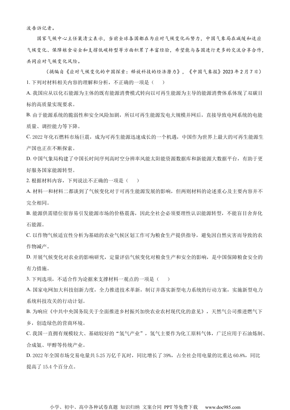 小学、初中、高中各种试卷真题知识归纳文案合同PPT等免费下载www.doc985.com2023届高三语文试卷2023.05一、现代文阅读(35分)(一)现代文阅读I(本题共5小题,17分)材料一:双碳目标的高质量实现要求我国要在今后四十年内打破以化石能源为主体的既有能源消费模式,转向以可再生能源为主导的能源消费体系。“这一过程必将催生更多不确定性风险,容易导致阶段性、结构性供需失衡等诸多重大问题。面对世界百年变局和世纪疫情交织叠加的国际环境,不稳定、不确定外部因素明显增加。”今年两会之际,全国政协委员、中国工程院院士张来斌表示。此外,张来斌指出,以太阳能、风能为代表的可再生能源易受气候条件不确定的影响,导致可再生能源电力的波动性和间歇性,进而在一定程度上影响能源系统低碳转型的稳步推进。张来斌经过调研发现,加速绿色低碳转型导致能源和金属矿产资源的供需错配。在能源转型过渡期,传统能源矿产资源的长期投资收益呈下降趋势,导致市场投资意愿下降、基础设施建设不足。加速绿色低碳转型还会导致对金属的需求大幅增加。仅考虑光伏、风电部门需求,铜、镍、锌、银、碲等金属将面临供应风险,但上游矿产开发投资增速不及预期、金属矿产资源开采难度持续加大。可再生能源发展路径的不确定性又进一步放大了金属供需错配。其次,全球能源供需关系失衡,引发市场和价格周期性震荡。2022年3月3日,布伦特和WTI原油期货价格盘中分别突破每桶119美元和每桶116美元。这既有俄乌战争和地缘政治因素的影响,也有生产跟不上消费因素的影响。能源消费的刚性需求在回升,但能源生产供应恢复具有滞后性。这种能源供需错位,很容易引发能源市场的价格震荡。这也给全社会敲响了警钟,要理性认识能源转型,如果不切实际地盲目舍弃化石能源,那么类似的市场和价格周期性震荡还会出现。另外,可再生能源基础设施易遭受极端天气影响。在现有技术条件下,可再生能源的80%以上需要转化为电能进行利用,水电、风电、光伏发电存在波动性、间歇性、随机性特征,受天气影响明显。可再生能源发电大规模并网后,导致电网系统的电能质量、安全稳定、调控能力等下降。在遭遇极端天气时,会加剧能源系统的脆弱性和安全风险。基于此,张来斌提出解决方案。他建议,其一,发挥好传统化石能源的压舱石作用;其二,有效应对全球化、多元化带来的能源价格波动风险;其三,积极稳妥推进能源绿色低碳转型。“面对百年未有之大变局和错综复杂的国际环境,我国需要积极稳妥推进能源绿色低碳转型,减少对进口化石能源的依赖,将属地性特征强的可再生能源逐步发展成为能源供应的主体,致力于从根本上解决能源供应安全的问题。”张来斌强调。小学、初中、高中各种试卷真题知识归纳文案合同PPT等免费下载www.doc985.com(摘编自张来斌《注意防范能源转型过程中的重大风险》)材料二:气候变化正迅速成为全球经济表现中“令人不安”的变量因素。为应对气候剧烈波动带来的不确定性,中国正通过强化对相关科技的支持,尝试动态调整农业生产布局,同时解决清洁能源领域面临的“间歇性”难题,从而减轻气候变化施加于农业和能源上的影响。“除了极端气候事件发生的频率和强度增加带来的不利影响,气候变暖也导致中国病虫害发生区域向高纬度、高海拔地区扩展,作物发育期提前、生长周期变短,气候波动增加。”国家气候中心气候变化影响适应室主任陆波说。为此,中国气象局全面推进气候变化对主要粮食和经济作物种植制度、病虫害、品种适应性、产量和品质的综合影响评估工作;建立不同极端天气气候事件与农作物产量评估的定量关系模型,研发全国和区域极端天气气候事件的农业损失评估模型,为降低农业自然灾害风险提供支撑。以黑龙江为例,在气候变暖背景下,气象部门立足全省积温带北移东扩情况,重新划分全省六条积温带,推进科学调整全省农业布局,作物种植面积大幅增加,粮食作物种植面积由1980年的1.1亿亩增加到2021年2.182亿亩。陆波透露,以作物气候适宜性分析为基础的农业气候区划工作可为粮食生产提供指导,这在中国农业生产布局调整中发挥了重要作用。这是一个全新的尝试。随着气候不断发生动态变化,...