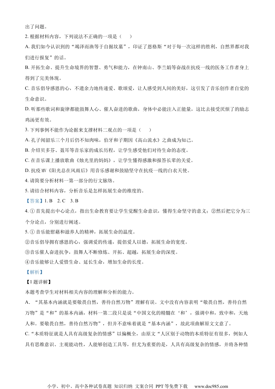 小学、初中、高中各种试卷真题知识归纳文案合同PPT等免费下载www.doc985.com2023届江苏省南通市高三5月考前押题第三次模拟语文试题一、非连续性文本阅读阅读下面的文字,完成下面小题。材料一:生命教育要让学生觉醒生命意识,懂得生命坚守的意义。要敬畏自然,天地人和。中国文化的精髓在“和”,强调中和,致中和,天地人和。要敬畏自然,善待自然万物。恩格斯在《自然辨证法》中曾指出,“不要过分陶醉于我们人类对自然界的胜利。对于每一次这样的胜利,自然界都对我们进行报复,我们最初的成果又消失了”。要敬畏生命,珍爱生命。生命的涎生是极其神圣的,每个人的生命只有一次,必须珍惜与爱护。要尊重和热爱生命,提升生命的质量,无论经历什么挫折苦难,遭遇什么不幸,都要勇于面对,坚强地生活下去。正如法国作家罗曼·罗兰所说,“我心目中的英雄主义,就是在认清了生活的本质之后,依然热爱生活”。要尊重他者,守望相助。美国作家海明威在《丧钟为谁而鸣》中发出预警,所有人是一个整体,别人的不幸就是你的不幸。所以不要问丧钟是为谁而鸣,它就是为你而鸣。经济全球化时代,各国命运相连、休戚相关,中国人民为抗击疫情、遏制疫情所作出的努力和牺牲,正是构建“人类命运共同体”的伟大实践。生命教育要给学生提升生命境界的智慧。总有一种力量让我们泪流满面,总有一种泪水擦亮我们的眼睛、净化我们的灵魂。生命的意义,不仅在于坚守,更在于开拓。生命教育要赋予学生这种开拓生命、提升生命境界的智慧、勇气和能力。古罗马哲学家塞涅卡说:“真正的人生,只有在经过艰难卓越的斗争之后才能实现。”人的生命,也正是在不断进取、不断探索、不断自我挑战中得到开拓和提升,从而变得深沉而辽阔、厚实而隽永。生命教育要鼓励学生拓展生命的维度。生命有“四个维度”:一是生命是有温度的。生命,是具体、多元、鲜活的,会有高低起伏、顺境逆境,要懂得用时间去疗伤,要学会用哲学、用人文艺术和时代精神去慰藉、去滋养。二是生命是有宽度的。只有尊重生命、热爱生命、爱人以德,德智体美劳全面发展,有人格、有担当、有本领,才能更好地实现生命的价值和人生的意义。三是生命是有深度的。生命需要不断修炼、不断开拓、不断超越,需要放下自我与得失的纠结,舍小我成就大我,在拼搏中奉献正能量。四是生命是有长度的。要爱惜生命、延长生命,提升生命的意义。要重视身心健康,加强体育锻炼,争取健康快乐地为祖国工作四十年甚至五十年。(摘编自罗海鸥《生命教育是人生重大课题》)小学、初中、高中各种试卷真题知识归纳文案合同PPT等免费下载www.doc985.com材料二:音乐能够表达人类最丰富的情感。人区别于动物的本质特征有很多,例如人具有思维意识、主观能动性,人能够创造工具等,但尤为重要的是,人具有高级复杂的情感,并将各种情感运用于艺术创作中。音乐作为听觉的艺术、时间的艺术,本质是情感表达。音乐是表达人类思想意志的载体,不仅能够表达情感的内容,还能表达情感的强度;不仅能够表达作曲家的情感,还能融入音乐表演者和欣赏者的内心,引发他们的情感共鸣。音乐能使人在精神上获得最大的满足。贝多芬说:“音乐能使人的精神爆发出火花。”人们对物质世界的追求是无止尽的,在物质极大丰富后,幸福感的获得却越来越难。同样是为了代步,曾经买一辆自行车便能获得的满足感,如今买辆豪车也得不到了。物质世界越来越富有,精神世界却没有同步跟上,这或许是许多人不幸福的根源。音乐倡导感恩的心,歌颂生命的延续。音乐作品中,对于爱的传递、爱的歌颂是不遗余力的。这并不是强加于音乐创作者的任务,而是源于他们自觉的生命意识。“你入学的新书包有人给你拿,你委屈的泪花有人给你擦……”每当唱起或听到这首《母亲》,谁能不感受到母爱的温暖,继而化作报答的情思?“那是我小时候,常坐在父亲肩头,父亲是儿登天的梯,父亲是那拉车的牛……”《父亲》这样的歌曲,总能引起情感的共鸣,总能唤起一颗感恩的心。人类的生命得以延续,靠的就是爱的传递、爱的接力。“我要飞到无尽的夜空,摘颗星星做你的玩具,我要亲手触摸那月亮,还在上面写你的名字……...