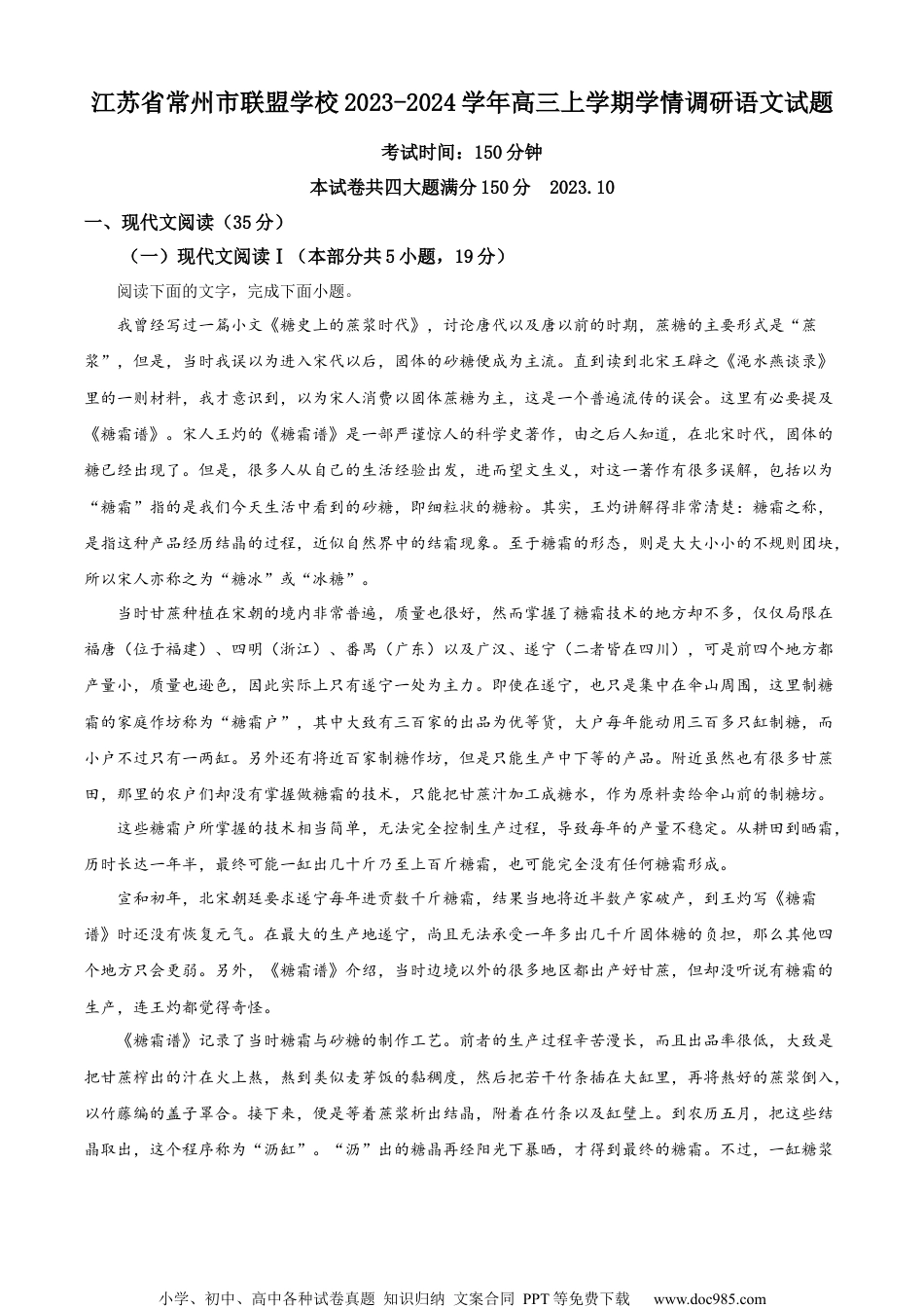 小学、初中、高中各种试卷真题知识归纳文案合同PPT等免费下载www.doc985.com江苏省常州市联盟学校2023-2024学年高三上学期学情调研语文试题考试时间:150分钟本试卷共四大题满分150分2023.10一、现代文阅读(35分)(一)现代文阅读Ⅰ(本部分共5小题,19分)阅读下面的文字,完成下面小题。我曾经写过一篇小文《糖史上的蔗浆时代》,讨论唐代以及唐以前的时期,蔗糖的主要形式是“蔗浆”,但是,当时我误以为进入宋代以后,固体的砂糖便成为主流。直到读到北宋王辟之《渑水燕谈录》里的一则材料,我才意识到,以为宋人消费以固体蔗糖为主,这是一个普遍流传的误会。这里有必要提及《糖霜谱》。宋人王灼的《糖霜谱》是一部严谨惊人的科学史著作,由之后人知道,在北宋时代,固体的糖已经出现了。但是,很多人从自己的生活经验出发,进而望文生义,对这一著作有很多误解,包括以为“糖霜”指的是我们今天生活中看到的砂糖,即细粒状的糖粉。其实,王灼讲解得非常清楚:糖霜之称,是指这种产品经历结晶的过程,近似自然界中的结霜现象。至于糖霜的形态,则是大大小小的不规则团块,所以宋人亦称之为“糖冰”或“冰糖”。当时甘蔗种植在宋朝的境内非常普遍,质量也很好,然而掌握了糖霜技术的地方却不多,仅仅局限在福唐(位于福建)、四明(浙江)、番禺(广东)以及广汉、遂宁(二者皆在四川),可是前四个地方都产量小,质量也逊色,因此实际上只有遂宁一处为主力。即使在遂宁,也只是集中在伞山周围,这里制糖霜的家庭作坊称为“糖霜户”,其中大致有三百家的出品为优等货,大户每年能动用三百多只缸制糖,而小户不过只有一两缸。另外还有将近百家制糖作坊,但是只能生产中下等的产品。附近虽然也有很多甘蔗田,那里的农户们却没有掌握做糖霜的技术,只能把甘蔗汁加工成糖水,作为原料卖给伞山前的制糖坊。这些糖霜户所掌握的技术相当简单,无法完全控制生产过程,导致每年的产量不稳定。从耕田到晒霜,历时长达一年半,最终可能一缸出几十斤乃至上百斤糖霜,也可能完全没有任何糖霜形成。宣和初年,北宋朝廷要求遂宁每年进贡数千斤糖霜,结果当地将近半数产家破产,到王灼写《糖霜谱》时还没有恢复元气。在最大的生产地遂宁,尚且无法承受一年多出几千斤固体糖的负担,那么其他四个地方只会更弱。另外,《糖霜谱》介绍,当时边境以外的很多地区都出产好甘蔗,但却没听说有糖霜的生产,连王灼都觉得奇怪。《糖霜谱》记录了当时糖霜与砂糖的制作工艺。前者的生产过程辛苦漫长,而且出品率很低,大致是把甘蔗榨出的汁在火上熬,熬到类似麦芽饭的黏稠度,然后把若干竹条插在大缸里,再将熬好的蔗浆倒入,以竹藤编的盖子罩合。接下来,便是等着蔗浆析出结晶,附着在竹条以及缸壁上。到农历五月,把这些结晶取出,这个程序称为“沥缸”。“沥”出的糖晶再经阳光下暴晒,才得到最终的糖霜。不过,一缸糖浆小学、初中、高中各种试卷真题知识归纳文案合同PPT等免费下载www.doc985.com不会全部结晶成霜,会留下相当比例的“糖水”,也就是余浆。这些糖水有两种去处,直接卖掉,“或自熬砂糖”。很清楚,在王灼时代的制糖体系里,砂糖与糖霜是截然不同的两种商品。实际上,王灼非常了不起,在卷二清楚地勾勒了中国古人在蔗糖消费上的不同阶段:第一个阶段为蔗浆,乃是甘蔗压榨成的汁。第二个阶段为“蔗饷”,即经过初步简单加工的甘蔗饴浆,很可能是把甘蔗榨汁在阳光下晒,蒸发掉水分,由此形成浓缩稠浆。第三个阶段,则是加入了把蔗浆汁在火上熬炼的程序。文献记载,唐太宗派人从印度的摩接陀国学会了“熬糖法”,很多后代学者误以为,这次引入的新技术是直接制作固体糖,但事实绝非如此。王灼推测,熬糖法是“熬糖渖作剂,似是今之砂糖也”,接下来他明确道:“蔗之技尽于此,不言作霜,然则糖霜非古也。”他指出,三个阶段里都没有提到固体糖的制作工艺,所以糖霜的历史并不长。同时,他认为,唐初从印度引入的熬糖法,制成的产品就是砂糖。所以,在王灼那里,砂糖不是固体糖,尤其不是今天的砂糖。《糖霜谱》指出,砂糖是用甘蔗浆就,元代官修的《农桑辑要》收编了详细的“煎熬法”,其...