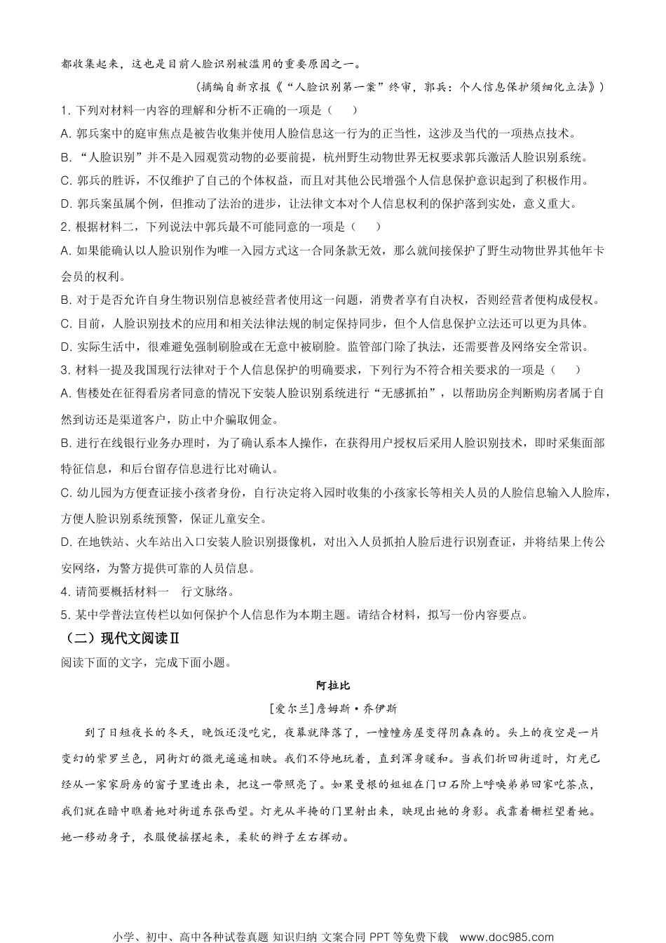 南京市南师大附中2020-2021学年高三5月模拟语文试题(满分:100分,时间:75分钟)一、现代文阅读(一)现代文阅读Ⅰ阅读下面的文字,完成下面小题。材料一:4月9日,备受关注的“人脸识别第一案”迎来了终审判决。被告杭州野生动物世界被判删除原告郭兵办理指纹年卡时提交的包括照片在内的面部特征信息和指纹识别信息,并于判决生效之日起十日内履行完毕。2019年4月,郭兵支付1360元购买野生动物世界双人年卡,确定指纹识别入园方式。2019年7月、10月,野生动物世界两次向郭兵发送短信,通知年卡入园识别系统更换事宜,要求激活人脸识别系统,否则将无法正常入园。但是,郭兵认为人脸信息属于高度敏感个人隐私,不同意接受人脸识别,要求园方退卡。本案庭审的焦点在于,对野生动物世界收集使用人脸信息的行为如何评判的问题。不可否认,人脸识别是我们这个时代最伟大的进步技术之一。它所依赖的,是每个个体的生物特征,比如虹膜。这是与指纹、掌纹、静脉一样的生物特征,也被称为“人体密码”。与数字密码不同,生物特征是人无法改变的生理特征,是人的最后防线。这种重要性,恰如二审法院指出的:生物识别信息作为敏感的个人信息,深度体现自然人的生理和行为特征,具备较强的人格属性,一旦被泄露或者非法使用,可能导致个人受到歧视或者人身、财产安全受到不测危害,因此更应谨慎处理和严格保护。顺延这样的逻辑,去动物园看动物必须要“刷脸”吗?显然不是。一方面,郭兵在购票时双方约定的是指纹识别,提出“人脸识别”是动物园的单方措施;另一方面,“人脸识别”也不是看动物的必要前提,而所有个人生物信息的采集必须符合合法、正当、必要的原则。我国现行法律对于个人信息有明确的保护要求。民法典第一百一十一条就规定,任何组织和个人需要获取他人个人信息的,应当依法取得并确保信息安全,不得非法收集、使用、加工、传输他人个人信息,不得非法买卖、提供或者公开他人个人信息。刑法也规定,不经同意而非法获取,或者将合法取得的个人信息出售或提供给第三方,此类行为均涉嫌构成侵犯公民个人信息罪。只不过,由于人脸识别等新技术的快速推广和广泛使用,很多人对身边的侵犯公民个人信息行为往往习焉不察,甚至习以为常。同时,不少企业和部门,也以追求效率为第一目标,有意或无意侵犯公民个人信息。个人信息的法律保护,很多时候也只是停留在纸面上。“人脸识别第一案”的判决告诉我们,可以小学、初中、高中各种试卷真题知识归纳文案合同PPT等免费下载www.doc985.com勇敢地向人脸识别说“不”。值得一提的是,本案的原告郭兵曾在听证会上提出小区门禁不得强制使用生物信息识别的建议,被有关方面采纳。杭州因此也成为在物管条例中全国首个明确禁止物业强制人脸识别的城市。在这个意义上,郭兵开启的“人脸识别第一案”,寻求的不仅是个体权益的私力救济,也是对所有公民个人信息保护的积极提醒。具有标志性的个案判决,往往会成为法治生成正义的落脚点、法治不断进步的增长点。期待本案的“尺寸之功”能够发挥影响性诉讼的示范意义,进而推动个案正义转向制度正义,让法律文本对个人信息权利的保护真正落到实处。(摘编自人民网《“人脸识别第一案”终审判决》)材料二:新京报:在个人信息保护中,你认为应如何保障消费者的选择权?郭兵:选择权的保障,一方面是消费者要有选择权,另一方面,消费者也要能认识到使用人脸识别信息存在的风险。人脸识别信息属于个人敏感信息,一旦泄露、非法提供或者滥用将极易危害人身和财产安全。很多消费者对这种风险没有意识,他们可能会为了便利就轻易选择。我认为对于会员卡办理、小区门禁这些特别敏感的生物识别场景,人脸识别信息的收集是不必要的。在这些场景下,要想全面保障消费者的选择权,就需要技术使用方提供足够的风险提示,这样才能逐步培养起消费者个人信息保护的意识。是否也可以参考“吸烟有害健康”的提醒模式,让消费者们了解人脸识别信息的使用风险。新京报:会员卡办理和门禁还在形式上取得了消费者的同意,但今年央视3·15晚会曝光了部分商家未经同意就收集进店顾客人脸识别信息,您怎么看这种行为?郭兵:...