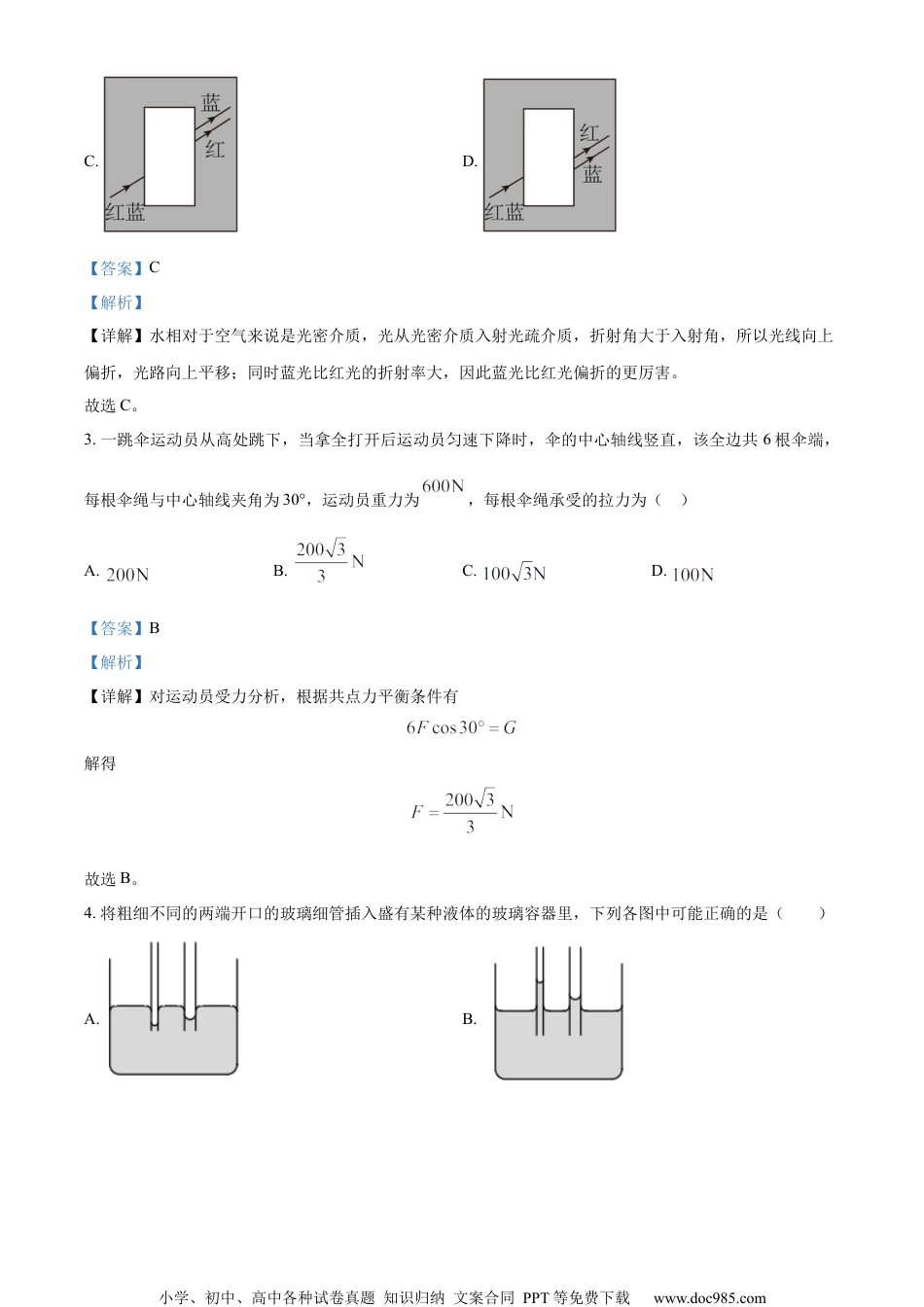 小学、初中、高中各种试卷真题知识归纳文案合同PPT等免费下载www.doc985.com2022-2023学年度苏锡常镇四市高三教学情况调研(一)物理2023.3注意事项:考生在答题前请认真阅读本注意事项1.本试赛包含选择题和非选择题两部分。考生答题全部答在答题卡上,答在本试卷上无放,全卷共15题,本次考试时间为75分钟,满分100分2.答选择题必须用2B铅笔把答题卡上对应题目的答案标号涂黑。如需改动,请用橡皮擦干净后,再选涂其它答案,答非选择题必须用书写黑色字迹的0.5毫米签字笔写在答题卡上的指定位置,在其它位置答题一律无效。3.如需作图,必须用2B铅笔绘、写清楚、线条、符号等须加果,加粗。一、单项选择题:共10题,每小题4分,共计40分.每小题只有一个选项最符合题意。1.现代考古通过测量生物化石中放射性同位素碳14的量来确定生物的年代。碳14的衰变方程为,上述反应中为()A.电子B.中子C.质子D.氘核【答案】A【解析】【详解】根据电荷数守恒、质量数守恒,a的质量数为14-14=0电荷数为6-7=-1所以a为电子。故选A。2.一个长方体空气柱固定在水中,空气与水之间的透明介质厚度不计,一束红、蓝色激光射入空气柱,不考虑反射光线,下列光路图中可能正确的是()A.B.小学、初中、高中各种试卷真题知识归纳文案合同PPT等免费下载www.doc985.comC.D.【答案】C【解析】【详解】水相对于空气来说是光密介质,光从光密介质入射光疏介质,折射角大于入射角,所以光线向上偏折,光路向上平移;同时蓝光比红光的折射率大,因此蓝光比红光偏折的更厉害。故选C。3.一跳伞运动员从高处跳下,当拿全打开后运动员匀速下降时,伞的中心轴线竖直,该全边共6根伞端,每根伞绳与中心轴线夹角为30°,运动员重力为,每根伞绳承受的拉力为()A.B.C.D.【答案】B【解析】【详解】对运动员受力分析,根据共点力平衡条件有解得故选B。4.将粗细不同的两端开口的玻璃细管插入盛有某种液体的玻璃容器里,下列各图中可能正确的是()A.B.小学、初中、高中各种试卷真题知识归纳文案合同PPT等免费下载www.doc985.comC.D.【答案】B【解析】【详解】A.若液体不浸润玻璃时,在玻璃的细管内会下降,并形成向上凸起的球面,选项A错误;BCD.若液体浸润玻璃时,液体在玻璃的细管内会上升,并形成向下凹陷的球面,且细管越细,液柱上升越高,选项B正确,CD错误。故选B。5.某同学抓住绳子一端在内做了两种不同频率的简谐运动,其振动图像如图所示.下列说法正确的是()A.绳端起振方向向下B.前后两次振动的周期之比为1:2C.前后两次形成的绳波波速之比为2:1D.前后两次形成的绳波波长之比为2:1【答案】D【解析】【详解】A.如图,绳端起振方向向上,A错误;B.由图可知,前后两次振动的周期之比为2:1,B错误;C.相同介质波速不变,波速之比为1:1,C错误;D.根据可知,波长之比为2:1,D正确。故选D。小学、初中、高中各种试卷真题知识归纳文案合同PPT等免费下载www.doc985.com6.2021年2月,天问一号火星探测器被火星捕获,经过系列变轨后从“调相轨道”进入“停泊轨道”,为着陆火星做准备。如图所示,阴影部分为探测器在不同轨道上绕火星运行时与火星的连线每秒扫过的面积,下列说法正确的是()A.图中两阴影部分的面积相等B.从“调相轨道”进入“停泊轨道”探测器周期变大C.从“调相轨道”进入“停泊轨道”探测器机械能变小D.探测器在点的加速度小于在点的加速度【答案】C【解析】【详解】A.根据开普勒第二定律可知探测器绕火星运行时在同一轨道上与火星的连线每秒扫过的面积相等,但在不同轨道上与火星的连线每秒扫过的面积不相等,故A错误;B.根据开普勒第三定律知探测器在停泊轨道上运行周期比在调相轨道上小,故B错误;C.探测器从“调相轨道”进入“停泊轨道”需在P点减速,做近心运动,机械能减小,故C正确;D.根据牛顿第二定律可知P点的加速度比在N点的大,故D错误。故选C。7.一质量为,带电量为的小球从水平放置的带正电圆环的轴线处A点由静止释放,A、关于点对称,下列判断正确的是()小学、初中、高中各种试卷真题知识归纳文案合同PPT等免费下载www.doc985.comA.小球在点处动能最大B.小球在点的加速度最...