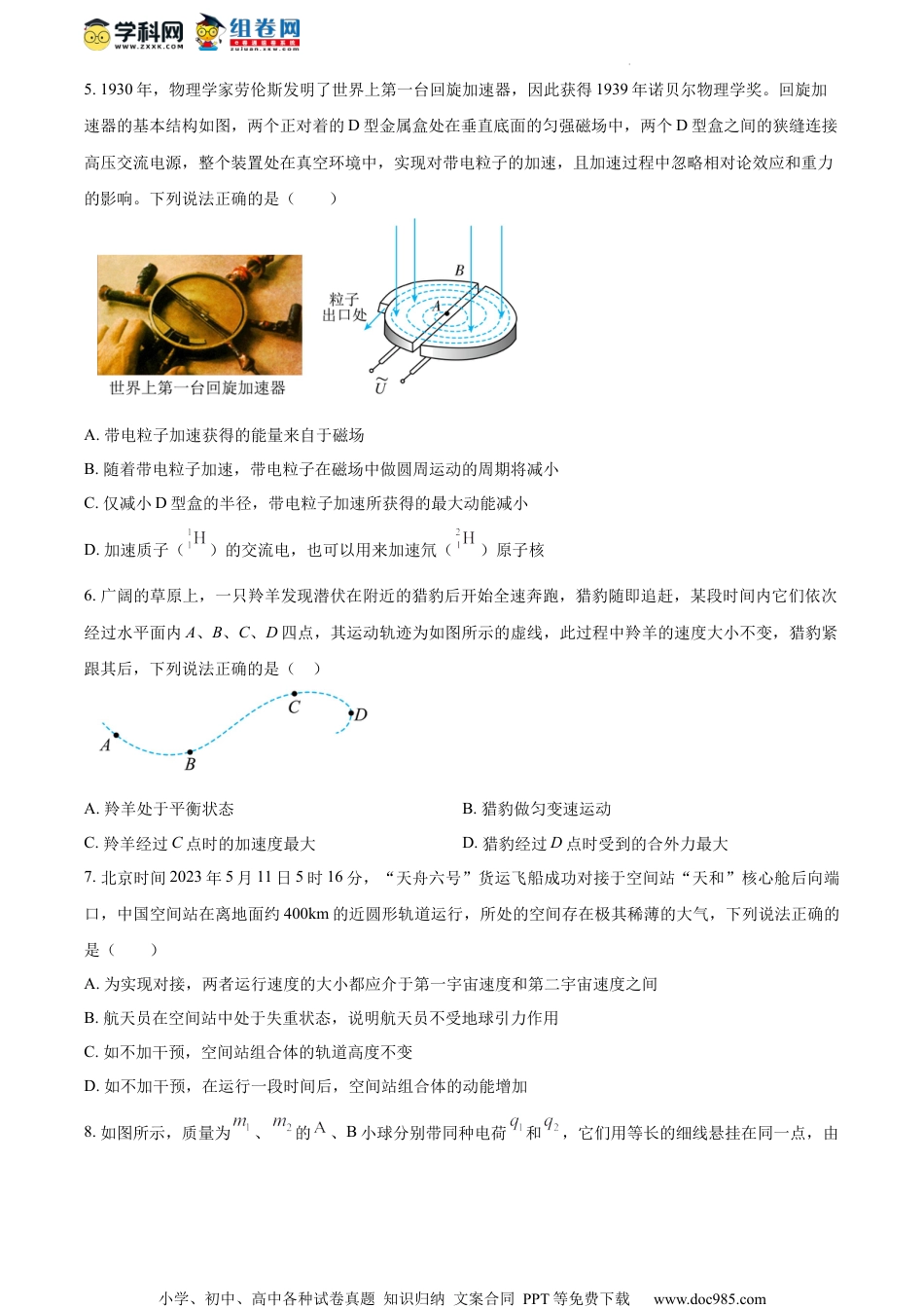 小学、初中、高中各种试卷真题知识归纳文案合同PPT等免费下载www.doc985.com2023年秋学期第四次阶段测试高三物理试卷(考试用时:75分钟:总分:100分)注意事项:1.本试卷共分两部分,第Ⅰ卷为选择题,第Ⅱ卷为非选捍题。2.所有试题的答案均填写在答题卡上,答案写在试卷上的无效。第Ⅰ卷一、单项选择题(共11小题,每小题4分,共计44分.每小题只有一个选项符合题意.)1.2023年诺贝尔物理学奖颁发给Pierre等三位物理学家,以表彰他们“为研究物质中的电子动力学而产生阿秒()光脉冲的实验方法”。一百多年前的1918年,普朗克也曾因为他的能量子理论而获得诺贝尔物理学奖。已知某种光的光子能量,普朗克常量为,则这种光的波动周期是()A.B.C.D.2.如图所示,“阶跃型”光导纤维由“纤芯”和“包层”两个圆柱体组成,其截面为同心圆,中心部分是“纤芯”,“纤芯”以外的部分称为“包层”。下列说法正确的是()A.光导纤维只能传输可见光B.光导纤维中“纤芯”的折射率小于“包层”的折射率C.不同频率的光从同一根光导纤维的一端传输到另一端的时间相同D.光从“纤芯”一端传到另一端的时间与从“纤芯”端面射入时的入射角有关小学、初中、高中各种试卷真题知识归纳文案合同PPT等免费下载www.doc985.com3.一列在某介质中传播的简谐横波在时的波形图如图所示,平衡位置在处的质点P沿y轴方向做简谐运动的表达式为。关于该波,下列说法错误的是()A.传播方向沿x轴正方向B.振幅为C.周期为D.传播速度大小为4.某实验小组用如图甲所示的实验装置探究不同金属发生光电效应时的实验规律,当用频率为v的入射光照射金属时电流表示数不为零,向右调节滑动变阻器的滑片P,直到电流表的示数刚好为零,此时电压表的示数为,该电压称为遏止电压,该实验小组得到与v的关系如图乙中的①所示,则下列有关说法中正确的是()A.实验时电源的左端为正极B.分别用从氢原子能级2到1和能级3到1辐射的光照射金属得到遏止电压和,则C.换用不同的光照射逸出功更大的金属时,得到的关系可能如图乙中的②所示D.当滑片P向左滑动的过程中电流表的示数先增加后不变小学、初中、高中各种试卷真题知识归纳文案合同PPT等免费下载www.doc985.com5.1930年,物理学家劳伦斯发明了世界上第一台回旋加速器,因此获得1939年诺贝尔物理学奖。回旋加速器的基本结构如图,两个正对着的D型金属盒处在垂直底面的匀强磁场中,两个D型盒之间的狭缝连接高压交流电源,整个装置处在真空环境中,实现对带电粒子的加速,且加速过程中忽略相对论效应和重力的影响。下列说法正确的是()A.带电粒子加速获得的能量来自于磁场B.随着带电粒子加速,带电粒子在磁场中做圆周运动的周期将减小C.仅减小D型盒的半径,带电粒子加速所获得的最大动能减小D.加速质子()的交流电,也可以用来加速氘()原子核6.广阔的草原上,一只羚羊发现潜伏在附近的猎豹后开始全速奔跑,猎豹随即追赶,某段时间内它们依次经过水平面内A、B、C、D四点,其运动轨迹为如图所示的虚线,此过程中羚羊的速度大小不变,猎豹紧跟其后,下列说法正确的是()A.羚羊处于平衡状态B.猎豹做匀变速运动C.羚羊经过C点时的加速度最大D.猎豹经过D点时受到的合外力最大7.北京时间2023年5月11日5时16分,“天舟六号”货运飞船成功对接于空间站“天和”核心舱后向端口,中国空间站在离地面约400km的近圆形轨道运行,所处的空间存在极其稀薄的大气,下列说法正确的是()A.为实现对接,两者运行速度的大小都应介于第一宇宙速度和第二宇宙速度之间B.航天员在空间站中处于失重状态,说明航天员不受地球引力作用C.如不加干预,空间站组合体的轨道高度不变D.如不加干预,在运行一段时间后,空间站组合体的动能增加8.如图所示,质量为、的、B小球分别带同种电荷和,它们用等长的细线悬挂在同一点,由小学、初中、高中各种试卷真题知识归纳文案合同PPT等免费下载www.doc985.com于静电斥力的作用,小球靠在竖直光滑墙上,的拉线沿竖直方向,、B均处于静止状态,由于某种原因,两球之间的距离变为原来的一半,则其原因可能是()A.变为原来的一半B.为原来的八倍C.变为原来的一半D.变为原来的四分...