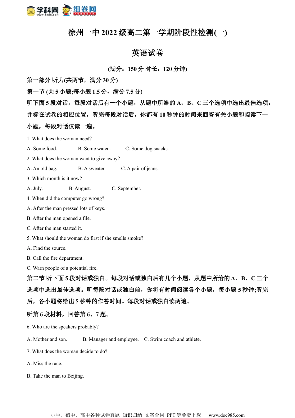 小学、初中、高中各种试卷真题知识归纳文案合同PPT等免费下载www.doc985.com徐州一中2022级高二第一学期阶段性检测(一)英语试卷(满分:150分时长:120分钟)第一部分听力(共两节,满分30分)第一节(共5小题;每小题1.5分,满分7.5分)听下面5段对话。每段对话后有一个小题,从题中所给的A、B、C三个选项中选出最佳选项,并标在试卷的相应位置,听完每段对话后,你都有10秒钟的时间来回答有关小题和阅读下一小题,每段对话仅读一遍。1.Whatdoesthewomanneed?A.Somefood.B.Somewater.C.Somedogsnacks.2.Whatdoesthewomanwanttogiveaway?A.Anoldbag.B.Asweater.C.Apairofjeans.3.Whichmonthisitnow?A.July.B.August.C.September.4.Whendidthecomputergowrong?A.Afterthemanpressedlotsofkeys.B.Afterthemanopenedafile.C.Afterthemanstartedit.5.Whatshouldthewomandofirstifshesmellssmoke?A.Findthesource.B.Callthefiredepartment.C.Warnpeopleofapotentialfire.第二节听下面5段对话或独白。每段对话或独白后有几个小题,从题中所给的A、B、C三个选项中选出最佳选项。听每段对话或独白前,你将有时间阅读各个小题,每小题5秒钟;听完后,各小题将给出5秒钟的作答时间。每段对话或独白读两遍。听第6段材料,回答第6、7题。6.Whoarethespeakersprobably?A.Motherandson.B.Managerandemployee.C.Swimcoachandathlete.7.Whatdoesthewomandecidetodo?A.Misstherace.B.TakethemantoBeijing.小学、初中、高中各种试卷真题知识归纳文案合同PPT等免费下载www.doc985.comC.Rearrangehertravelschedule.听第7段材料,回答第8至10题。8.Whatarethespeakersmainlytalkingabout?A.Carla’sfuturejob.B.Theirjobopportunities.C.ThedevelopmentofAItechnology.9.WhatdoesCarlawanttodo?A.Buildspacecraft.B.Designsoftware.C.Growherownfood.10.WhichsuggestionhasClaretaken?A.StudyingAItechnology.B.Focusingononeindustry.C.Gettingsomeworkexperience.听第8段材料,回答第11至13题。11.Wherearethespeakersprobably?A.Inalibrary.B.Inagarden.C.Inaclassroom.12.WhatkindofbookisJanereading?A.Afantasy.B.Aromanticstory.C.Anadventurestory.13.WhatdoesMikethinkofTheWanderingEarth?A.Itishardtounderstand.B.Itisinsightful.C.Itisthebestadventurestory.听第9段材料,回答第14至16题。14.WhatprobablysurprisedthemanaboutLaila’snewalbum?A.Thatthesingertriedadifferentstyle.B.Thatthesingerreleasedsomanysongs.C.Thatthesingerreturnedtoheroldstyle.15.Whatisthemangoingtodothisweekend?A.Playinhisband.B.Gotoarecordshop.C.Lookafterhisfamilymembers.16.WhereisthebandBlackCloudsfrom?小学、初中、高中各种试卷真题知识归纳文案合同PPT等免费下载www.doc985.comA.England.B.Australia.C.Canada.听第10段材料,回答第17至20题。17.WhatissuedidSarahface?A.Therewasn’tenoughstafftohelpthepatient.B.Shehadn’tcompletedthenecessarytraining.C.Thehospitaldidn’thavetheequipmentsherequired.18.WhatisSarahlike?A.Decisive.B.Experienced.C.Patient.19.WhohelpedSarahtreatthepatient?A.Heroldteachingprofessor.B.Aspecialistwhoworksoverseas.C.Adoctorataneighboringhospital.20.WhatdidthesituationinspireSarahtodo?A.Workinabighospital.B.Takemoremedicaltraining.C.Stayup-to-datewiththenewestmedicaltechnology.第二部分阅读(共两节,满分50分)第一节(共15小题;每小题2.5分,满分37.5分)阅读下列短文,从每题所给的A、B、C、D四个选项中选出最佳选项。AThanksforyourinterestinvisitingtheLosAngelesZoowithyourschoolgroup!Pleasereadthefollowinginformationbeforebookingyourfieldtrip.RequirementsSpecialdiscountedadmissionpricesareavailablewithadvancereservationsONLYforCaliforniaschoolgroups,short-termedasCSG,(registeredwiththeCaliforniaDepartmentofEducation).Theycanenjoy10%off.PLEASENOTE:Reservationblackoutdates(限制日期)mayapplytoallg...