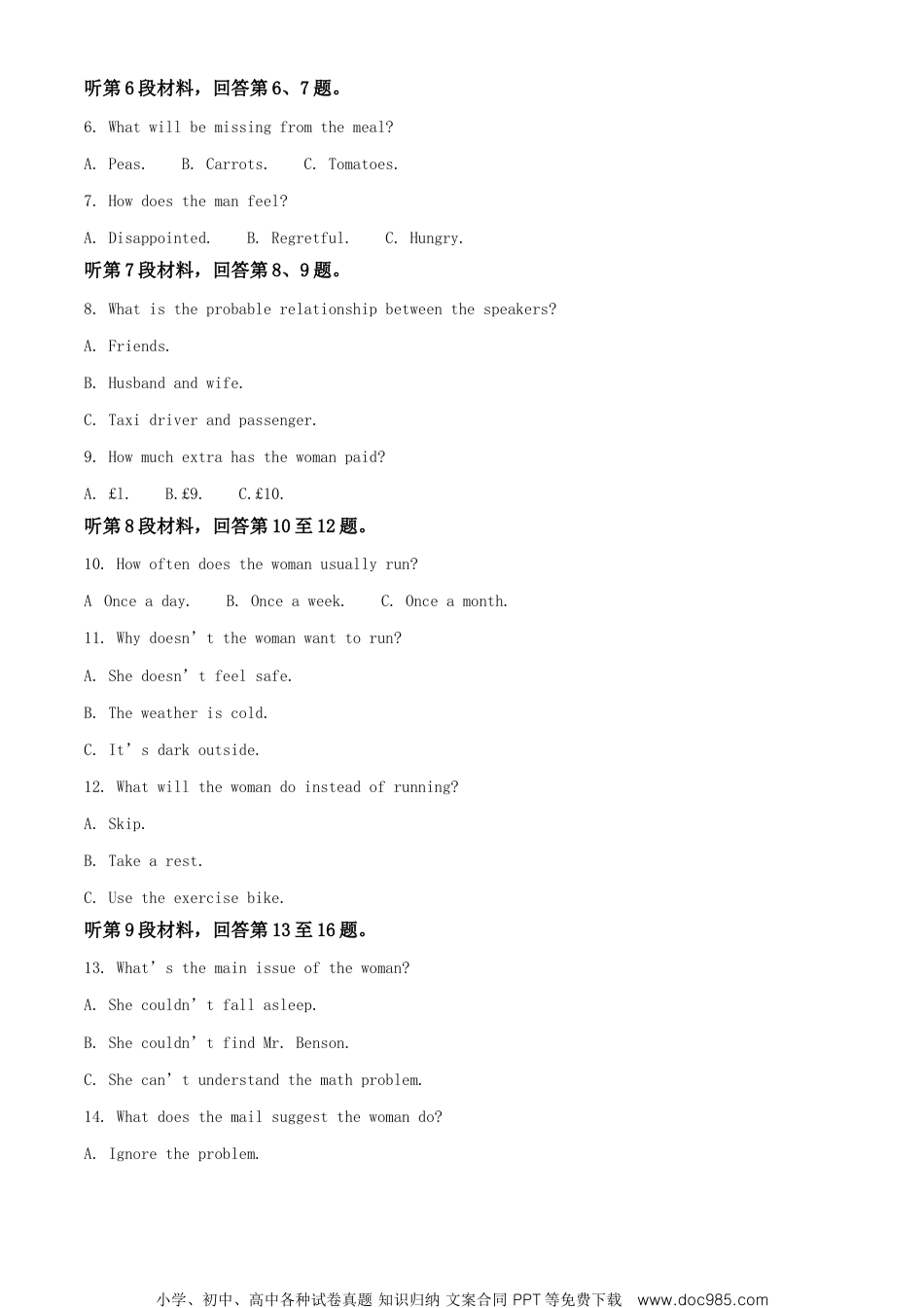 江苏省泰州中学2021届高三年级第四次模拟考试英语试卷第一部分听力(共两节,满分30分)做题时,先将答案标在试卷上。录音内容结束后,你将有两分钟的时间将试卷上的答案转涂到答题卡上。第一节(共5小题;每小题1.5分,满7.5分)听下面5段对话。每段对话后有一个小题,从题中所给的A、B、C三个选项中选出最佳选项,并标在试卷的相应位置。听完每段对话后,你都有10秒钟的时间来回答有关小题和阅读下一小题。每段对话仅读一遍。1.Whatisthemainideaoftheconversation?A.Discussingamountain.B.Decidingonavisit.C.Admiringaview.2.Wherewillthemangofirst?A.Tothekitchen.B.Tothebathroom.C.Tothebedroom.3.Whatdoesthemanwant?A.Toworkharder.B.Togetpromotion.C.Toleavethecompany.4.Whoistheman?A.Arepairman.B.Thewoman’sfriend.C.Thewoman’sroommate.5.Whywillthemanmissthelecture?A.Heissick.B.Heistired.C.Heisnotinterested.第二节(共15小题;每小题L5分,满22.5分)听下面5段对话或独白。每段对话或独白后有几个小题,从题中所给的A、B、C三个选项中选出最佳选项,并标在试卷的相应位置。听每段对话或独白前,你将有时间阅读各个小题,每小题5秒钟;听完后,各小题将给出5秒钟的作答时间。每段对话或独白读两遍。小学、初中、高中各种试卷真题知识归纳文案合同PPT等免费下载www.doc985.com听第6段材料,回答第6、7题。6.Whatwillbemissingfromthemeal?A.Peas.B.Carrots.C.Tomatoes.7.Howdoesthemanfeel?A.Disappointed.B.Regretful.C.Hungry.听第7段材料,回答第8、9题。8.Whatistheprobablerelationshipbetweenthespeakers?A.Friends.B.Husbandandwife.C.Taxidriverandpassenger.9.Howmuchextrahasthewomanpaid?A.£l.B.£9.C.£10.听第8段材料,回答第10至12题。10.Howoftendoesthewomanusuallyrun?A.Onceaday.B.Onceaweek.C.Onceamonth.11.Whydoesn’tthewomanwanttorun?A.Shedoesn’tfeelsafe.B.Theweatheriscold.C.It’sdarkoutside.12.Whatwillthewomandoinsteadofrunning?A.Skip.B.Takearest.C.Usetheexercisebike.听第9段材料,回答第13至16题。13.What’sthemainissueofthewoman?A.Shecouldn’tfallasleep.B.Shecouldn’tfindMr.Benson.C.Shecan’tunderstandthemathproblem.14.Whatdoesthemailsuggestthewomando?A.Ignoretheproblem.小学、初中、高中各种试卷真题知识归纳文案合同PPT等免费下载www.doc985.comB.Asktheteacher.C.Workharder.15.Wherearethespeakers?A.Inthelibrary.B.Inthecanteen.C.Intheclassroom.16.Whendidthewomaneatlasttime?A.Yesterdaynoon.B.Yesterdaymorning.C.Yesterdayafternoon.听第10段材料,回答第17至20题。17.Whatisthespeakerlike?A.Passionate.B.Organized.C.Lazy.18.Whatisthefirstthingthespeakerdoeseveryday?A.Doingexercise.B.Takingashower.C.Makingbreakfast.19.Howlongdoesthespeakertrytomakehiscalls?A.Aboutanhour.B.Abouthalfanhour.C.Aboutaquarterofanhour.20.Whatisthespeaker’sfavoritepartofhisday?A.Walkinghisdog.B.Readingabook.C.Cookingwithhisdaughter.第二部分阅读(共两节,满分50分)第一节(共15小题;每小题2.5分,满分37.5分)阅读下列短文,从每题所给的A、B、C、D四个选项中选出最佳选项。ANomatterwhatyou’reinterestedinAtlantahasmuseumsforyou.Herearemuseumsyoucan’tmissonatriptoAtlanta.MichaelC.CarlosMuseumatEmoryUniversityYoudon’tneedtotraveltheworldtofindartfromancientEgypt,Greece,Rome,Africa,Asia,theAmericasandtheNearEast.Fancycollectionsarehousedhere,locatedonthequadrangle(四方院子)ofEmoryUniversity’scampus.It’soneofthepremierancientart小学、初中、高中各种试卷真题知识归纳文案合同PPT等免费下载www.doc985.commuseumsintheSoutheast.VisitingTip:Downloadapodcastdiscussinghowtoviewthecollectionsinunusualways.Freeadmission.AtlantaHistoryCenterStartwithnativepeopleswholivedinwhatisnowGeorgia.MoveintotheCivilWareraandseewhere...