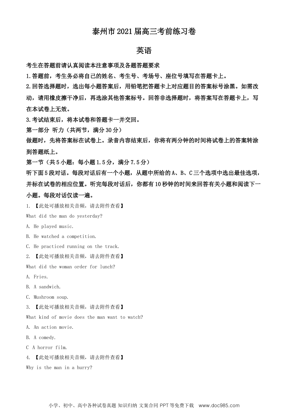 泰州市2021届高三考前练习卷英语考生在答题前请认真阅读本注意事项及各题答题要求1.答题前,考生务必将自己的姓名、考生号、考场号、座位号填写在答题卡上。2.回答选择题时,选出每小题答案后,用铅笔把答题卡上对应题目的答案标号涂黑。如需改动,请用橡皮擦干净后,再选涂其他答案标号。回答非选择题时,将答案写在答题卡上,写在本试卷上无效。3.考试结束后,将本试卷和答题卡一并交回。第一部分听力(共两节,满分30分)做题时,先将答案标在试卷上。录音内容结束后,你将有两分钟的时间将试卷上的答案转涂到答题纸上。第一节(共5小题:每小题1.5分,满分7.5分)听下面5段对话。每段对话后有一个小题,从题中所给的A、B、C三个选项中选出最佳选项,并标在试卷的相应位置。听完每段对话后,你都有10秒钟的时间来回答有关小题和阅读下一小题。每段对话仅读一遍。1.【此处可播放相关音频,请去附件查看】Whatdidthemandoyesterday?A.Heplayedmusic.B.Hewatchedacompetition.C.Hepracticedrunningonthetrack.2.【此处可播放相关音频,请去附件查看】Whatdidthewomanorderforlunch?A.Fries.B.Asandwich.C.Mushroomsoup.3.【此处可播放相关音频,请去附件查看】Whatkindofmoviedoesthemanwanttowatch?A.Anactionmovie.B.Acomedy.C.Ahorrorfilm.4.【此处可播放相关音频,请去附件查看】Whyisthemaninahurry?小学、初中、高中各种试卷真题知识归纳文案合同PPT等免费下载www.doc985.comA.Heisrushinghome.B.Heislateforameeting.C.Heisdoingtherunningexercise.5.【此处可播放相关音频,请去附件查看】Whatdoeshewomanmean?A.Shethinksthemantoldalie.B.Shebelievesitwasdangerousfortheman.C.Shefeelssorryabouttheman'sexperience.第二节(共15小题;每小题1.5分,满分22.5分)听下面5段对话或独白。每段对话或独白后有几个小题,从题中所给的A、B、C三个选项中选出最佳选项,并标在试卷的相应位置。听每段对话或独白前,你将有时间阅读各个小题,每小题5秒钟;听完后,各小题将给出5秒钟的作答时间。每段对话或独白读两遍。听下面一段较长对话,回答以下小题。【此处可播放相关音频,请去附件查看】6.Howmanydailythingsdidthewomandoyesterday?A.Three.B.Four.C.Five.7.Wheredoesthemanneedtogotoday?A.Tothebank.B.Tothesupermarket.C.Tothepostoffice.听下面一段较长对话,回答以下小题。【此处可播放相关音频,请去附件查看】8.Accordingtheman,whatdoweknowabouthiswife?A.Sheisfondofshopping.B.Sheonlylikescertainthings.C.Sheworksinadepartmentstore.9.Whatcolordidthemanwant?A.Black.B.Brown.C.Blue.10.Whatdidthemanbuy?A.Ascarf.小学、初中、高中各种试卷真题知识归纳文案合同PPT等免费下载www.doc985.comB.Apairofgloves.C.Asweater.听下面一段较长对话,回答以下小题。【此处可播放相关音频,请去附件查看】11.Whichstatedoesthewomanthinkhadthebestweather?A.SouthCarolina.B.Georgia.C.NorthCarolina.12.Howmanytypesoffishdidthewomancatch?A.One.B.Two.C.Three.13.Whenmightthewomangobacktofishnexttime?A.InJuly.B.InOctober.C.InDecember.听下面一段较长对话,回答以下小题。【此处可播放相关音频,请去附件查看】14.Whatistheprobablerelationshipbetweenthespeakers?A.Colleagues.B.Teacherandstudent.C.Parentandchild.15.Whatdoesthewomansuggestthemando?A.Saveallheworkforthefinalweek.B.Usethetriptimetostudyforexams.C.Formgoodhabitsandgetstartedearly.16.Whatarethespeakersmainlytakingabout?A.Aresearchpaper.B.Theclassroommanagement.C.Theplanfortheendofterm.听下面一段独白,回答以下小题。【此处可播放相关音频,请去附件查看】17.Whatdidthecustomerthinkofthefirsres?A.Theywereunsatisfying.小学、初中、高中各种试卷真题知识归纳文案合同PPT等免费下载www.doc985.comB.Theyweredelicious.C.Theyweresalty.18.WhydidGeorgeCrumservethecustomerextremelythinfries?A.Hewantedthecustomertobehappy.B.Hewasbotheredbythecustomer'sr...