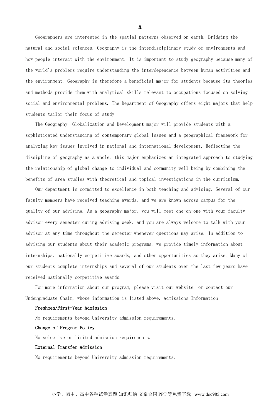 2022届高三木渎苏苑联合适应性检测英语试卷听力(共两节,满分30分)第一节(共5小题;每小题1.5分,满分7.5分)听下面5段对话。每段对话后有一个小题,从题中所给的A、B、C三个选项中选出最佳选项。听完每段对话后,你都有10秒钟的时间来回答有关小题和阅读下一小题。每段对话仅读一遍。1.Whomightthewomanbe?A.Anofficeworker.B.Astudent.C.Aboss.2.Whatdoesthemanaskthewomantodo?A.Deletethemessagecompletely.B.Restartthecomputer.C.Don’tpushthekey.3.Whatarethespeakerstalkingabout?A.WhentogotoChicago.B.HowtogotoChicago.C.WhattodoinChicago.4.Howmuchdoesthewomansave?A.$11.30.B.$99.26.C.$110.56.5.Whenwillthespeakerseattogether?A.At11:00p.m.B.At10:30p.m.C.At6:20p.m.第二节(共15小题,每小题1.5分,满分22.5分)听下面5段对话或独白。每段对话或独白后有几个小题,从题中所给的A、B、C三个选项中选出最佳选项,并标在试卷的相应位置。听每段对话或独白前,你将有时间阅读各个小题,每小题5秒钟;听完后,各小题将给出5秒钟的作答时间。每段对话或独白读两遍。听第6段材料,回答第6、7题。6.WhatdoweknowaboutBetty?A.Shehadamajoroperation.B.Sheisinhospital.C.Shebroughtsomeflowerstotheman.7.WhoisBettytalkingto?A.Herteacher.B.Herdoctor.C.Herclassmate.听第7段材料,回答第8至10题。8.Wheredoestheconversationprobablytakeplace?A.Atagym.B.Ataswimmingpool.C.Atarestaurant.9.Whydoesthemanapplyforamembershipcard?A.Togainmuscle.B.Toloseweight.C.Tohaveaspecialdiscount.10.Whatwillthemandonext?小学、初中、高中各种试卷真题知识归纳文案合同PPT等免费下载www.doc985.comA.Completeaform.B.Callhisfriend.C.Goswimming.听第8段材料,回答第11至13题。11.Wherearethespeakers?A.Attheman’shouse.B.Atarestaurant.C.Atthewoman’shouse.12.Whatisthewoman?A.Acook.B.Ateacher.C.Astudent.13.Whatdoesthemanthinkofthefriedkidney?A.Tasty.B.Salty.C.Disgusting.听第9段材料,回答第14至17题。14.Whatisthemandoingatfirst?A.SearchingforanEnglishmagazine.B.LookingforanEnglishlanguagebook.C.Practicingpronunciationofwords.15.Whatwillthemanmostprobablydo?A.Gotothephilosophysection.B.Keepthebookformorethantwomonths.C.Getthreebooksatthesametime.16.Howmuchwillthemanpay?A.$400.B.$190.C.$150.17.Howdoesthewomansound?A.Patient.B.Indifferent.C.Disappointed.听第10段材料,回答第18至20题。18.WhatdoesMinorHeatmean?A.Theextremehotpointiscoming.B.Thehottestperiodisover.C.Thehottestseasoniscoming.19.WhichactivityisunnecessaryduringMinorHeat?A.Earthquakerelief.B.Floodcontrol.C.Droughtrelief.20.WhatcanpeopledoduringMinorHeat?A.Hangtheclothesoutintheshade.B.Playwithfirefliesathome.C.Appreciatethelotusflower.阅读(共两节,满分50分)第一节(共15小题;每小题2.5分,满分37.5分)小学、初中、高中各种试卷真题知识归纳文案合同PPT等免费下载www.doc985.comAGeographersareinterestedinthespatialpatternsobservedonearth.Bridgingthenaturalandsocialsciences,Geographyistheinterdisciplinarystudyofenvironmentsandhowpeopleinteractwiththeenvironment.Itisimportanttostudygeographybecausemanyoftheworld'sproblemsrequireunderstandingtheinterdependencebetweenhumanactivitiesandtheenvironment.Geographyisthereforeabeneficialmajorforstudentsbecauseitstheoriesandmethodsprovidethemwithanalyticalskillsrelevanttooccupationsfocusedonsolvingsocialandenvironmentalproblems.TheDepartmentofGeographyofferseightmajorsthathelpstudentstailortheirfocusofstudy.TheGeography—GlobalizationandDevelopmentmajorwillprovidestudentswithasophisticatedunderstandingofcontemporaryglobalissuesandageographicalframeworkforanalyzingkeyissuesinvolvedinnationalandinternationaldev...