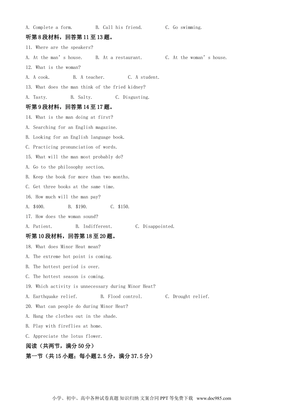 2022届高三木渎苏苑联合适应性检测英语试卷听力(共两节,满分30分)第一节(共5小题;每小题1.5分,满分7.5分)听下面5段对话。每段对话后有一个小题,从题中所给的A、B、C三个选项中选出最佳选项。听完每段对话后,你都有10秒钟的时间来回答有关小题和阅读下一小题。每段对话仅读一遍。1.Whomightthewomanbe?A.Anofficeworker.B.Astudent.C.Aboss.2.Whatdoesthemanaskthewomantodo?A.Deletethemessagecompletely.B.Restartthecomputer.C.Don’tpushthekey.3.Whatarethespeakerstalkingabout?A.WhentogotoChicago.B.HowtogotoChicago.C.WhattodoinChicago.4.Howmuchdoesthewomansave?A.$11.30.B.$99.26.C.$110.56.5.Whenwillthespeakerseattogether?A.At11:00p.m.B.At10:30p.m.C.At6:20p.m.第二节(共15小题,每小题1.5分,满分22.5分)听下面5段对话或独白。每段对话或独白后有几个小题,从题中所给的A、B、C三个选项中选出最佳选项,并标在试卷的相应位置。听每段对话或独白前,你将有时间阅读各个小题,每小题5秒钟;听完后,各小题将给出5秒钟的作答时间。每段对话或独白读两遍。听第6段材料,回答第6、7题。6.WhatdoweknowaboutBetty?A.Shehadamajoroperation.B.Sheisinhospital.C.Shebroughtsomeflowerstotheman.7.WhoisBettytalkingto?A.Herteacher.B.Herdoctor.C.Herclassmate.听第7段材料,回答第8至10题。8.Wheredoestheconversationprobablytakeplace?A.Atagym.B.Ataswimmingpool.C.Atarestaurant.9.Whydoesthemanapplyforamembershipcard?A.Togainmuscle.B.Toloseweight.C.Tohaveaspecialdiscount.10.Whatwillthemandonext?小学、初中、高中各种试卷真题知识归纳文案合同PPT等免费下载www.doc985.comA.Completeaform.B.Callhisfriend.C.Goswimming.听第8段材料,回答第11至13题。11.Wherearethespeakers?A.Attheman’shouse.B.Atarestaurant.C.Atthewoman’shouse.12.Whatisthewoman?A.Acook.B.Ateacher.C.Astudent.13.Whatdoesthemanthinkofthefriedkidney?A.Tasty.B.Salty.C.Disgusting.听第9段材料,回答第14至17题。14.Whatisthemandoingatfirst?A.SearchingforanEnglishmagazine.B.LookingforanEnglishlanguagebook.C.Practicingpronunciationofwords.15.Whatwillthemanmostprobablydo?A.Gotothephilosophysection.B.Keepthebookformorethantwomonths.C.Getthreebooksatthesametime.16.Howmuchwillthemanpay?A.$400.B.$190.C.$150.17.Howdoesthewomansound?A.Patient.B.Indifferent.C.Disappointed.听第10段材料,回答第18至20题。18.WhatdoesMinorHeatmean?A.Theextremehotpointiscoming.B.Thehottestperiodisover.C.Thehottestseasoniscoming.19.WhichactivityisunnecessaryduringMinorHeat?A.Earthquakerelief.B.Floodcontrol.C.Droughtrelief.20.WhatcanpeopledoduringMinorHeat?A.Hangtheclothesoutintheshade.B.Playwithfirefliesathome.C.Appreciatethelotusflower.阅读(共两节,满分50分)第一节(共15小题;每小题2.5分,满分37.5分)小学、初中、高中各种试卷真题知识归纳文案合同PPT等免费下载www.doc985.comAGeographersareinterestedinthespatialpatternsobservedonearth.Bridgingthenaturalandsocialsciences,Geographyistheinterdisciplinarystudyofenvironmentsandhowpeopleinteractwiththeenvironment.Itisimportanttostudygeographybecausemanyoftheworld'sproblemsrequireunderstandingtheinterdependencebetweenhumanactivitiesandtheenvironment.Geographyisthereforeabeneficialmajorforstudentsbecauseitstheoriesandmethodsprovidethemwithanalyticalskillsrelevanttooccupationsfocusedonsolvingsocialandenvironmentalproblems.TheDepartmentofGeographyofferseightmajorsthathelpstudentstailortheirfocusofstudy.TheGeography—GlobalizationandDevelopmentmajorwillprovidestudentswithasophisticatedunderstandingofcontemporaryglobalissuesandageographicalframeworkforanalyzingkeyissuesinvolvedinnationalandinternationaldev...