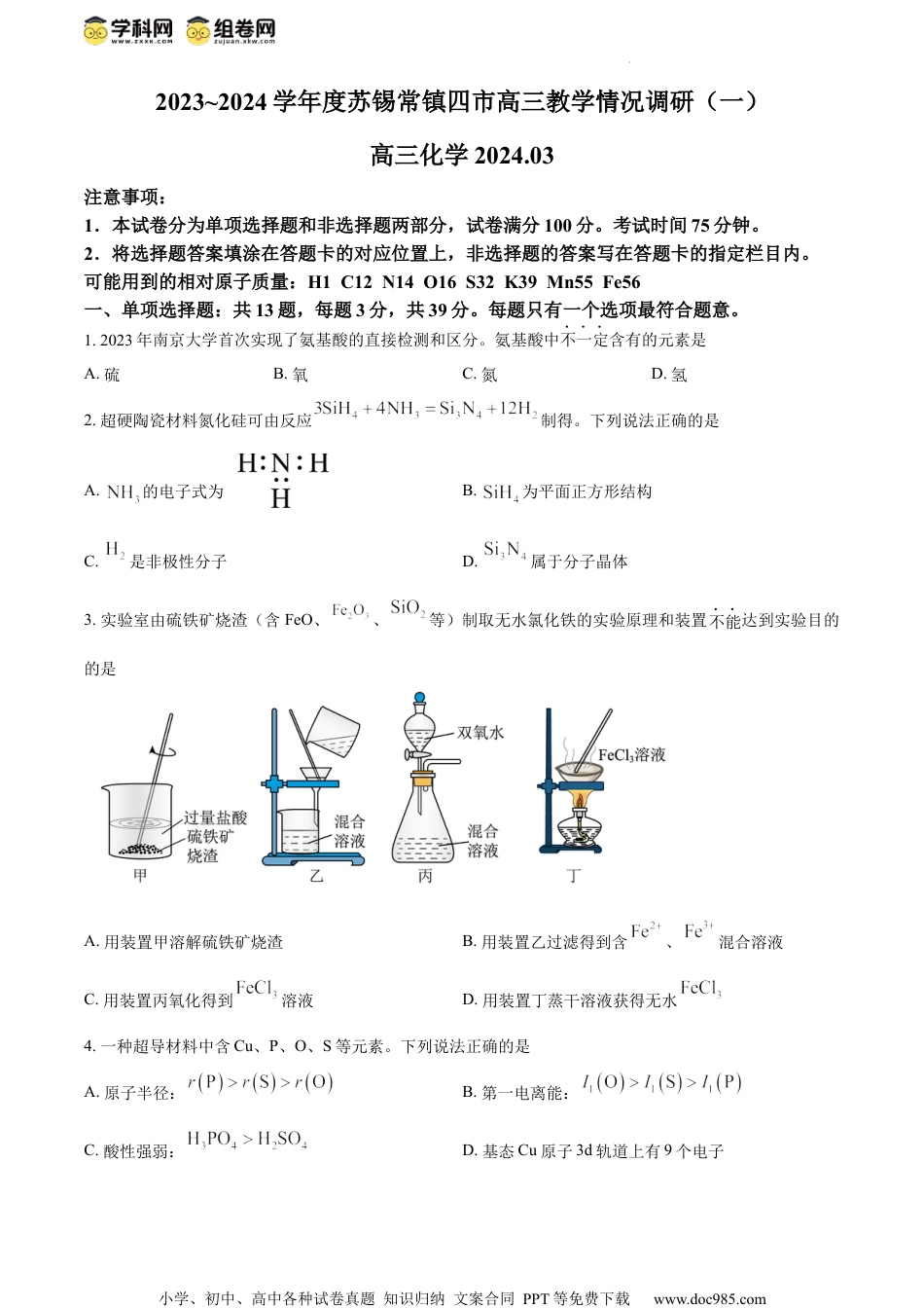 小学、初中、高中各种试卷真题知识归纳文案合同PPT等免费下载www.doc985.com2023~2024学年度苏锡常镇四市高三教学情况调研(一)高三化学2024.03注意事项:1.本试卷分为单项选择题和非选择题两部分,试卷满分100分。考试时间75分钟。2.将选择题答案填涂在答题卡的对应位置上,非选择题的答案写在答题卡的指定栏目内。可能用到的相对原子质量:H1C12N14O16S32K39Mn55Fe56一、单项选择题:共13题,每题3分,共39分。每题只有一个选项最符合题意。1.2023年南京大学首次实现了氨基酸的直接检测和区分。氨基酸中不一定含有的元素是A.硫B.氧C.氮D.氢2.超硬陶瓷材料氮化硅可由反应制得。下列说法正确的是A.的电子式为B.为平面正方形结构C.是非极性分子D.属于分子晶体3.实验室由硫铁矿烧渣(含FeO、、等)制取无水氯化铁的实验原理和装置不能达到实验目的的是A.用装置甲溶解硫铁矿烧渣B.用装置乙过滤得到含、混合溶液C.用装置丙氧化得到溶液D.用装置丁蒸干溶液获得无水4.一种超导材料中含Cu、P、O、S等元素。下列说法正确的是A.原子半径:B.第一电离能:C.酸性强弱:D.基态Cu原子3d轨道上有9个电子小学、初中、高中各种试卷真题知识归纳文案合同PPT等免费下载www.doc985.com5.与水反应可产生,液氨发生微弱电离产生,液氨能与碱金属(如Na、K)反应产生。下列说法正确的是A.中σ键与π键的数目比例为1∶1B.液氨电离可表示为:C.的结构式为D.中存在Mg与之间的强烈相互作用6.中一个H被取代可得,常温下为液体,具有很高的燃烧热(622.1kJ⋅mol)。以硫酸为电解质,通过催化电解可将转化为;碱性条件下,NaClO氧化也可制备。下列化学反应表示正确的是A.肼在氧气中燃烧:kJ⋅molB.液氨与钠反应:C.NaClO氧化制备:D.电解法制备的阴极反应:7.下列物质结构与性质或物质性质与用途不具有对应关系的是A.分子间存在氢键,极易溶于水B.液氨汽化时吸收大量的热,可用作制冷剂C.中N原子能与形成配位键,的水溶液呈碱性D.具有还原性,可用作燃料电池的燃料8.铁及其化合物的转化具有重要应用。下列说法正确的是A.工业制硫酸涉及的物质转化:B.实验室制溴苯涉及的物质转化:,小学、初中、高中各种试卷真题知识归纳文案合同PPT等免费下载www.doc985.comC.利用高温水蒸气处理铁器的化学方程式:D.利用铁粉从AgCl中获取Ag的离子方程式:9.化合物Z是一种有机合成中的重要中间体,其部分合成路线如下:下列说法正确的是A.Y与Z分子均存在顺反异构体B.用酸性高锰酸钾溶液鉴别X和YC.X、Y、Z三种物质中,Y在水中的溶解度最大D.Z与足量加成后的产物中有3个手性碳原子10.对于反应,下列有关说法正确的是A.该反应的B.该反应平衡常数的表达式为C.反应中每消耗22.4L(标准状况),转移电子数约为D.温度不变,提高或增大反应压强,均能提高反应速率和的转化率11.探究NaClO溶液的性质,下列实验方案能达到探究目的的是选项探究目的实验方案A检验NaClO溶液中的用洁净的铂丝蘸取少量NaClO溶液,在酒精灯上灼烧,透过蓝色钴玻璃观察火焰颜色B检验NaClO溶液将NaClO溶液滴加到淀粉KI溶液中,观察溶液颜色变化小学、初中、高中各种试卷真题知识归纳文案合同PPT等免费下载www.doc985.com的氧化性C检验NaClO溶液的pH用洁净的玻璃棒蘸取NaClO溶液滴在pH试纸上,待变色后与标准比色卡比对D检验NaClO溶液的还原产物将少量NaClO溶液与充分反应后,滴加硝酸酸化的硝酸银溶液,观察沉淀产生情况A.AB.BC.CD.D12.室温下,通过矿物中获得的过程如下:已知:,。下列说法正确的是A.溶液中:B.反应正向进行,需满足C.“脱硫”后上层清液中:D.悬浊液加入“溶解”过程中,溶液中浓度逐渐减小13.采用热分解法脱除沼气中的过程中涉及的主要反应为反应Ⅰ:kJ⋅mol反应Ⅱ:kJmol保持100kPa不变,将与按2∶1体积比投料,并用稀释,在不同温度下反应达到平衡时,所得、与的体积分数如题13图所示。下列说法正确的是小学、初中、高中各种试卷真题知识归纳文案合同PPT等免费下载www.doc985.com题13图A.反应的kJ⋅molB.曲线Y代表的是的平衡体积分数C.高于1050℃时,平衡转化率与平衡转化率的差值随温度升高减小D.1050℃下反应,增大体系的压强,平衡后...