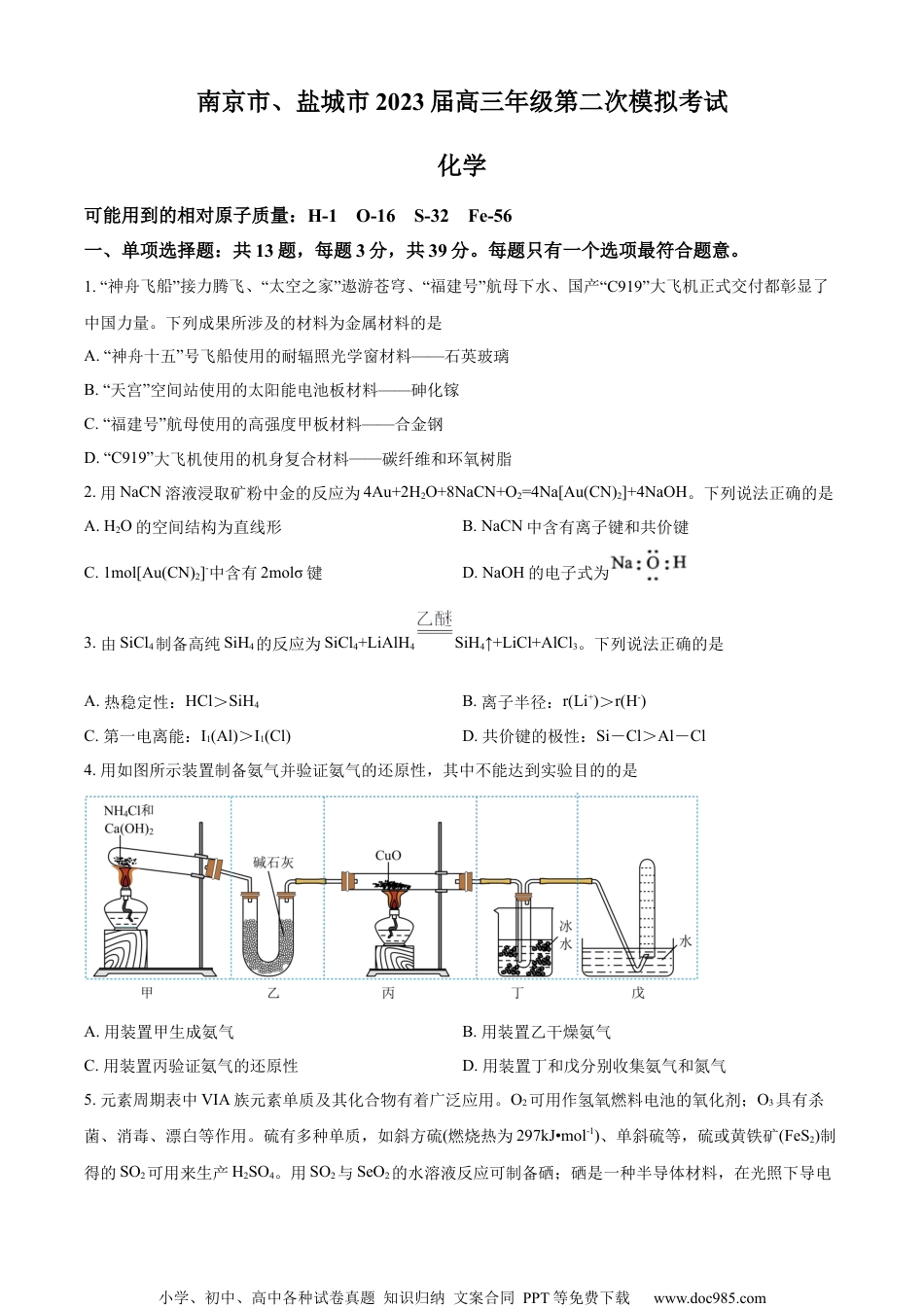 小学、初中、高中各种试卷真题知识归纳文案合同PPT等免费下载www.doc985.com南京市、盐城市2023届高三年级第二次模拟考试化学可能用到的相对原子质量:H-1O-16S-32Fe-56一、单项选择题:共13题,每题3分,共39分。每题只有一个选项最符合题意。1.“神舟飞船”接力腾飞、“太空之家”遨游苍穹、“福建号”航母下水、国产“C919”大飞机正式交付都彰显了中国力量。下列成果所涉及的材料为金属材料的是A.“神舟十五”号飞船使用的耐辐照光学窗材料——石英玻璃B.“天宫”空间站使用的太阳能电池板材料——砷化镓C.“福建号”航母使用的高强度甲板材料——合金钢D.“C919”大飞机使用的机身复合材料——碳纤维和环氧树脂2.用NaCN溶液浸取矿粉中金的反应为4Au+2H2O+8NaCN+O2=4Na[Au(CN)2]+4NaOH。下列说法正确的是A.H2O的空间结构为直线形B.NaCN中含有离子键和共价键C.1mol[Au(CN)2]-中含有2molσ键D.NaOH的电子式为3.由SiCl4制备高纯SiH4的反应为SiCl4+LiAlH4SiH4↑+LiCl+AlCl3。下列说法正确的是A.热稳定性:HCl>SiH4B.离子半径:r(Li+)>r(H-)C.第一电离能:I1(Al)>I1(Cl)D.共价键的极性:Si-Cl>Al-Cl4.用如图所示装置制备氨气并验证氨气的还原性,其中不能达到实验目的的是A.用装置甲生成氨气B.用装置乙干燥氨气C.用装置丙验证氨气的还原性D.用装置丁和戊分别收集氨气和氮气5.元素周期表中VIA族元素单质及其化合物有着广泛应用。O2可用作氢氧燃料电池的氧化剂;O3具有杀菌、消毒、漂白等作用。硫有多种单质,如斜方硫(燃烧热为297kJ•mol-1)、单斜硫等,硫或黄铁矿(FeS2)制得的SO2可用来生产H2SO4。用SO2与SeO2的水溶液反应可制备硒;硒是一种半导体材料,在光照下导电小学、初中、高中各种试卷真题知识归纳文案合同PPT等免费下载www.doc985.com性可提高近千倍。下列说法正确的是A.基态氧原子价电子的轨道表示式为B.斜方硫和单斜硫互为同素异形体C.SO2是由极性键构成的非极性分子D.SeO2分子中O-Se-O的键角大于120°6.元素周期表中VIA族元素单质及其化合物有着广泛应用。O2可用作氢氧燃料电池的氧化剂;O3具有杀菌、消毒、漂白等作用。硫有多种单质,如斜方硫(燃烧热为297kJ•mol-1)、单斜硫等,硫或黄铁矿(FeS2)制得的SO2可用来生产H2SO4。用SO2与SeO2的水溶液反应可制备硒;硒是一种半导体材料,在光照下导电性可提高近千倍。下列化学反应表示不正确的是A.碱性氢氧燃料电池放电时的正极反应:O2+2H2O+4e-=4OH-B.斜方硫的燃烧:S(s,斜方硫)+O2(g)=SO2(g)△H=297kJ•mol-1C.煅烧黄铁矿获得SO2:4FeS2+11O28SO2+2Fe2O3D.SO2与SeO2的水溶液反应制备硒:2SO2+SeO2+2H2O=Se↓+2H2SO47.元素周期表中VIA族元素单质及其化合物有着广泛应用。O2可用作氢氧燃料电池的氧化剂;O3具有杀菌、消毒、漂白等作用。硫有多种单质,如斜方硫(燃烧热为297kJ•mol-1)、单斜硫等,硫或黄铁矿(FeS2)制得的SO2可用来生产H2SO4。用SO2与SeO2的水溶液反应可制备硒;硒是一种半导体材料,在光照下导电性可提高近千倍。下列物质性质与用途具有对应关系的是A.臭氧有强氧化性,可用于水体杀菌消毒B.浓硫酸有脱水性,可用于干燥某些气体C.二氧化硫有还原性,可用于织物的漂白D.硒单质难溶于水,可用于制造硒光电池8.一种电解法制备Na2FeO4的装置如图所示。下列说法正确的是A.电解时化学能转化为电能B.电解时应将铂电极与直流电源正极相连C.电解过程中转移2mole-,理论上可获得标准状况下的H211.2L小学、初中、高中各种试卷真题知识归纳文案合同PPT等免费下载www.doc985.comD.电解时铁电极反应式:Fe-6e-+8OH-=FeO+4H2O9.化工原料Z是X与HI反应的主产物,X→Z的反应机理如图:下列说法正确的是A.X分子中所有碳原子位于同一平面上B.Y与Z中碳原子杂化轨道类型相同C.X与Z分子中均含有1个手性碳原子D.X与HI反应有副产物CH3CH2CH2CH2I产生10.反应2NO(g)+2CO(g)=2CO2(g)+N2(g)ΔH<0可用于处理汽车尾气。下列说法正确的是A.该反应在任何温度下都能自发进行B.上述反应平衡常数K=C.其他条件相同,增大体系压强,能提高NO的平衡转化率D.其他条件相同,提高c(CO),正反应速率加快,逆反应速率减慢11.以一定浓度NaOH溶液...