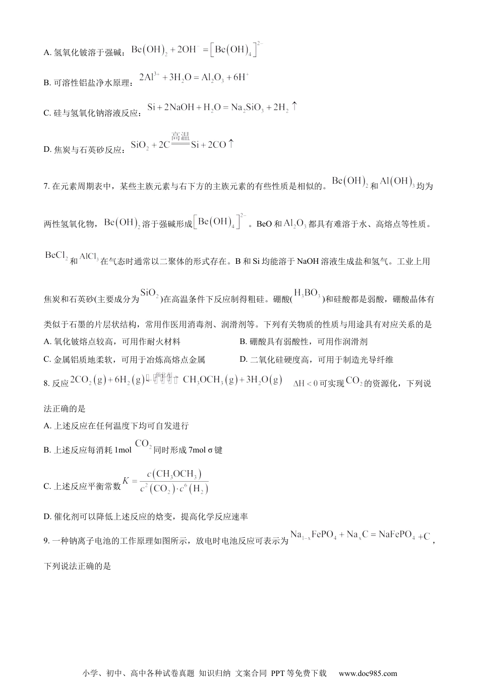 小学、初中、高中各种试卷真题知识归纳文案合同PPT等免费下载www.doc985.com2023届江苏省南京市高三5月第二次模拟考试化学试题注意事项:1.本试卷考试时间为75分钟,试卷满分100分,考试形式闭卷;2.本试卷中所有试题必须作答在答题卡规定的位置,否则不给分;3.答题前,务必将自己的学校、班级、姓名用0.5毫米黑色墨水签字笔填写在答题卡上。可能用到的相对原子质量:H1O16Na23S32Ca40Cu64一、单项选择题:共13题,每题3分,共39分。每题只有一个选项最符合题意。1.2023年3月,“三星堆”遗址考古又发掘出大量青铜器。火法炼铜主要发生的反应为,下列说法正确的是A.中铜的化合价为+2B.该反应为复分解反应C.是酸性氧化物D.反应中氧化剂仅为2.是良好的氧化剂和氟化剂,可通过反应制备,下列说法正确的是A.的电子式为F:FB.是非极性分子C.NaF是共价化合物D.基态Na原子的价层电子排布为3.下列有关实验室制取、收集并制备的实验原理和装置正确的是A.用装置甲制取B.用装置乙收集小学、初中、高中各种试卷真题知识归纳文案合同PPT等免费下载www.doc985.comC.用装置丙吸收D.用装置丁蒸干溶液获得4.反应可用于处理含磷废水,下列说法正确的是A.半径大小:B.酸性强弱:C.电离能大小:D.电负性大小:5.在元素周期表中,某些主族元素与右下方的主族元素的有些性质是相似的。和均为两性氢氧化物,溶于强碱形成。BeO和都具有难溶于水、高熔点等性质。和在气态时通常以二聚体的形式存在,的结构如图所示。B和Si均能溶于NaOH溶液生成盐和氢气。工业上用焦炭和石英砂(主要成分为)在高温条件下反应制得粗硅。硼酸()和硅酸都是弱酸,硼酸晶体有类似于石墨的片层状结构,常用作医用消毒剂、润滑剂等。下列说法正确的是A.中含有配位键B.的空间结构为平面正方形C.中的O-Si-O键角为120°D.晶体中存在的作用力只有共价键6.在元素周期表中,某些主族元素与右下方的主族元素的有些性质是相似的。和均为两性氢氧化物,溶于强碱形成。BeO和都具有难溶于水、高熔点等性质。和在气态时通常以二聚体的形式存在。B和Si均能溶于NaOH溶液生成盐和氢气。工业上用焦炭和石英砂(主要成分为)在高温条件下反应制得粗硅。硼酸()和硅酸都是弱酸,硼酸晶体有类似于石墨的片层状结构,常用作医用消毒剂、润滑剂等。下列化学反应表示不正确的是小学、初中、高中各种试卷真题知识归纳文案合同PPT等免费下载www.doc985.comA.氢氧化铍溶于强碱:B.可溶性铝盐净水原理:C.硅与氢氧化钠溶液反应:D.焦炭与石英砂反应:7.在元素周期表中,某些主族元素与右下方的主族元素的有些性质是相似的。和均为两性氢氧化物,溶于强碱形成。BeO和都具有难溶于水、高熔点等性质。和在气态时通常以二聚体的形式存在。B和Si均能溶于NaOH溶液生成盐和氢气。工业上用焦炭和石英砂(主要成分为)在高温条件下反应制得粗硅。硼酸()和硅酸都是弱酸,硼酸晶体有类似于石墨的片层状结构,常用作医用消毒剂、润滑剂等。下列有关物质的性质与用途具有对应关系的是A.氧化铍熔点较高,可用作耐火材料B.硼酸具有弱酸性,可用作润滑剂C.金属铝质地柔软,可用于冶炼高熔点金属D.二氧化硅硬度高,可用于制造光导纤维8.反应可实现的资源化,下列说法正确的是A.上述反应在任何温度下均可自发进行B.上述反应每消耗1mol同时形成7molσ键C.上述反应平衡常数D.催化剂可以降低上述反应的焓变,提高化学反应速率9.一种钠离子电池的工作原理如图所示,放电时电池反应可表示为,下列说法正确的是小学、初中、高中各种试卷真题知识归纳文案合同PPT等免费下载www.doc985.comA.放电时,电能转化为化学能B.放电时,Y极发生还原反应C.充电时,X极电极反应式为D.充电时,每转移1mol,Y极质量减少23g10.下列实验探究方案不能达到探究目的的是选项探究方案探究目的A向两支分别盛有2mL苯和2mL甲苯的试管中各加入几滴酸性高锰酸钾溶液,用力振荡,观察现象探究有机物中基团间的相互作用B用分液漏斗向盛有固体的锥形瓶中滴加乙酸溶液,将产生的气体通入盛有苯酚钠溶液的试管中,观察现象探究乙酸、碳酸和苯酚的酸性强弱C向两支试管中各加入2mL0.1溶液,分别放入盛有冷水和热水的两个烧杯中,...