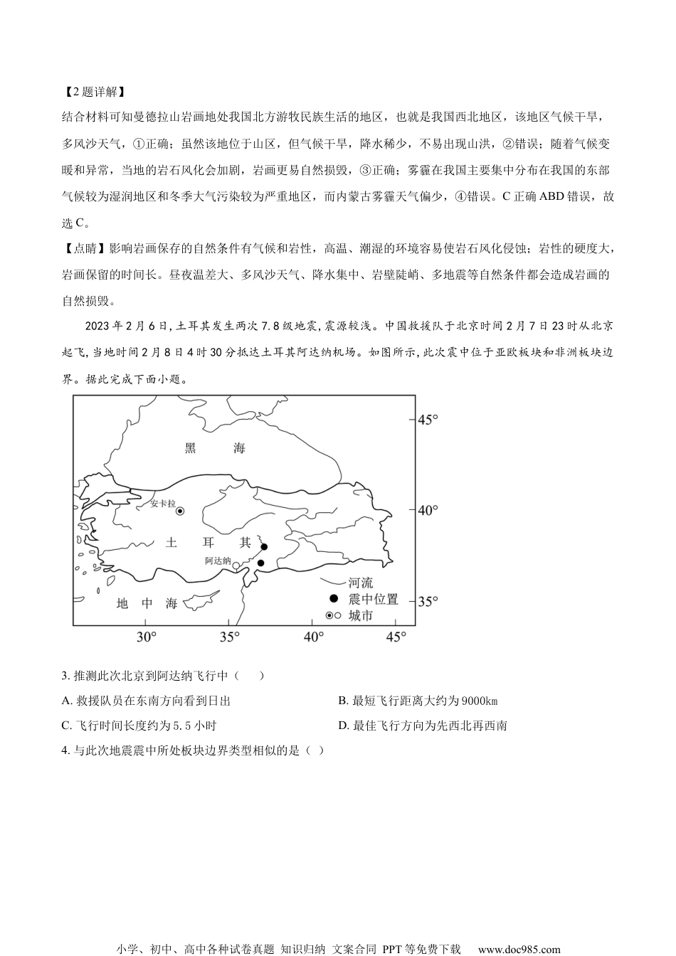 小学、初中、高中各种试卷真题知识归纳文案合同PPT等免费下载www.doc985.com南京市2023届高三第三次模拟考试地理本试卷满分100分,考试用时75分钟。班级:______姓名:______学号:______一、单项选择题:本大题共23小题,每小题2分,共46分。在每小题给出的四个选项中,只有一项是符合题目要求的。阿拉善盟曼德拉山岩画是北方游牧民族在不同历史阶段制作的绵长画卷,记录了自然环境和社会风貌。下图为曼德拉山岩画部分动物图案。据此完成下面小题。1.通过研究曼德拉山岩画动物类型推知古地理环境特征,是依据地理环境的()A.空间临近性B.区域整体性C.空间关联性D.区域差异性2.曼德拉山岩画的保护面临自然损毁,主要来自()①风沙侵蚀②山洪暴发③气候变化④雾霾多发A.①②B.③④C.①③D.②④【答案】1.B2.C【解析】【1题详解】曼德拉山岩画动物类型有各种动物,如山羊、骆驼、盘羊、黄羊、马等,反映出当时游牧民族在干旱半干旱环境下的游牧生活场景和饲养的牲畜,反映出当地地理环境的整体性特征,B正确;曼德拉山岩画动物类型并没有反映该地与周边地区的空间临近性和关联性,AB错误;岩画动物类型是适应当地自然环境,没有体现区域的差异性,D错误。ACD错误,B正确,故选B。小学、初中、高中各种试卷真题知识归纳文案合同PPT等免费下载www.doc985.com【2题详解】结合材料可知曼德拉山岩画地处我国北方游牧民族生活的地区,也就是我国西北地区,该地区气候干旱,多风沙天气,①正确;虽然该地位于山区,但气候干旱,降水稀少,不易出现山洪,②错误;随着气候变暖和异常,当地的岩石风化会加剧,岩画更易自然损毁,③正确;雾霾在我国主要集中分布在我国的东部气候较为湿润地区和冬季大气污染较为严重地区,而内蒙古雾霾天气偏少,④错误。C正确ABD错误,故选C。【点睛】影响岩画保存的自然条件有气候和岩性,高温、潮湿的环境容易使岩石风化侵蚀;岩性的硬度大,岩画保留的时间长。昼夜温差大、多风沙天气、降水集中、岩壁陡峭、多地震等自然条件都会造成岩画的自然损毁。2023年2月6日,土耳其发生两次7.8级地震,震源较浅。中国救援队于北京时间2月7日23时从北京起飞,当地时间2月8日4时30分抵达土耳其阿达纳机场。如图所示,此次震中位于亚欧板块和非洲板块边界。据此完成下面小题。3.推测此次北京到阿达纳飞行中()A.救援队员在东南方向看到日出B.最短飞行距离大约为9000kmC.飞行时间长度约为5.5小时D.最佳飞行方向为先西北再西南4.与此次地震震中所处板块边界类型相似的是()小学、初中、高中各种试卷真题知识归纳文案合同PPT等免费下载www.doc985.comA.AB.BC.CD.D【答案】3.D4.C【解析】【3题详解】2月8日,太阳直射点位于南半球,北半球日出晚于地方时6:00,飞行过程都是在夜间,看不到日出,A错误;北京和阿达纳的纬度相差不大,可以近似看成同一纬度即40°N,则两地的直线距离约为111×cos40°×80≈6802km,最短飞行距离应小于9000km,B错误;起飞时,北京时间为2月7日23时,土耳其阿达纳地方时约为17:20,降落时,阿达纳当地时间为2月8日4时30分,飞行时长约为11小时10分钟,C错误;最短飞行距离为两点之间的地球大圆的劣弧段;最佳飞行方向为先西北再西南,D正确。故选D。【4题详解】土耳其位于亚欧板块与非洲板块的消亡边界。图A中板块边界为非洲板块和印度洋板块的生长边界,A错误;图B中板块边界为非洲板块和印度洋、南极洲板块的生长边界,B错误;图C中板块边界为亚欧板块和太平洋板块的消亡边界,C正确;图D中板块边界为亚欧板块和美洲板块的生长边界,D错误。故选C。【点睛】最短航线:地球上两点间的最短航线为球面最短距离,即经过两点的大圆劣弧长度(大圆指的是过地心的平面与地面的交线)。图为亚洲局部地区某时刻500hPa等压面高度(m)分布示意图(近地面气压形势与此相似)。据此完成下面小题。小学、初中、高中各种试卷真题知识归纳文案合同PPT等免费下载www.doc985.com5.此时,山东5800m高空处的风向为()A.偏东风B.偏南风C.偏西风D.偏北风6.在图示大气形势下,近地面()A.湖南大部分地区晴朗少雨B.内蒙古风速比四川小C.黑龙江西北部天气晴热D.天津气压高于重庆7....