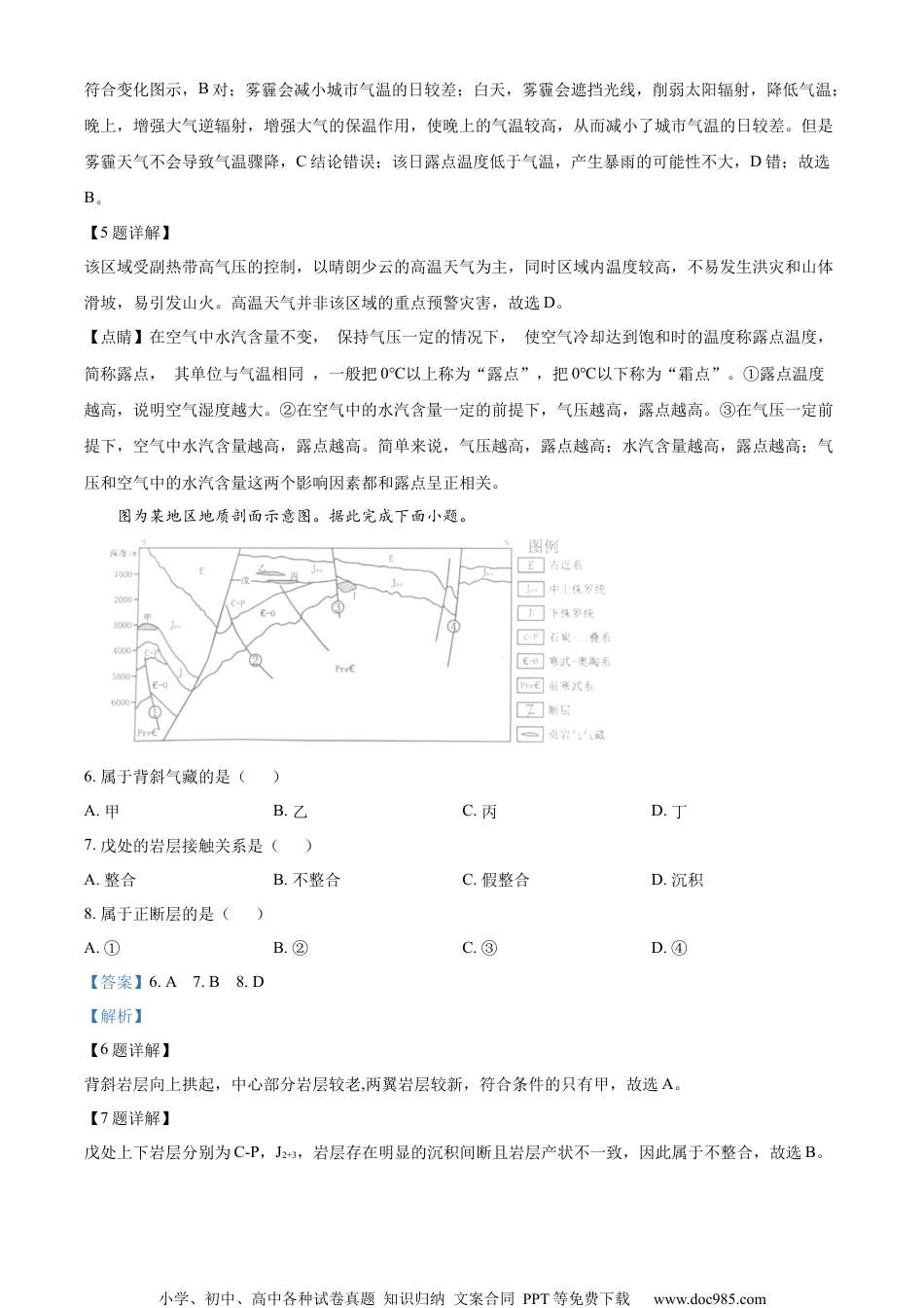 小学、初中、高中各种试卷真题知识归纳文案合同PPT等免费下载www.doc985.com连云港市2023届高三2月调研考试地理试题一、单项选择题:共23题,每题2分,共46分。每题只有一个选项最符合题意。2022年11月29日23时08分,搭载神舟十五号载人飞船的长征二号F遥十五运载火箭在酒泉卫星发射中心点火发射。神舟十五号载人飞船入轨后,成功对接于空间站天和核心舱前向端口。发射至成功对接整个过程历时约6.5小时。图示意四条晨昏线分布情况。据此完成下面小题。1.示意成功对接时刻的晨昏线是()A.甲B.乙C.丙D.丁2.神舟十五号载人飞船升空后,照到的第一缕阳光来自()A.东南方B.西南方C.东北方D.西北方【答案】1.B2.A【解析】【1题详解】根据材料可知,对接成功时间为北京时间11月30日05时38分,太阳直射南半球,北极圈存在极夜现象,北京位于东八区,此时太阳直射南半球,晨线与赤道的交点为地方时6点,而北京时间为5时38分,因此晨线与赤道的交点应当在120°E的东侧5.5°,结合北极圈此时为极夜现象,判断晨昏线乙符合,故选B。【2题详解】11月29日太阳直射南半球,太阳东南升起,西南落,A对;西南方为太阳直射南半球时的日落方向,B错;东北方为太阳直射北半球时的日出方向,C错;西北方为太阳直射北半球时的日落方向,D错;故选A。【点睛】晨昏线即晨昏圈,是指地球上昼半球和夜半球之间的分界线,是地球的大圆圈。春秋二分,全球小学、初中、高中各种试卷真题知识归纳文案合同PPT等免费下载www.doc985.com昼夜等长;冬夏二至,它同经线交角最大,全球昼夜长短差值最大,由于大气折光作用和太阳视半径的存在,它实际上比大圈略小。2022年8月我国长江流域出现大范围长时间的异常天气,某地区测量点测得气温单日极大值为45°C,突破历史极值。图左为该地区等高线地形图,图右为该地区8月逐日最高气温、最低气温与露点温度变化图。据此完成下面小题。3.该地气温单日极大值突破历史极值的主要原因是()A.山间谷地地形不易散热B.背风坡的焚风效应强C.受副热带高气压的控制D.受西南暖湿气流影响4.导致29日气温变化的直接原因可能是()A.台风B.冷锋C.雾霾D.暴雨5.该月需要重点预警的自然灾害是()A.高温B.洪灾C.滑坡D.山火【答案】3.C4.B5.D【解析】【3题详解】读图可知,图示区域自1日至28日,最低气温和最高气温之间温差较大,说明天气晴朗,云层较少,昼夜温差较大,并非谷地不易散热影响,况且28日之后气温迅速降低,昼夜温差减少,A错;区域位于30°N附近,受副高控制,高压控制之下风力较小且稳定,不易发生焚风效应,况且焚风效应会增温减湿,使得昼夜温差增大,图示区域昼夜温差在逐渐缩小,B错;受副热带高气压的控制以晴朗少云的高温天气为主,导致该地气温单日极大值突破历史极值,C对;暖湿气流控制之下,露点温度会升高,昼夜温差会降低,温度上升。读图可知,区域位于山间谷地,地形较为封闭,暖湿气流难以进入,况且在28日后出现了急剧降温趋势,故与暖湿气流关系不大,D错;故选C。【4题详解】台风为热带气旋,台风过境一般不会导致气温迅速下降,A结论错误;冷锋过境后气温降低,天气晴朗,小学、初中、高中各种试卷真题知识归纳文案合同PPT等免费下载www.doc985.com符合变化图示,B对;雾霾会减小城市气温的日较差;白天,雾霾会遮挡光线,削弱太阳辐射,降低气温;晚上,增强大气逆辐射,增强大气的保温作用,使晚上的气温较高,从而减小了城市气温的日较差。但是雾霾天气不会导致气温骤降,C结论错误;该日露点温度低于气温,产生暴雨的可能性不大,D错;故选B。【5题详解】该区域受副热带高气压的控制,以晴朗少云的高温天气为主,同时区域内温度较高,不易发生洪灾和山体滑坡,易引发山火。高温天气并非该区域的重点预警灾害,故选D。【点睛】在空气中水汽含量不变,保持气压一定的情况下,使空气冷却达到饱和时的温度称露点温度,简称露点,其单位与气温相同,一般把0℃以上称为“露点”,把0℃以下称为“霜点”。①露点温度越高,说明空气湿度越大。②在空气中的水汽含量一定的前提下,气压越高,露点越高。③在气压一定前提下,空气中水汽含量越高,露点越高。简...