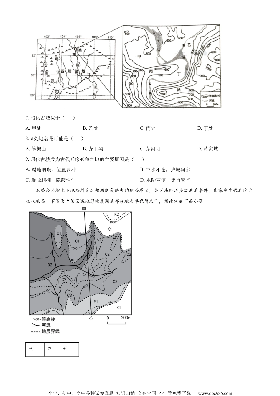 小学、初中、高中各种试卷真题知识归纳文案合同PPT等免费下载www.doc985.com南通市2023届高三第三次调研测试地理注意事项:考生在答题前请认真阅读本注意事项及各题答题要求1.满分为100分,考试时间为75分钟。考试结束后,请将答题卡交回。2.答题前,请务必将自己的姓名、准考证号用0.5毫米黑色墨水的签字笔填写在试卷及答题卡的规定位置。3.请认真核对监考员在答题卡上所粘贴的条形码上的姓名、准考证号与本人是否相符。4.作答选择题,必须用2B铅笔将答题卡上对应选项的方框涂满、涂黑;如需改动,请用橡皮擦干净后,再选涂其它答案。作答非选择题,必须用0.5毫米黑色墨水的签字笔在答题卡上的指定位置作答,在其它位置作答--律无效。5.如需作图,必须用2B铅笔绘.写清楚,线条、符号等须加黑、加粗。一、单项选择题:共23小题,每题2分,共46分。每题只有一个选项最符合题意。2023年3月24日,我国部分地区日落后的西方低空可观测到月球“遮掩”金星的现象,其原日全食相似。左图为“我国三城市入掩和出掩时间示意图",右图为“我国可观测月掩全呈现象的示意图”。据此完成下面小题。1.成都入掩时,昏线位置最接近()A.①B.②C.③D.④2.与成都相比,甲地不能全程观看月掩金星现象的原因是()A.月球公转B.月球自转C.地球公转D.地球自转小学、初中、高中各种试卷真题知识归纳文案合同PPT等免费下载www.doc985.com3.月掩金星现象发生时,与地球、月球、金星位置相符的示意图是()A.B.C.D.“弗雷迪”是2023年诞生于南印度洋的热带气旋。下图为“弗雷迪影响非洲时的移动路径及部分日期0时位置示意图”。据此完成下面小题。4.2月22日0时,甲地的风向是()A.偏东风B.偏西风C.偏南风D.偏北风5.2月21~23日,“弗雷迪”势力()A.先增强再减弱B.先减弱再增强C.持续增强D.持续减弱6.影响“弗雷迪”移动方向的主要因素是()A.洋流性质B.地形起伏C.地转偏向力D.大气环流昭化古城三面临水,四面环山,是古代兵家必争之地。下图为“昭化古城位置及地形示意图”。据此完成下面小题。小学、初中、高中各种试卷真题知识归纳文案合同PPT等免费下载www.doc985.com7.昭化古城位于()A.甲处B.乙处C.丙处D.丁处8.M处地名最可能是()A.笔架山B.龙王沟C.茅河坝D.黄家坡9.昭化古城成为古代兵家必争之地的主要原因是()A.蜀地咽喉,位置要冲B.三水相逢,护城河多C.群峰相拥,隐蔽性佳D.水陆两便,集市繁华不整合面指上下地层间有沉积间断或缺失的地层界面,某区域经历多次地质事件,出露中生代和晚古生代地层。下图为“该区域地形地质图及部分地质年代简表”,据此完成下面小题。代纪世小学、初中、高中各种试卷真题知识归纳文案合同PPT等免费下载www.doc985.com中生代白垩纪晚(K2)早(K1)侏罗纪晚(J3)中(J2)早(J1)三叠纪晚(T3)中(T2)早(T1)晚古二叠晚(P2小学、初中、高中各种试卷真题知识归纳文案合同PPT等免费下载www.doc985.com生代纪)早(P1)石灰纪晚(C3)中(C2)早(C1)泥盆纪晚(D3)中(D2)早(D1)10.下列地层界面为不整合面的是()A.Kl-K2B.C1-C2C.C3-P1D.Pl-K111.该区域经历的显著地壳抬升运动至少有()A.1次B.2次C.3次D.4次小学、初中、高中各种试卷真题知识归纳文案合同PPT等免费下载www.doc985.com12.下列四幅剖面图中,与甲-乙剖面相符的是()A.B.C.D.虹吸效应是中心城市从周边地区集聚生产要素和经济活动,而扩散效应反之。下图为“城市群中心城市空间溢出效应的时间演变示意图”。据此完成下面小题。13.中心城市与外围城市间发展差距开始缩小的时间是()小学、初中、高中各种试卷真题知识归纳文案合同PPT等免费下载www.doc985.comA.t0B.t1C.t₂D.t₃14.下列城市群中,最有可能处于Ⅲ阶段的是()A.京津冀城市群B.长三角城市群C.北部湾城市群D.辽中南城市群15.为促进区域协调发展,处于Ⅲ阶段的城市群战略重心是()A.加速中心城市要素集聚B.合理布局城市功能分区C.增强外围空间承接能力D.改善区域生态环境质量赫哲族分布于黑龙江省,撮罗昂库是其渔猎时期的一种简易窝棚用圆木杆搭成锥形架子,苫草覆盖表面,一般用于夏秋捕鱼季居住。赫哲族的住宅经历了临时性窝棚...