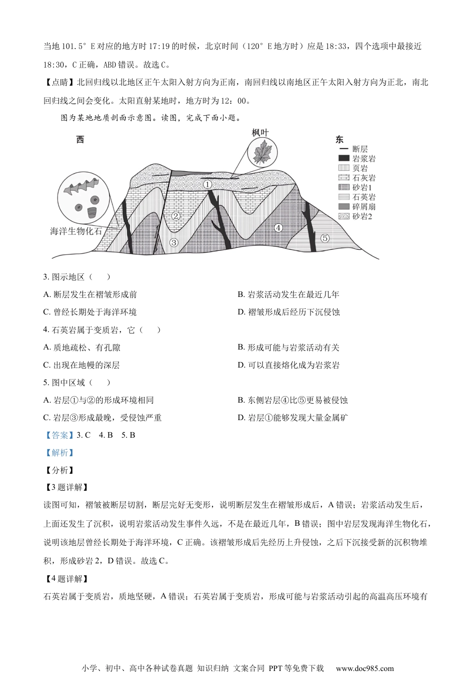 小学、初中、高中各种试卷真题知识归纳文案合同PPT等免费下载www.doc985.com高三地理一模模拟试卷一、选择题(每题2分,共46分)云南古城楚雄(的彝族十月太阳历文化园内建有观象台(图左),其顶部广场矗立着十根龙腾神柱(图右)。神柱位置按照彝族古老的“立杆测影定季节”原理确定,其中东西两侧的6根神柱分别对应二分二至日的日出、日落方位。完成下面小题。1.一年中,影子只能投射到祖先神柱上一次的是()A.龙神柱B.羊神柱C.火神柱D.虎神柱2.2023年12月22日7:55,虎神柱的影子投射在祖先神柱上。推测这一天羊神柱的影子投射在祖先神柱上的时刻最接近()A.16:05B.17:30C.18:30D.19:05【答案】1.A2.C【解析】【1题详解】由图可知,羊神柱位于祖先神柱的西南,古城楚雄位于北回归线以北,下午时太阳方位位于西南,所以全年均有可能,B错误;火神柱位于祖先神柱的正南,楚雄位于北回归线以北,一年中任何一天正午太阳都在正南方,因此火神柱的影子很多天都会投射到祖先神柱,C错误;虎神柱位于祖先神柱的东南,而当地上午时太阳方位位于东南,所以全年均有可能,D错误;而龙神柱位于祖先神柱的西北,需要太阳在龙神柱西北侧且位于祖先神柱和龙神柱连线的延长线上,可能在夏至时太阳移动到最北端时发生投射,最可能一年中只有一次,A正确。故选A。【2题详解】北京时间(120°E地方时)7:55,当地101.5°E对应的地方时应是6:41,相当于楚雄当地地方时6:41虎神柱的影子投射在祖先神柱上,据图示可知虎神柱和羊神柱关于正南对称,而太阳位于正南方位时对应当地地方时12时,所以当羊神柱的影子投射在祖先神柱上的地方时应该是12+(12:00-6:41)=17:19,小学、初中、高中各种试卷真题知识归纳文案合同PPT等免费下载www.doc985.com当地101.5°E对应的地方时17:19的时候,北京时间(120°E地方时)应是18:33,四个选项中最接近18:30,C正确,ABD错误。故选C。【点睛】北回归线以北地区正午太阳入射方向为正南,南回归线以南地区正午太阳入射方向为正北,南北回归线之间会变化。太阳直射某地时,地方时为12:00。图为某地地质剖面示意图。读图,完成下面小题。3.图示地区()A.断层发生在褶皱形成前B.岩浆活动发生在最近几年C.曾经长期处于海洋环境D.褶皱形成后经历下沉侵蚀4.石英岩属于变质岩,它()A.质地疏松、有孔隙B.形成可能与岩浆活动有关C.出现在地幔的深层D.可以直接熔化成为岩浆岩5.图中区域()A.岩层①与②的形成环境相同B.东侧岩层④比⑤更易被侵蚀C.岩层③形成最晚,受侵蚀严重D.岩层①能够发现大量金属矿【答案】3.C4.B5.B【解析】【分析】【3题详解】读图可知,褶皱被断层切割,断层完好无变形,说明断层发生在褶皱形成后,A错误;岩浆活动发生后,上面还发生了沉积,说明岩浆活动发生事件久远,不是在最近几年,B错误;图中岩层发现海洋生物化石,说明该地层曾经长期处于海洋环境,C正确。该褶皱形成后先经历上升侵蚀,之后下沉接受新的沉积物堆积,形成砂岩2,D错误。故选C。【4题详解】石英岩属于变质岩,质地坚硬,A错误;石英岩属于变质岩,形成可能与岩浆活动引起的高温高压环境有小学、初中、高中各种试卷真题知识归纳文案合同PPT等免费下载www.doc985.com关,B正确;石英岩属于变质岩,是砂岩在岩浆活动过程中在高温高压环境下通过变质作用形成的,一般出现在地壳的深层,地幔的深层不是岩浆上涌的地方,C错误;石英岩属于变质岩,直接熔化生成新的岩浆,不能融化成为岩浆岩,D错误。故选B。【5题详解】读图可知,岩层①是砂岩,由枫叶化石,形成环境是陆地环境,岩层②是石灰岩,有海洋生物化石,形成环境是海洋环境,岩层①与②的形成环境不同,A错误;东侧岩层④是砂岩,质地疏松,⑤是石英岩,质地坚硬,岩层④比⑤更易被侵蚀,B正确;岩层③位于岩层①、岩层②的下方,形成时间较早,C错误;岩层①属于沉积岩,不能发现大量金属矿,金属矿形成与岩浆活动有关,D错误。故选B。【点睛】三大岩石为岩浆岩、沉积岩和变质岩。岩浆岩代表:花岗岩、闪长岩、辉长岩、辉绿岩、玄武岩等。沉积岩代表:石灰岩、砂岩、页岩等。变质岩代表:大理岩、板岩、片岩、片...