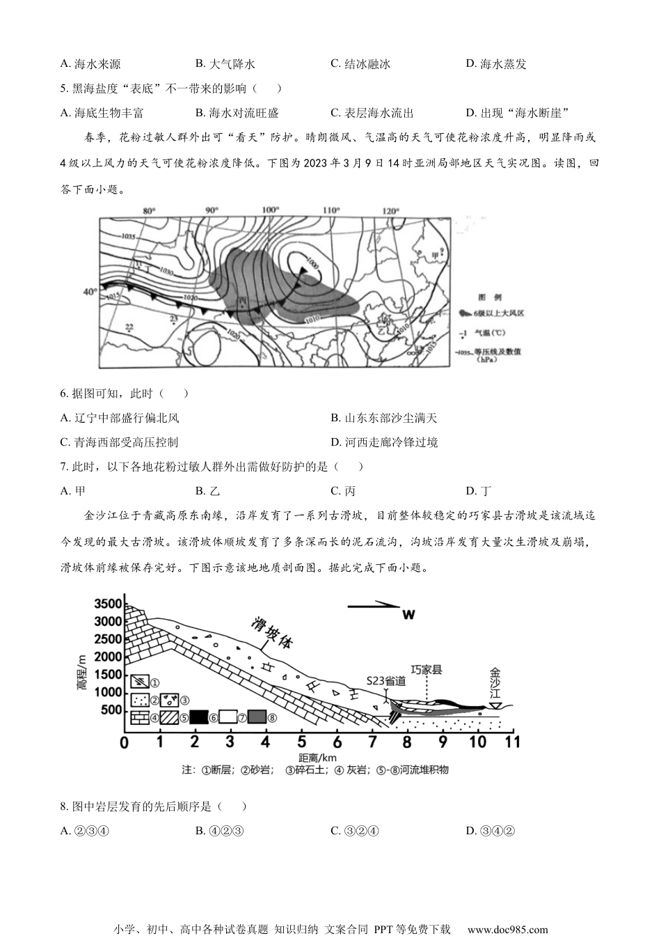 小学、初中、高中各种试卷真题知识归纳文案合同PPT等免费下载www.doc985.com2023届苏州市高三二模考前模拟卷(四)地理共100分考试用时75分钟注意事项:1.答卷前,考生务必用黑色字迹的钢笔或签字笔将自己的姓名和考生号、考试号、座位号填写在答题卡上。2.选择题每小题选出答案后,用“2B”铅笔把答题卡上对应题目选项的答案信息点涂黑,如需改动,用橡皮擦干净后,再选涂其他答案,答案不能答在试卷上。3.非选择题必须用黑色字迹钢笔或签字笔作答,答案必须写在答题卡各题目指定区域内相应位置上;如需改动,先划掉原来的答案,然后再写上新的答案;不准使用铅笔和涂改液,不按以上要求作答的答案无效。4.考生必须保持答题卡的整洁。考试结束后,将试卷和答题卡一并交回。第Ⅰ卷(选择题共46分)一、单项选择题:本大题共23小题,每小题2分,共46分。在每小题给出的四个选项中,只有一项是符合题目要求的。莲花湖(左图)是在妫水河河道上建橡胶坝拦河蓄水成湖,环湖有全长2360米的步道,是人们休闲漫步的良好去处。小明到湖边游玩,拍摄到“七九河开,落霞满天(数九即是从冬至日算起,每九天算一‘九’)”的美丽景色(右图)。读图,完成下面小题。小学、初中、高中各种试卷真题知识归纳文案合同PPT等免费下载www.doc985.com1.下列说法正确的是()A.左图比例尺约为1/100000B.小明游湖的节气在清明前后C.河流流向应为自西向东D.小明拍照的位置应该在①处2.小明发现湖面北侧近岸的湖冰已经融化,而湖面南侧近岸大面积湖冰依然封冻,原因可能是()A.湖的北侧近岸朝阳,热量条件好B.湖的南侧近岸背阴,光照较充足C.湖的北侧近岸植被茂盛,风速快D.湖的南侧近岸平直,水流速度快黑海(下图)是一个双层海,深层水脱胎于古地中海的海盆,北部有多瑙河、第聂伯河、顿河等多条河流注入。读图完成下面小题。3.关于黑海南北坡度差异主要原因是()①北部风力沉积;②南部海水侵蚀;③北部河流注入,泥沙沉积严重;④小亚细亚半岛受板块挤压抬升A.①②B.①③C.②④D.③④4.由于黑海盐度“表底”不一,被称为双层海,其成因是()小学、初中、高中各种试卷真题知识归纳文案合同PPT等免费下载www.doc985.comA.海水来源B.大气降水C.结冰融冰D.海水蒸发5.黑海盐度“表底”不一带来的影响()A.海底生物丰富B.海水对流旺盛C.表层海水流出D.出现“海水断崖”春季,花粉过敏人群外出可“看天”防护。晴朗微风、气温高的天气可使花粉浓度升高,明显降雨或4级以上风力的天气可使花粉浓度降低。下图为2023年3月9日14时亚洲局部地区天气实况图。读图,回答下面小题。6.据图可知,此时()A.辽宁中部盛行偏北风B.山东东部沙尘满天C.青海西部受高压控制D.河西走廊冷锋过境7.此时,以下各地花粉过敏人群外出需做好防护的是()A.甲B.乙C.丙D.丁金沙江位于青藏高原东南缘,沿岸发育了一系列古滑坡,目前整体较稳定的巧家县古滑坡是该流域迄今发现的最大古滑坡。该滑坡体顺坡发育了多条深而长的泥石流沟,沟坡沿岸发育大量次生滑坡及崩塌,滑坡体前缘被保存完好。下图示意该地地质剖面图。据此完成下面小题。8.图中岩层发育的先后顺序是()A.②③④B.④②③C.③②④D.③④②小学、初中、高中各种试卷真题知识归纳文案合同PPT等免费下载www.doc985.com9.与上部基岩山地相比,古滑坡体内泥石流多发的主要原因是()A.地形较为陡峻B.降水变率大C.堆积物较松散D.植被覆盖率低10.目前巧家县古滑坡整体较稳定的主要原因是()A.河流剧烈侵蚀滑坡体前缘B.地质构造运动相对较平稳C.区域性暴雨频次显著减少D.滑坡体受侵蚀已基本解体青藏高原是我国典型的高山区,坡向和海拔对高寒山地草甸植被分布影响较大。某科研团队选取青藏高原东段的巴卡台农牧场作为研究对象,该地平均海拔3700米,平均坡度为6°~9°。图1为不同样地物种累积曲线、图2为不同样地植被功能群相对多度。据此完成下面小题。11.下列关于不同样地物种累积的比较,正确的是()A.阳坡>阴坡>山脊B.阳坡>山脊>阴坡C.阴坡>山脊>阳坡D.阴坡>阳坡>山脊12.图2中I、Ⅱ、Ⅲ分别代表的植被可能为(注:禾本科多数为草本植物,少数为木质植物;...