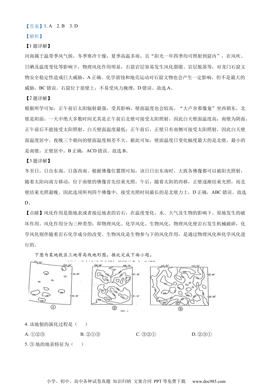 小学、初中、高中各种试卷真题知识归纳文案合同PPT等免费下载www.doc985.com2023届高三年级第一次调研测试地理试题注意事项考生在答题前请认真阅读本注意事项及各题答题要求1.本试卷共8页,满分为100分,考试时间为75分钟。考试结束后,请将本试卷和答题卡一并交回。2.答题前,请务必将自己的姓名、准考证号用0.5毫米黑色墨水的签字笔填写在试卷及答题卡的规定位置。3.请认真核对监考员在答题卡上所粘贴的条形码上的姓名、准考证号与本人是否相符。4.作答选择题,必须用2B铅笔将答题卡上对应选项的方框涂满、涂黑;如需改动,请用橡皮擦干净后,再选涂其他答案。作答非选择题,必须用0.5毫米黑色墨水的签字笔在答题卡上的指定位置作答,在其他位置作答一律无效。5.如需作图,必须用2B铅笔绘、写清楚,线条、符号等须加黑、加粗。一、单项选择题:共22题,每题2分,共44分。每题只有一个选项最符合题意。龙门石窟位于河南省洛阳市,是我国珍贵的石刻艺术宝库,也是我国第一批重点文物保护单位。其中“大卢舍那像龛”坐西朝东,是龙门石窟规模最大的摩崖像龛,窟内共有九尊造像,阳光一年四季均可照射到窟内。下图为大卢舍那像龛造像位置示意图。据此完成下面小题。1.对龙门石窟文物安全稳定性威胁最大的是()A.物理风化B.化学溶蚀C.地壳运动D.风力掩埋2.“大卢舍那像龛”不同朝向壁面温度日变化幅度()A.南壁>正壁>北壁B.北壁>正壁>南壁C.正壁>北壁>南壁D.正壁>南壁>北壁3.冬至日,接受光照时间最长的是()A.卢舍那大佛B.迦叶C.文殊菩萨D.北壁力士小学、初中、高中各种试卷真题知识归纳文案合同PPT等免费下载www.doc985.com【答案】1.A2.B3.D【解析】【1题详解】河南属于温带季风气候,冬季寒冷干燥,夏季高温多雨,且“阳光一年四季均可照射到窟内”,在风吹、日晒及温度变化等影响下,物理风化作用明显,石窟岩层容易发生风化裂隙、岩层脱落等,对龙门石窟文物安全稳定性造成巨大威胁,A正确。化学溶蚀和地壳运动对石窟文物也会产生一定影响,但不是最大的威胁,BC错误。石窟位于崖壁上,不易受风力掩埋,D错误。故选A。【2题详解】根据所学可知,正午前后太阳辐射最强,受其影响,壁面温度也会较高。“大卢舍那像龛”坐西朝东,北壁是阳面,一天中绝大多数时间尤其是正午前后北壁可接受太阳照射,因此白天壁面温度高;南壁为阴面,正午前后不能接受太阳照射,白天壁面温度最低;正午前后,正壁只有南侧可接受太阳照射,因此白天壁面温度居中。夜晚三个朝向的壁面温度相差不大。据此可知,壁面温度日变化幅度最大的是北壁,最小的是南壁,正壁居中,B正确,ACD错误。故选B。【3题详解】冬至日,日出东南,日落西南。根据佛像位置图可知,该日日出东南时,大致各佛像都可以被阳光照射,随着太阳向南方移动,位于南壁的佛像首先结束光照,午后,随着太阳的西移,正壁逐渐结束光照,而北壁结束光照最晚。因此选项所列四个佛像中,接受光照时间最长的是北壁力士,D正确,ABC错误。故选D。【点睛】风化作用是指地表或者接近地表的岩石,在温度变化、水、大气及生物的影响下,原地发生的破坏作用。风化作用分为三种类型:即物理风化、化学风化、生物风化。物理风化使岩石发生机械破碎,化学风化则伴随着岩石化学成分的改变。生物风化是生物参与下的风化作用,是通过物理风化和化学风化进行的。下图为某地貌区三地等高线地形图。据此完成下面小题。4.该地貌的演化过程是()A.①②③B.②①③C.③②①D.②③①5.③地的地表特征为()小学、初中、高中各种试卷真题知识归纳文案合同PPT等免费下载www.doc985.comA.暗河交错,别有洞天B.笋柱相间,多姿多彩C.墚峁交织,千沟万壑D.奇峰林立,崎岖不平【答案】4.D5.D【解析】【4题详解】根据三图的地理位置可知,三地位于我国南方地区。结合等高线地形图可知,②③两地海拔较高,且地势起伏较大,可知三地位于我国南方低山丘陵地区。南方地区降水多,流水作用显著,受流水侵蚀(溶蚀)、搬运等作用影响,高海拔地区地势会逐渐变低,因此可知,该地貌的演化过程为②③①,D正确,ABC错误。故选D。【5题详解】暗河、笋柱(石笋、石柱)等属于地...