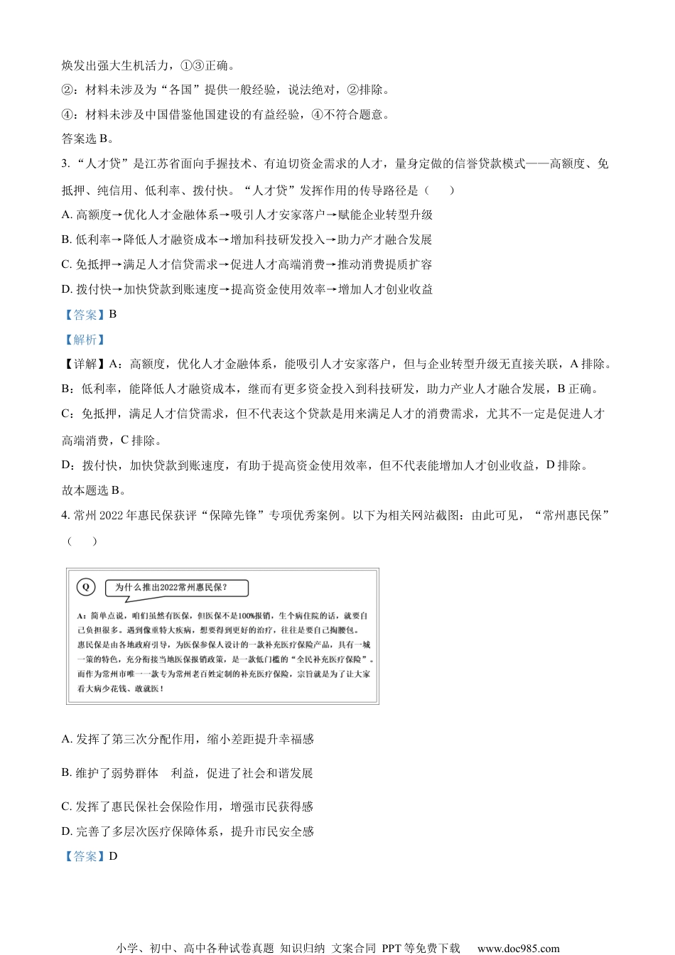 小学、初中、高中各种试卷真题知识归纳文案合同PPT等免费下载www.doc985.com2022~2023学年度苏锡常镇四市高三教学情况调研政治试题(一)一、选择题。1.世界社会主义500多年的曲折历史可以划分为六个“时间段”,见下图:了解这一发展历程,能够帮助我们更好地()A.认识人类社会发展的一般规律,增强理论自信B.体验人民群众的历史主体作用,坚持人民至上C.理解中国特色社会主义的来龙去脉,坚定道路自信D.认清资本主义制度的历史局限性,坚持唯物史观【答案】C【解析】【详解】ABD:题干强调的是社会主义的发展历程,故ABD不符合题意。C:了解社会主义发展的6个阶段,能够帮助我们理解中国特色社会主义的发展历程,坚持道路自信,故C符合题意。故本题选C。2.中国共产党以马克思主义为行动指南,领导中国人民成功走出中国式现代化道路,破解了人类社会发展的诸多难题,拓展了发展中国家走向现代化的途径,为人类对更好社会制度的探索提供了中国方案。由此可见()①中国共产党始终引领时代发展潮流②我国为各国现代化发展提供了一般经验③科学社会主义在中国焕发出强大生机活力④中国式现代化借鉴了他国建设的有益经验A.①②B.①③C.②④D.③④【答案】B【解析】【详解】①③:中国共产党以马克思主义为行动指南,领导中国人民成功走出中国式现代化道路,说明中国共产党始终引领时代发展潮流;为人类对更好社会制度的探索提供中国方案,说明科学社会主义在中国小学、初中、高中各种试卷真题知识归纳文案合同PPT等免费下载www.doc985.com焕发出强大生机活力,①③正确。②:材料未涉及为“各国”提供一般经验,说法绝对,②排除。④:材料未涉及中国借鉴他国建设的有益经验,④不符合题意。答案选B。3.“人才贷”是江苏省面向手握技术、有迫切资金需求的人才,量身定做的信誉贷款模式——高额度、免抵押、纯信用、低利率、拨付快。“人才贷”发挥作用的传导路径是()A.高额度→优化人才金融体系→吸引人才安家落户→赋能企业转型升级B.低利率→降低人才融资成本→增加科技研发投入→助力产才融合发展C.免抵押→满足人才信贷需求→促进人才高端消费→推动消费提质扩容D.拨付快→加快贷款到账速度→提高资金使用效率→增加人才创业收益【答案】B【解析】【详解】A:高额度,优化人才金融体系,能吸引人才安家落户,但与企业转型升级无直接关联,A排除。B:低利率,能降低人才融资成本,继而有更多资金投入到科技研发,助力产业人才融合发展,B正确。C:免抵押,满足人才信贷需求,但不代表这个贷款是用来满足人才的消费需求,尤其不一定是促进人才高端消费,C排除。D:拨付快,加快贷款到账速度,有助于提高资金使用效率,但不代表能增加人才创业收益,D排除。故本题选B。4.常州2022年惠民保获评“保障先锋”专项优秀案例。以下为相关网站截图:由此可见,“常州惠民保”()A.发挥了第三次分配作用,缩小差距提升幸福感B.维护了弱势群体的利益,促进了社会和谐发展C.发挥了惠民保社会保险作用,增强市民获得感D.完善了多层次医疗保障体系,提升市民安全感【答案】D小学、初中、高中各种试卷真题知识归纳文案合同PPT等免费下载www.doc985.com【解析】【详解】D:惠民保是由各地政府引导,为医保参保人设计的一款补充医疗保险产品。充分衔接当地医保报销政策,是一款低门槛的“全民补充医疗保险”,宗旨就是为了让大家看大病少花钱、敢就医,由此完善了多层次医疗保障体系,提升市民安全感,D符合题意。A:第三次分配是建立在自愿性的基础上,以募集,自愿捐赠和自主等慈善公益方式对社会资源和社会财富进行的分派,它依靠“精神力量”,奉行“道德原则,不符合题意,A排除。B:惠民保是针对“全民补充医疗保险”,而不是针对弱势群体利益,B排除。C:惠民保不是社会保险,而是由各地政府引导,为医保参保人设计的一款补充医疗保险产品,C排除。故本题选D。5.一般来说,科技型中小微企业在孕育期,主要埋首研发技术、优化工艺,把技术变成产品。一旦工艺稳定、产品成熟,则进入快速成长期,往往需要大量的资金和大批的劳动者,需要贷款融资、上市辅导等相应的服务。各级政府应超前谋划...