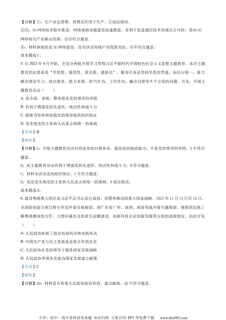 小学、初中、高中各种试卷真题知识归纳文案合同PPT等免费下载www.doc985.com2024届新高考基地学校第三次大联考政治注意事项考生在答题前请认真阅读本注意事项及各题答题要求1.本试卷共8页,满分为100分,考试时间为75分钟。考试结束后,请将本试卷和答题卡一并交回。2.答题前,请务必将自己的姓名、准考证号用0.5毫米黑色墨水的签字笔填写在试卷及答题卡的规定位置。3.请认真核对监考员在答题卡上所粘贴的条形码上的姓名、准考证号与本人是否相符。4.作答选择题,必须用2B铅笔将答题卡上对应选项的方框涂满、涂黑;如需改动,请用橡皮擦干净后,再选涂其它答案。作答非选择题,必须用0.5毫米黑色墨水的签字笔在答题卡上的指定位置作答,在其他位置作答一律无效。5.如需作图,必须用2B铅笔绘、写清楚,线条、符号等须加黑、加粗。一、单项选择题:共15题,每题3分,共45分。每题只有一个选项最符合题意。1.早期的无产阶级运动而出现的革命文献,“倡导普遍的禁欲主义和粗陋的平均主义”,所以,“就其内容来说必然是反动的”。究其实质,“粗陋的平均主义”和“粗陋的共产主义”是一个东西,都是以追求社会平等的旗号,否定发展生产力、增加社会财富的重要性。这些思想()A.是空想社会主义的主要内容B.彻底揭露了资本主义的弊端C.是科学社会主义的理论来源D.违背了社会历史发展的规律【答案】A【解析】【详解】A:“粗陋的平均主义”和“粗陋的共产主义”是一个东西,都是以追求社会平等的旗号,可见,这些思想是空想社会主义的主要内容,A符合题意。B:空想社会主义者只是抨击资本主义的弊端,并没有彻底揭露资本主义的弊端,B说法错误。C:空想社会主义是科学社会主义的思想来源,而不是理论来源,C排除。D:空想社会主义者的思想并没有违背社会历史发展的规律,D说法错误。故本题选A。2.2023年7月,国务院办印发了《关于在超大特大城市积极稳步推进城中村改造的指导意见》。《意见》提出,积极创新改造模式,完善平急两用公共设施,鼓励和支持民间资本参与,努力发展各种新业态,实现可持续运营。这些政策对促进经济发展的作用路径是()A.创新改造模式——改善城中村人居环境——降低居民生活成本——增加社会总需求B.发展新业态——提高居民消费能力——增加特大城市辐射力——提高经济运行效率小学、初中、高中各种试卷真题知识归纳文案合同PPT等免费下载www.doc985.comC.鼓励民间资本参与——扩大有效投资——增加社会总需求——促进经济平稳运行D.完善公共设施——创造更多投资需求——提高资源配置效率——促进经济转型升级【答案】C【解析】【详解】A:《意见》提出,积极创新改造模式,完善平急两用公共设施,这有利于改善城中村人居环境,但不意味着居民生活成本会降低,A传导错误。B:“发展新业态”与“提高居民消费能力”二者之间并无必然联系,B传导错误。C:鼓励和支持民间资本参与,有利于促进投资稳定增长,刺激社会总需求,进而推动经济平稳运行,C符合题意。D:“创造更多投资需求”与“提高资源配置效率”并无必然关系,D传导错误。故本题选C。3.经中央批准,财政部决定增加发行2023年国债1万亿元,作为特别国债管理。增发1万亿国债后,2023年财政赤字从3.88万亿提高到了4.88万亿元。这一政策()A.有利于保持宏观经济的稳定B.为稳定经济大盘创造了物质基础C.旨在发挥投资对经济增长的主导作用D.能够降低企业的融资成本和税费成本【答案】A【解析】【详解】A:中央财政将在今年四季度增发2023年国债1万亿元,国债资金投入使用以后,也会积极带动国内的需求,进一步巩固中国经济回升向好的态势,有利于保持宏观经济的稳定,A正确。B:发展实体经济才为稳定经济大盘创造了物质基础,B说法错误。C:投资对经济增长的不起主导作用,C错误。D:增发万亿国债,体现了我国实施积极的财政政策,能有效地为地方政府财政减负,缓解地方财政收支平衡压力,与降低企业的融资成本和税费成本没直接关系,D错误。故本题选A。4.目前,我国5G网络建设稳步推进。截至2023年10月末,5G基站总数达321.5万个,占移动基站总数的28.1%,三家基础电信企业5G移动电话用户达7.54亿户。5...