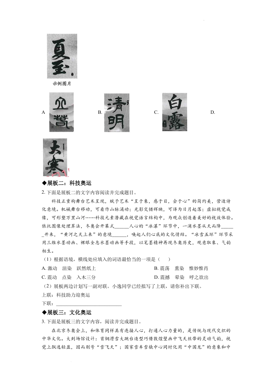 武威市2022年初中毕业、高中招生考试语文试卷考生注意:本试卷满分为150分,考试时间为150分钟。所有试题均在答题卡上作答,否则无效。一、积累与运用(30分)北京冬奥,惊艳全球。学校开展以“自信中国风,一起向未来”为主题的展览活动,请你完成下列任务。◆展板一:浪漫奥运1.下面是展板一的文字内容,阅读并完成题目。万众瞩目的北京冬奥会开幕式,以“中国式浪漫”唱响“一起向未来”的宣言;欢乐相聚的闭幕式,大家在五环旗下依依惜别,“天下一家”的浪漫烟花、寓意共建人类命运共同体的中国结,让多少人内心的企盼得到共鸣和回响。多少人也由此领略中国传统二十四节气的智慧、“黄河之水天上来”的气象、“渡头杨柳青青,枝枝叶叶离情”的深情,感受当代中国的自信从容和______生机。“雪如意”“雪游龙”“雪长城”,见证运动员汗水与激情的比赛场馆,则是将科技、运动与中华优秀传统文化______的具象载体。火种灯会徽体育图标颁奖礼服北京冬奥会视觉呈现的中国风几乎无处不在。(1)请你将本次活动的主题“自信中国风,一起向未来”工整地写在下面田字格中。(2)上面语段中加点字的注音和横线处应填入的词语,全都正确的一项是()A.万众瞩目(shǔ)篷勃熔合载体(zài)B.万众瞩目(zhǔ)蓬勃融合载体(zài)C.万众瞩目(zhǔ)篷勃融合载体(zǎi)D.万众瞩目(shǔ)蓬勃熔合载体(zǎi)(3)给画线句加上标点符号,最恰当的一项是()A.火种灯,会徽,体育图标,颁奖礼服——北京冬奥会视觉呈现的“中国风”几乎无处不在。B.火种灯、会徽、体育图标、颁奖礼服——北京冬奥会视觉呈现的《中国风》几乎无处不在。C.火种灯、会徽、体育图标、颁奖礼服……北京冬奥会视觉呈现的“中国风”几乎无处不在。D.火种灯,会徽,体育图标,颁奖礼服……北京冬奥会视觉呈现的《中国风》几乎无处不在。(4)展板上需要配图,字体与示例图片一致的一项是()学科网(北京)股份有限公司A.B.C.D.◆展板二:科技奥运2.下面是展板二的文字内容阅读并完成题目。科技正重构舞台艺术呈现,赋予艺术“呈于象,感于目,会于心”的简约美,营造诗化意境。机械舞台移动,可看作山脉涌动;光影交错辉映,可译为日月起落;虚拟视觉成像,可形塑万里山河……科技元素潜藏在视觉语言结构中,为观众创造着美好的视效体验。依托图像处理算法,冬奥会开幕式______人心的“冰瀑”环节中,一滴水墨从天而降______开来,“黄河之天上来”的意境______,唤起人们心底的文化情结。“冰雪五环”环节采用三维水墨动画、裸眼全息水墨动画等手段,以笔墨精神再现冬奥历史,观意取象、气韵相生。(1)根据语境,横线处应填入的词语最恰当的一项是()A.激动渲染跃然纸上B.震荡熏染惟妙惟肖C.震动点染入木三分D.震撼晕染呼之欲出(2)展板两边计划写一副对联。小逸同学已经拟写了上联,请你补出下联。上联:科技助力迎奥运下联:___________________________◆展板三:文化奥运3.下面是展板三的文字内容,阅读并完成题目。在北京冬奥会上,和体育同样具有连接人心,打通人心力量的,是传统与现代交织的中华文化。大到场馆设计:首钢滑雪大跳台造型巧借敦煌壁画中飞天丝带的灵动气韵,视觉上飘逸轻盈,因而别号“雪飞天”;国家雪车雪橇中心同时化用“中国龙”的意象和中学科网(北京)股份有限公司国古典园林水榭长廊的设计理念,从空中俯瞰有如盘龙在山;______。小到一盏灯、一枚徽章、一件礼服:______;会徽在方寸之间创造性地汇聚了篆刻、剪纸、书法与冰雪运动;______。(1)把下面句子依次填入文段空白处,最恰当的一项是()①“火种灯”造型和巧思都受到西汉长信宫灯启发②颁奖礼服如“鸿运山水”“唐花飞雪”,同样是对传统的化用③云顶滑雪公园坡面障碍技巧赛道融入烽火台元素,宛如“雪长城”A.①②③B.②③①C.③②①D.③①②(2)根据语境补全对话。小文:“水榭长廊”的“榭”字你熟悉吗?小逸:熟悉,我们学过苏州园林“讲究亭台轩榭的布局”,我还背诵过辛弃疾的词——“舞榭歌台,风流总被雨打风吹去”,都有“榭”字。小文:“榭”字不常用,不过,根据语境理解意思并不难。“水榭长廊...