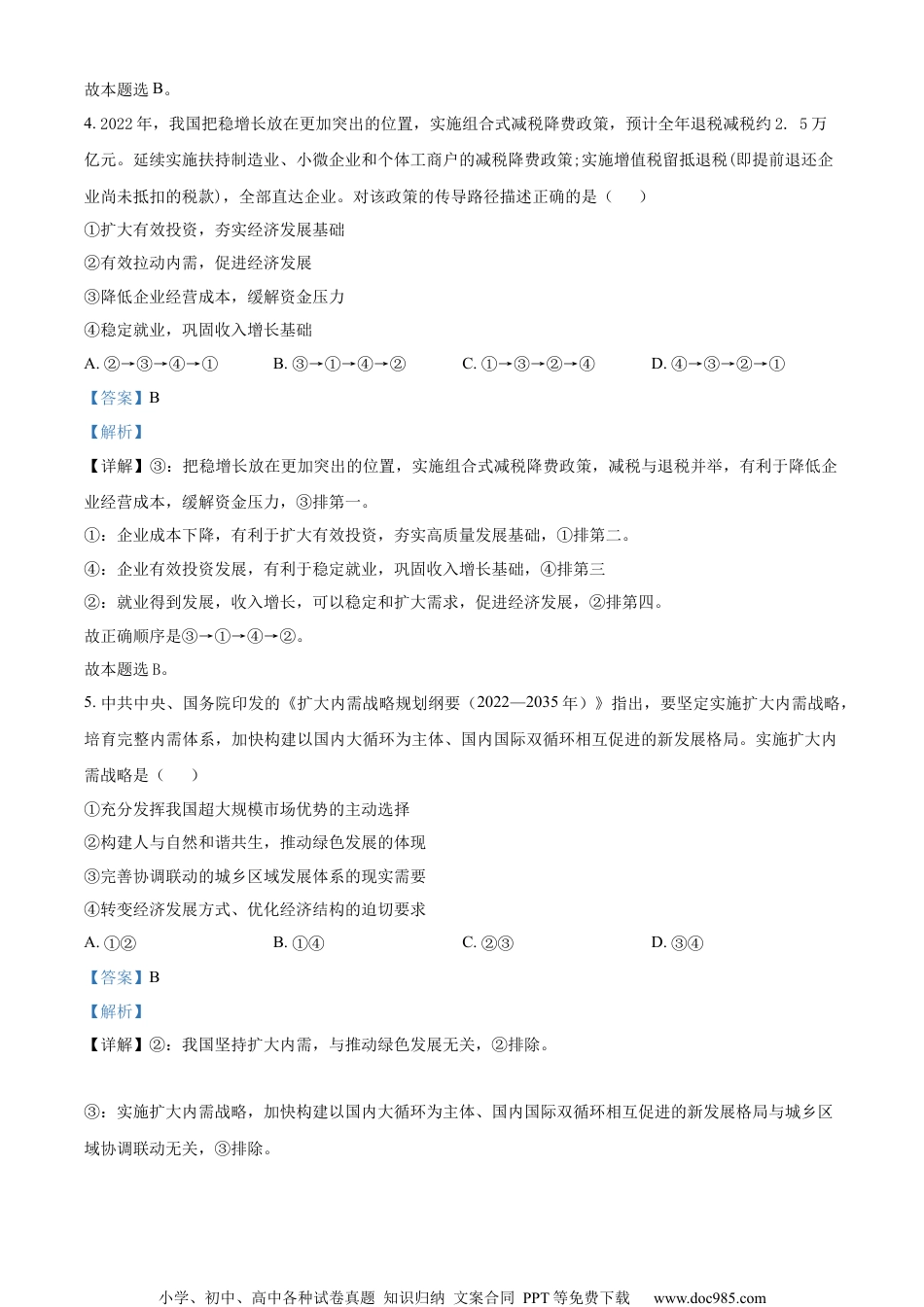 小学、初中、高中各种试卷真题知识归纳文案合同PPT等免费下载www.doc985.com连云港市2023届高三年级2月调研考试政治试题一、单项选择题:共15题,每题3分,共45分。每题只有一个选项最符合题意。1.恩格斯曾指出:“无产阶级将取得社会权力,并且利用这个权力把脱离资产阶级掌握的社会化生产资料变为公共财产。通过这个行动,无产阶级使生产资料摆脱了它们迄今具有的资本属性,给它们的社会性以充分发展的自由。从此按照预定计划进行的社会生产就成为可能的了。”该观点()①奠定了科学社会主义的理论基石②阐释了无产阶级的历史使命③揭示了人民群众的历史主体作用④体现了人类发展的特殊规律A.①②B.①④C.②③D.③④【答案】C【解析】【详解】②③:恩格斯指出:“无产阶级将取得社会权力,并且利用这个权力把脱离资产阶级掌握的社会化生产资料变为公共财产”,该观点阐释了无产阶级的历史使命,也揭示了人民群众的历史主体作用,②③正确。①:唯物史观和剩余价值学说的伟大发现,奠定了科学社会主义的理论基石,①与题意不符。④:根据“无产阶级将取得社会权力”;“使生产资料摆脱了它们迄今具有的资本属性”等,可知题干观点揭示人类发展的一般规律(主要是指生产关系一定要适应生产力状况的规律),而不是特殊规律,④与题意不符。故本题选C。2.有一种速度叫中国速度。这十年,中国速度一次次惊艳世界(下图)。中国速度展现了中国经济社会发展的日新月异,促进了综合国力和民族自信的与日俱增。这充分表明()①新时代十年的变革符合我国国情、顺应时代发展小学、初中、高中各种试卷真题知识归纳文案合同PPT等免费下载www.doc985.com②我国社会主义制度具有强大生命力和巨大优越性③中国走社会主义道路是历史的必然和人民的选择④中华民族正经历有史以来最为广泛而深刻的变革A.①②B.①③C.②④D.③④【答案】A【解析】【详解】①②:近十年,中国速度一次次惊艳世界,展现了中国经济社会发展的日新月异,促进了综合国力和民族自信的与日俱增。这充分表明新时代十年的变革符合我国国情、顺应时代发展;也说明我国社会主义制度具有强大生命力和巨大优越性,①②正确。③:材料强调近十年我国取得的发展成就,与社会主义道路是如何确立的没有关系,③排除。④:1956年,我国社会主义改造取得胜利,社会主义基本制度确立,这是中华民族有史以来最为广泛而深刻的变革,而题干反映的是近十年我国取得的发展成就,④与题意不符。故本题选A。3.国务院公布的《促进个体工商户发展条例》自2022年11月1日起施行。部分内容摘录如下:第8条国务院发展改革、财政、人力资源社会保障、住房城乡建设、商务、金融、税务、市场监督管理等有关部门在各自职责范围内研究制定税费支持、创业扶持职业技能培训、社会保障、金融服务、登记注册、权益保护等方面的政策措施,做好促进个体工商户发展工作。第18条县级以上地方人民政府应当采取有效措施,为个体工商户增加经营场所供给,降低经营场所使用成本。上述规定的实施()A.能促进个体工商户转型升级更好服务实体经济B.能为个体工商户提供稳定的可预期的经营环境C.能促进政府简政放权,降低个体工商户经营风险D.能保证个体工商户扩大经营规模,提高盈和能力【答案】B【解析】【详解】A:材料强调的是政府部门出台相关政策为个体工商户的发展提供政策性支持,并不能促进个体工商户转型升级,A排除。B:政府出台的有关政策,能够有效增加经营场所供给,降低经营场所使用成本等政策性支持,能为个体工商户提供稳定的可预期的经营环境,B正确。C:政府部门出台相关政策为个体工商户的发展提供政策性支持,并不能降低个体工商户经营风险,经营风险受多种因素影响,C排除。D:政府部门的政策性支持,并不能保证个体工商户扩大经营规模,提高盈和能力,企业的经营跟自身发展有关,D排除。小学、初中、高中各种试卷真题知识归纳文案合同PPT等免费下载www.doc985.com故本题选B。4.2022年,我国把稳增长放在更加突出的位置,实施组合式减税降费政策,预计全年退税减税约2.5万亿元。延续实施扶持制造业、小微企业和个体工商户的减税降费政策;实施增值税...