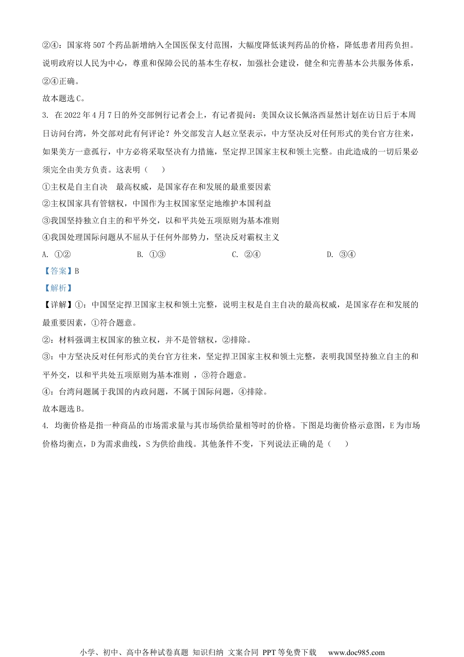 小学、初中、高中各种试卷真题知识归纳文案合同PPT等免费下载www.doc985.com2022年江苏省普通高中学业水平选择性考试模拟最后一卷·政治一、单项选择题:共15题,每题3分,共45分。每题只有一个选项最符合题意。1.某市1630个社区建立起生活垃圾分类联席会议制度,以垃圾分类为支点,推动社区基层党组织、居委会、业委会、物业公司、志愿者、社区居民参与城市治理,推动了生活垃圾有效治理和社区精细化管理,市民的获得感幸福感安全感不断增强。该制度()①使居民自治组织形式不断完善,有利于提升基层自治水平②有利于构建社区治理共同体,健全社区治理和服务体系③整合社区治理力量,有利于提高基层自治组织的行政效能④推动多方主体参与社区共同治理,有助于社区服务管理精细化A.①③B.①④C.②③D.②④【答案】D【解析】【详解】①:居民自治组织形式是居委会,生活垃圾分类联席会议制度并没有完善居民自治组织形式,故①不选。③:基层自治组织不属于行政机构,无法提高行政的效能,故①③不选。②④:建立起生活垃圾分类联席会议制度,以垃圾分类为支点,推动社区基层党组织、居委会、业委会、物业公司、志愿者、社区居民参与城市治理,健全社区治理和服务体系,有利于构建社区治理共同体,促进社区服务管理精细化,故②④正确。故本题选D。2.国家医疗保障局自成立以来,已经累计将507个药品新增纳入全国医保支付范围。其中谈判药品价格降幅超过50%,通过谈判降价和医保报销双重效应,大幅降低患者用药负担。这体现了政府()①深化机构改革,进一步完善宏观经济治理体制②以人民为中心,尊重和保障公民的基本生存权③坚持依法行政,不断提高政府沟通力和执行力④加强社会建设,健全和完善基本公共服务体系A.①②B.①③C.②④D.③④【答案】C【解析】【详解】①③:材料没有涉及机构改革,进一步完善宏观经济治理体制,也没有反映政府坚持依法行政,①③不选。小学、初中、高中各种试卷真题知识归纳文案合同PPT等免费下载www.doc985.com②④:国家将507个药品新增纳入全国医保支付范围,大幅度降低谈判药品的价格,降低患者用药负担。说明政府以人民为中心,尊重和保障公民的基本生存权,加强社会建设,健全和完善基本公共服务体系,②④正确。故本题选C。3.在2022年4月7日的外交部例行记者会上,有记者提问:美国众议长佩洛西显然计划在访日后于本周日访问台湾,外交部对此有何评论?外交部发言人赵立坚表示,中方坚决反对任何形式的美台官方往来,如果美方一意孤行,中方必将采取坚决有力措施,坚定捍卫国家主权和领土完整。由此造成的一切后果必须完全由美方负责。这表明()①主权是自主自决的最高权威,是国家存在和发展的最重要因素②主权国家具有管辖权,中国作为主权国家坚定地维护本国利益③我国坚持独立自主的和平外交,以和平共处五项原则为基本准则④我国处理国际问题从不屈从于任何外部势力,坚决反对霸权主义A.①②B.①③C.②④D.③④【答案】B【解析】【详解】①:中国坚定捍卫国家主权和领土完整,说明主权是自主自决的最高权威,是国家存在和发展的最重要因素,①符合题意。②:材料强调主权国家的独立权,并不是管辖权,②排除。③:中方坚决反对任何形式的美台官方往来,坚定捍卫国家主权和领土完整,表明我国坚持独立自主的和平外交,以和平共处五项原则为基本准则,③符合题意。④:台湾问题属于我国的内政问题,不属于国际问题,④排除。故本题选B。4.均衡价格是指一种商品的市场需求量与其市场供给量相等时的价格。下图是均衡价格示意图,E为市场价格均衡点,D为需求曲线,S为供给曲线。其他条件不变,下列说法正确的是()小学、初中、高中各种试卷真题知识归纳文案合同PPT等免费下载www.doc985.com①P1为粮食最低收购价,有利于增加农民收益②P2为粮食最低收购价,有利于保障粮食安全③P1为碳排放交易价格,有利于节约资源、保护生态环境④P2为碳排放交易价格,有利于企业改进技术、节能减排A.①③B.①④C.②③D.②④【答案】A【解析】【详解】①:P1为粮食最低收购价,意味着粮食价格高于均衡价格,有利于增加农民收益,①正确。②:如果P2为粮食...