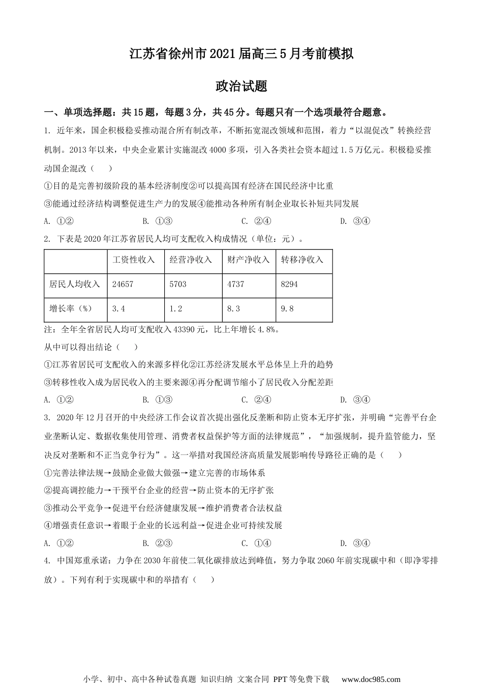 小学、初中、高中各种试卷真题知识归纳文案合同PPT等免费下载www.doc985.com江苏省徐州市2021届高三5月考前模拟政治试题一、单项选择题:共15题,每题3分,共45分。每题只有一个选项最符合题意。1.近年来,国企积极稳妥推动混合所有制改革,不断拓宽混改领域和范围,着力“以混促改”转换经营机制。2013年以来,中央企业累计实施混改4000多项,引入各类社会资本超过1.5万亿元。积极稳妥推动国企混改()①目的是完善初级阶段的基本经济制度②可以提高国有经济在国民经济中比重③能通过经济结构调整促进生产力的发展④能推动各种所有制企业取长补短共同发展A.①②B.①③C.②④D.③④2.下表是2020年江苏省居民人均可支配收入构成情况(单位:元)。工资性收入经营净收入财产净收入转移净收入居民人均收入24657570347378294增长率(%)3.41.28.39.8注:全年全省居民人均可支配收入43390元,比上年增长4.8%。从中可以得出结论()①江苏省居民可支配收入的来源多样化②江苏经济发展水平总体呈上升的趋势③转移性收入成为居民收入的主要来源④再分配调节缩小了居民收入分配差距A.①②B.①③C.②④D.③④3.2020年12月召开的中央经济工作会议首次提出强化反垄断和防止资本无序扩张,并明确“完善平台企业垄断认定、数据收集使用管理、消费者权益保护等方面的法律规范”,“加强规制,提升监管能力,坚决反对垄断和不正当竞争行为”。这一举措对我国经济高质量发展影响传导路径正确的是()①完善法律法规→鼓励企业做大做强→建立完善的市场体系②提高调控能力→干预平台企业的经营→防止资本的无序扩张③推动公平竞争→促进平台经济健康发展→维护消费者合法权益④增强责任意识→着眼于企业的长远利益→促进企业可持续发展A.①②B.②③C.①④D.③④4.中国郑重承诺:力争在2030年前使二氧化碳排放达到峰值,努力争取2060年前实现碳中和(即净零排放)。下列有利于实现碳中和的举措有()小学、初中、高中各种试卷真题知识归纳文案合同PPT等免费下载www.doc985.com①优化能源消费结构,提高清洁能源和非化石能源消费比重②深化能源供给侧结构性改革,提供高质量的化石能源供给③开展植树造林等生态环境工程,增强森林、湿地储碳能力④引导居民践行绿色低碳生活方式,倡导自给自足低碳消费A.①②B.①③C.②④D.③④5.2020年12月26日,十三届全国人大常委会第二十四次会议举行联组会议,审议国务院关于2019年度中央预算执行和其他财政收支审计查出问题整改情况的报告并开展专题询问。国务院有关部门负责人到会听取意见、回答询问。问答双方良性互动,既有交流讨论也有观点交锋,剖析问题根源,推动问题解决。专题询问的效果是()①增强人大监督的实效性,提高治理效能②促进国家机关协调运转,体现相互制衡③推动重大决策部署的贯彻落实,增强政府履职意识④彰显人大把方向、谋大局的地位,发挥制度的优越性A.①②B.①③C.②④D.③④6.疫苗是抗击病毒的利器,也是拯救生命的希望。中国秉持人类卫生健康共同体理念,积极促进全球疫苗公平可及。中国是目前向发展中国家提供疫苗最多的国家,已陆续向80多个发展中国家提供疫苗援助,向50多个国家出口疫苗。中国的行动()①加快世界多极化发展,推动建立公正合理的国际新秩序②顺应时代发展的要求,维护了世界各国人民的根本利益③彰显负责任大国担当,为全球协同抗疫带来信心和力量④兼顾他国的合理关切,在谋求本国发展中促进各国发展小学、初中、高中各种试卷真题知识归纳文案合同PPT等免费下载www.doc985.comA.①②B.①④C.②③D.③④7.2021年1月1日,《民法典》正式实施。部分条文如图所示。这说明《民法典》()①贯彻依法治国,确立公民权利义务②突出绿色原则,适应生态文明建设③强调公序良俗,将法律标准道德化④坚持人民至上,依法维护人民权益A.①②B.①③C.②④D.③④8.在一件件国宝中触摸文化的宝藏,于一封封家书中感受精神的传承……近年来,历史文化类电视节目走红,让观众看到“历史原来这么有料”。透过影像化展示、故事化讲述,尘封的记忆被激活,历史的图景在人们心中铺展。这说明()①创新是民族文化富有生机与活力的重...