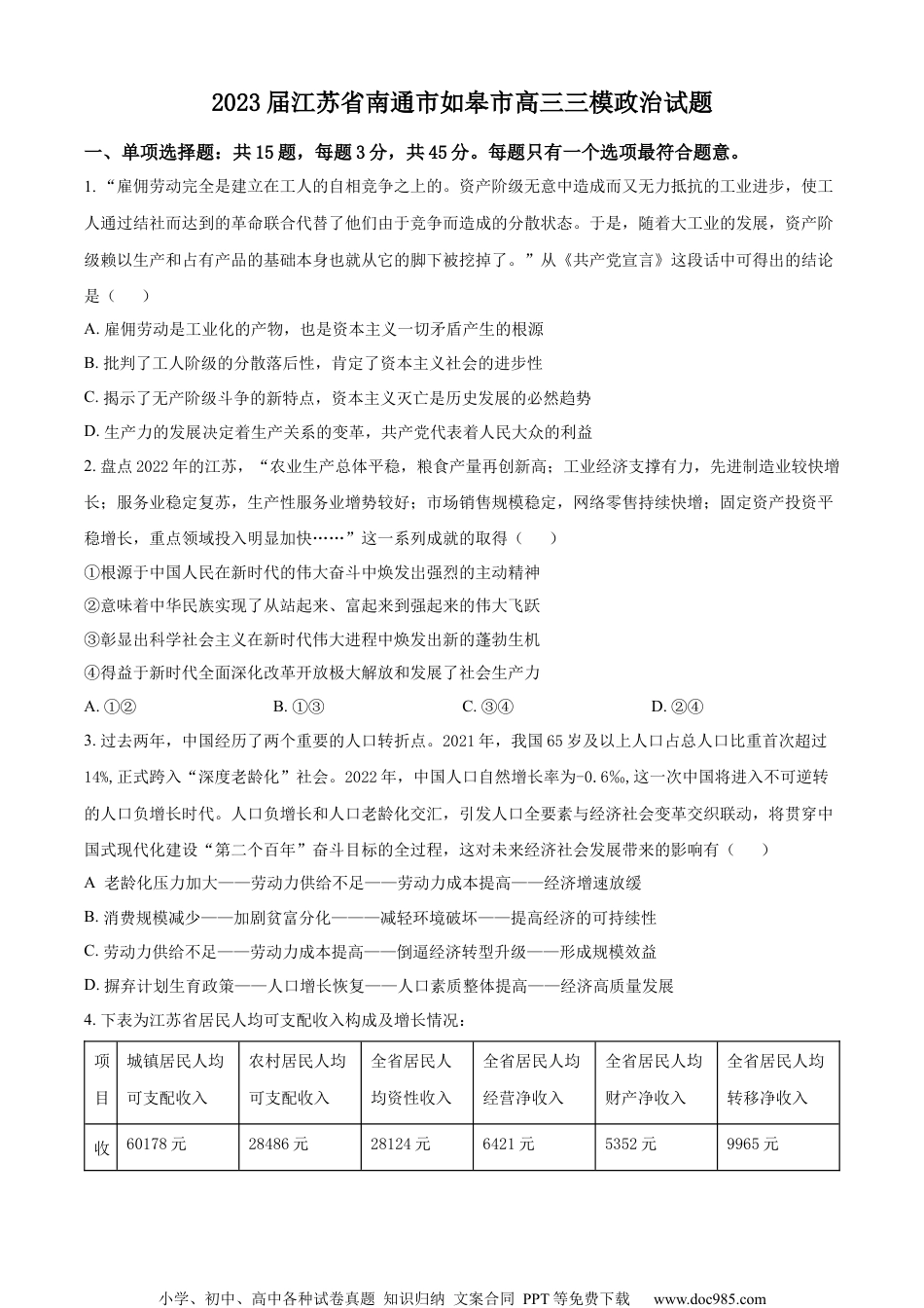 小学、初中、高中各种试卷真题知识归纳文案合同PPT等免费下载www.doc985.com2023届江苏省南通市如皋市高三三模政治试题一、单项选择题:共15题,每题3分,共45分。每题只有一个选项最符合题意。1.“雇佣劳动完全是建立在工人的自相竞争之上的。资产阶级无意中造成而又无力抵抗的工业进步,使工人通过结社而达到的革命联合代替了他们由于竞争而造成的分散状态。于是,随着大工业的发展,资产阶级赖以生产和占有产品的基础本身也就从它的脚下被挖掉了。”从《共产党宣言》这段话中可得出的结论是()A.雇佣劳动是工业化的产物,也是资本主义一切矛盾产生的根源B.批判了工人阶级的分散落后性,肯定了资本主义社会的进步性C.揭示了无产阶级斗争的新特点,资本主义灭亡是历史发展的必然趋势D.生产力的发展决定着生产关系的变革,共产党代表着人民大众的利益2.盘点2022年的江苏,“农业生产总体平稳,粮食产量再创新高;工业经济支撑有力,先进制造业较快增长;服务业稳定复苏,生产性服务业增势较好;市场销售规模稳定,网络零售持续快增;固定资产投资平稳增长,重点领域投入明显加快……”这一系列成就的取得()①根源于中国人民在新时代的伟大奋斗中焕发岀强烈的主动精神②意味着中华民族实现了从站起来、富起来到强起来的伟大飞跃③彰显出科学社会主义在新时代伟大进程中焕发出新的蓬勃生机④得益于新时代全面深化改革开放极大解放和发展了社会生产力A.①②B.①③C.③④D.②④3.过去两年,中国经历了两个重要的人口转折点。2021年,我国65岁及以上人口占总人口比重首次超过14%,正式跨入“深度老龄化”社会。2022年,中国人口自然增长率为-0.6‰,这一次中国将进入不可逆转的人口负增长时代。人口负增长和人口老龄化交汇,引发人口全要素与经济社会变革交织联动,将贯穿中国式现代化建设“第二个百年”奋斗目标的全过程,这对未来经济社会发展带来的影响有()A.老龄化压力加大——劳动力供给不足——劳动力成本提高——经济增速放缓B.消费规模减少——加剧贫富分化———减轻环境破坏——提高经济的可持续性C.劳动力供给不足——劳动力成本提高——倒逼经济转型升级——形成规模效益D.摒弃计划生育政策——人口增长恢复——人口素质整体提高——经济高质量发展4.下表为江苏省居民人均可支配收入构成及增长情况:项目城镇居民人均可支配收入农村居民人均可支配收入全省居民人均资性收入全省居民人均经营净收入全省居民人均财产净收入全省居民人均转移净收入收60178元28486元28124元6421元5352元9965元小学、初中、高中各种试卷真题知识归纳文案合同PPT等免费下载www.doc985.com入增长4.2%6.3%5.2%3.3%0.7%%7.8%注:经国家统计局核定,2022年江苏全省居民人均可支配收入49862元,同比增长5.0%。由上表可以得出结论()①城乡居民收入来源日益多样化,社会保障体系逐步健全②经济运行企稳向好,居民收入增长与经济增长基本同步③实行多种生产要素参与分配,推动形成橄榄型分配格局④切实践行共享发展理念,居民转移性收入实现较快增长A.①②B.①③C.②④D.③④5.4月8日,2023年江苏省第十批援藏干部人才大会在拉萨召开。自第十批江苏援藏干部人才进藏以来,深入贯彻落实新时代党的治藏方略,坚持以党的二十大精神指导江苏援藏工作实践,充分发扬“老西藏精神”“援藏精神”,脚踏实地加油干,砥砺奋进新征程,取得令人自豪的成绩。聚焦援藏“五大领域”,安排对口援藏资金5.12亿元,55个援藏项目全部开工建设,助力拉萨在维护社会团结和谐稳定、保障和改善民生、加快构建现代化产业体系等方面展现新作为。此举()A.有利于铸牢中华民族共同体意识,推动平等团结互助和谐的民族关系形成B.体现国家统一领导与民族区域自治的有机统一,推动实现苏藏的共同繁荣C.说明援藏干部人才是助推西藏发展的内在动力,实现援藏干部的人生价值D.表明西藏的发展离不开党的正确领导,党的治藏方略符合西藏人民的利益6.2022年9月2日,全国人大常委会第三十六次会议表决通过了新修订的农产品质量安全法,从生产环节到加工、消费环节,做好与食品安全法的衔接,实现农产品从田间地头到百姓餐桌的全过程监管...
