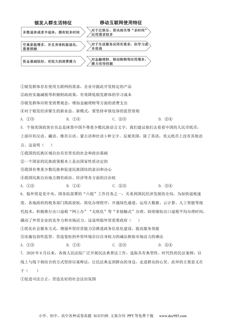 小学、初中、高中各种试卷真题知识归纳文案合同PPT等免费下载www.doc985.com南京市2022届高三年级零模考前复习卷政治一、单项选择题:共15题,每题3分,共45分。1.同仁堂在北京朝阳区的知嘛健康店打造中医健康餐饮体验店,该店推出添加了中草药的咖啡,成了网红咖啡店,枸杞拿铁、益母草玫瑰拿铁、山楂陈皮美式,这些品类每天都能卖出上千杯。中西结合玩跨界,让“同仁堂”这个老字号又火了一把。根据材料,下列解读正确的有()①中草药与咖啡的跨界结合创造了新的价值②添加了中草药的咖啡具有了新的使用价值③咖啡添加中草药的目的是迎合求异消费心理④添加了中草药的咖啡更符合健康消费理念A.①②B.①③C.②④D.③④2.中国力争于2030年前二氧化碳排放达到峰值,然后逐步降低,到2060年前实现碳中和(即实现二氧化碳“近零排放”)。为此我国正逐步建立碳排放权交易市场,减排企业可以通过出售剩余排放权获得利润,而排放超标企业则需购买排放权以补足配额,实现碳中和。以下从碳排放权交易到实现碳中和的传导路径中,正确的是()①企业排放超标→企业限产、减产→利润增加→实现碳中和②企业排放超标→购买排放量→收益减少→推动低碳技术创新→实现碳中和③企业减排→出售剩余排放权→盈利增加→扩大生产规模→实现碳中和④企业减排→出售剩余排放权→利润增加→促进节能减排→实现碳中和A.①②B.①③C.②④D.③④3.2020年11月5日,民政部负责人在国务院新闻办公室举行的新闻发布会上表示,我国易地扶贫搬迁960多万贫困人口同步新建了约3.5万个安置社区,一揽子解决了搬迁群众的吃、住、行、就医、就学等方面的问题。我国易地扶贫搬迁精准扶贫这一成绩的取得()①说明搬离贫困地区是脱贫的最佳途径②是通过初次分配促进社会公平的结果③是我国贯彻落实共享发展理念的成效④彰显了中国特色社会主义制度的优势A.①②B.①④C.②③D.③④4.我国50岁以上的银发人群人口点比达到1/3,为互联网银发经济的发展奠定了基础。结合下图中反映的信息,下列分析正确的有()小学、初中、高中各种试卷真题知识归纳文案合同PPT等免费下载www.doc985.com①银发群体存在使用互联网的需求,企业可据此开发特定的产品②政府实施减税等积极财政政策,有效降低银发群体的学习成本③银发群体应转变消费观念,增加金融理财等方面的消费支出④对于银发经济催生的新业态、新模式,要坚持审慎包容的监管原则A.①③B.①④C.②③D.②④5.个别美国政客官员总是抹黑中国不尊重少数民族语言文字,我们建议他们去看看中国的人民币纸币,上面印有汉语、藏语、维吾尔语、蒙古语和壮语5种文字。反观美国,除了英语,美元纸币上没有其他语言。这说明()①我国的民族区域自治具有坚实的社会和政治基础②一个国家的民族政策根本上是由国家性质决定的③我国有尊重少数民族和促进民族团结的意识和决心④我国民族自治地方拥有政治、经济等各方面的自治权A.①②B.①④C.②③D.③④6.稳外贸是党中央、国务院部署的“六稳”工作任务之一,关系到国民经济发展的全局。为加快退税速度,各地政府的税务部门简政放权,简化办理程序,开通绿色通道,运用大数据、云计算、人工智能等现代技术,积极推行出口退税“网上办”“无纸化”等“非接触式”办理,持续缩短出口退税平均办理时间,撬动了外贸企业的竞争力和市场活力。这说明稳外贸需要政府()①优化社会服务方式,增强外贸经营能力②推进政务信息化建设,提高服务效能③实施包容性监管,营造宽松的外贸环境④以自身权力的减法换取市场活力的乘法A.①③B.①④C.②③D.②④7.2020年6月以来,各级人民法院广泛开展民法典普法工作,选取具有典型性、时代性的民法案例,以线上与线下相结合的方式坚持以案释法,让民法典走到群众的身边、走进群众的心里。此举的主要意义在于()①促进司法公正,营造良好的社会法治氛围小学、初中、高中各种试卷真题知识归纳文案合同PPT等免费下载www.doc985.com②打破时空限制,让法律知识更好地走近大众③提升人民群众法治观念,推进法治社会建设④创新普法宣传形式,为公民诉讼提供新途径A.①②B.①④C.②③D.③④8.近日,重大革命历史题材剧《觉...