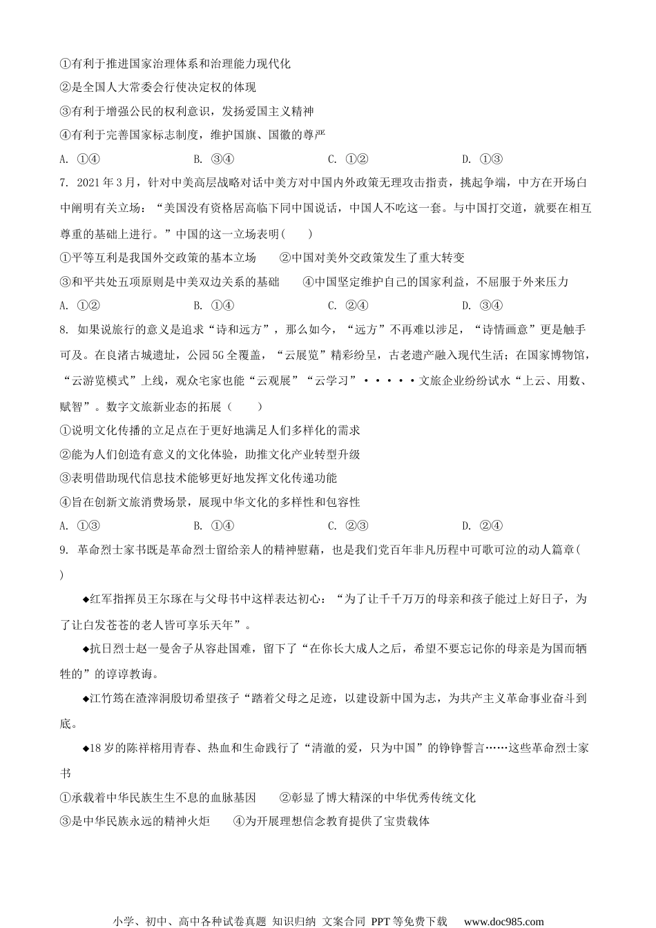 小学、初中、高中各种试卷真题知识归纳文案合同PPT等免费下载www.doc985.com2021届高三适应性考试试题政治2021.5考生在答题前请认真阅读本注意事项:1.本试卷满分150分,考试时间为150分钟。考试结束后,请将答题卡交回。2.答题前,请将自己的姓名、考试号用0.5毫米黑色签字笔填涂在答题卡指定的位置。3.选择题答案用2B铅笔在答题卡上把对应题目的答案标号涂黑,非选择题用0.5mm的黑色签字笔在每题对应的答题区域内做答,在其他位置作答一律无效。一、单项选择题:本题共16小题,每小题3分,共48分。在每小题给出的四个选项中,只有一个选项是最符合题目要求的。1.2021年1月初,商务部等12部门联合印发《关于提振大宗消费重点消费促进释放农村消费潜力若干措施的通知》。图示中D、S分别代表市场需求曲线和供给曲线,《该通知》的意图是()A.B.C.D.小学、初中、高中各种试卷真题知识归纳文案合同PPT等免费下载www.doc985.com2.2020年以来,农业农村部会同有关部门深入开展农民合作社规范提升行动,截至2020年11月,全国农民合作社达到224.1万家,坚持以农民为主体,辐射带动近一半的农户。27.7万家农民合作社面向小农户提供专业化社会化服务,1.3万家进军休闲农业和乡村旅游,2000多家从事民间工艺制品等乡土特色产业。发展农业合作社()①是实现农业农村现代化的关键②有利于充分利用农村特色资源③完善了农业农村的所有制结构④对实现共同富裕具有重要作用A.①③B.①④C.②③D.②④3.2020年,我国实施一系列税费优惠政策助力各行业复工复产,四个季度国内生产总值经历了先抑后扬的V形反转,同比增速分别为-6.8%、3.2%、4.9%、6.5%,全年实现2.3%的经济增长,成为2020年全球唯一实现正增长的主要经济体。这些税费优惠政策的传导路径可能是()①增加市场流动性,降低融资成本②促进实体经济发展③降低企业生产经营成本④促进经济强劲复苏⑤国家实施减税降费政策A.⑤→③→②→④B.⑤→④→③→②C.⑤→②→③→①D.⑤→①→③→④4.某地实施两轮村(社区)合并后,管理半径变大,产生了基层组织功能弱化、自然村公共事务无人问津等一系列问题,为破解新时代乡村治理困境,该地以“一网格一支部”“网格+”“村民小组理事会”“乡村法律服务站”“文明实践站”为引擎,形成了“1+1+3”的乡村治理模式,并取得了明显成效。该模式的优势在于()①坚持自治法治德治相结合,提升现代乡村治理能力②创新基层自治组织结构,提升基层治理效能③坚持党的领导,发挥基层党组织的战斗堡垒作用④夯实村民自治基础,保障人民当家作主权利A.①③B.①④C.②③D.②④5.下列选项中,古今表述内涵一致的是()①“政之所兴在顺民心,政之所废在逆民心。”——为人民服务,对人民负责②“当官避事平生耻,视死如归社稷心。”——科学决策,提高行政效能③“廉者,民之表也贪者,民之贼也。”——清廉谨慎,严格自律④“功成不必在我,而功力必不唐捐。”——依法行政,处事公正A.①③B.①②C.②④D.③④6.2020年10月17日,十三届全国人大常委会第二十二次会议表决通过关于修改国旗法、国徽法的决定,决定将于2021年1月1日起施行。修改后的国旗法、国徽法对于损害国旗、国徽尊严的行为作出进一步禁止性规定。根据新法,在公共场合故意以焚烧、毁损、涂划、玷污、践踏等方式侮辱国旗、国徽的,依法追究刑事责任。根据新法,国旗、国徽应当作为爱国主义教育的重要内容。修改国旗法、国徽法()小学、初中、高中各种试卷真题知识归纳文案合同PPT等免费下载www.doc985.com①有利于推进国家治理体系和治理能力现代化②是全国人大常委会行使决定权的体现③有利于增强公民的权利意识,发扬爱国主义精神④有利于完善国家标志制度,维护国旗、国徽的尊严A.①④B.③④C.①②D.①③7.2021年3月,针对中美高层战略对话中美方对中国内外政策无理攻击指责,挑起争端,中方在开场白中阐明有关立场:“美国没有资格居高临下同中国说话,中国人不吃这一套。与中国打交道,就要在相互尊重的基础上进行。”中国的这一立场表明()①平等互利是我国外交政策的基本立场②中国对美外交政策发生了重大转变③和平共处五项原则是中美...