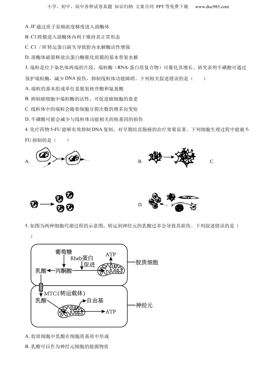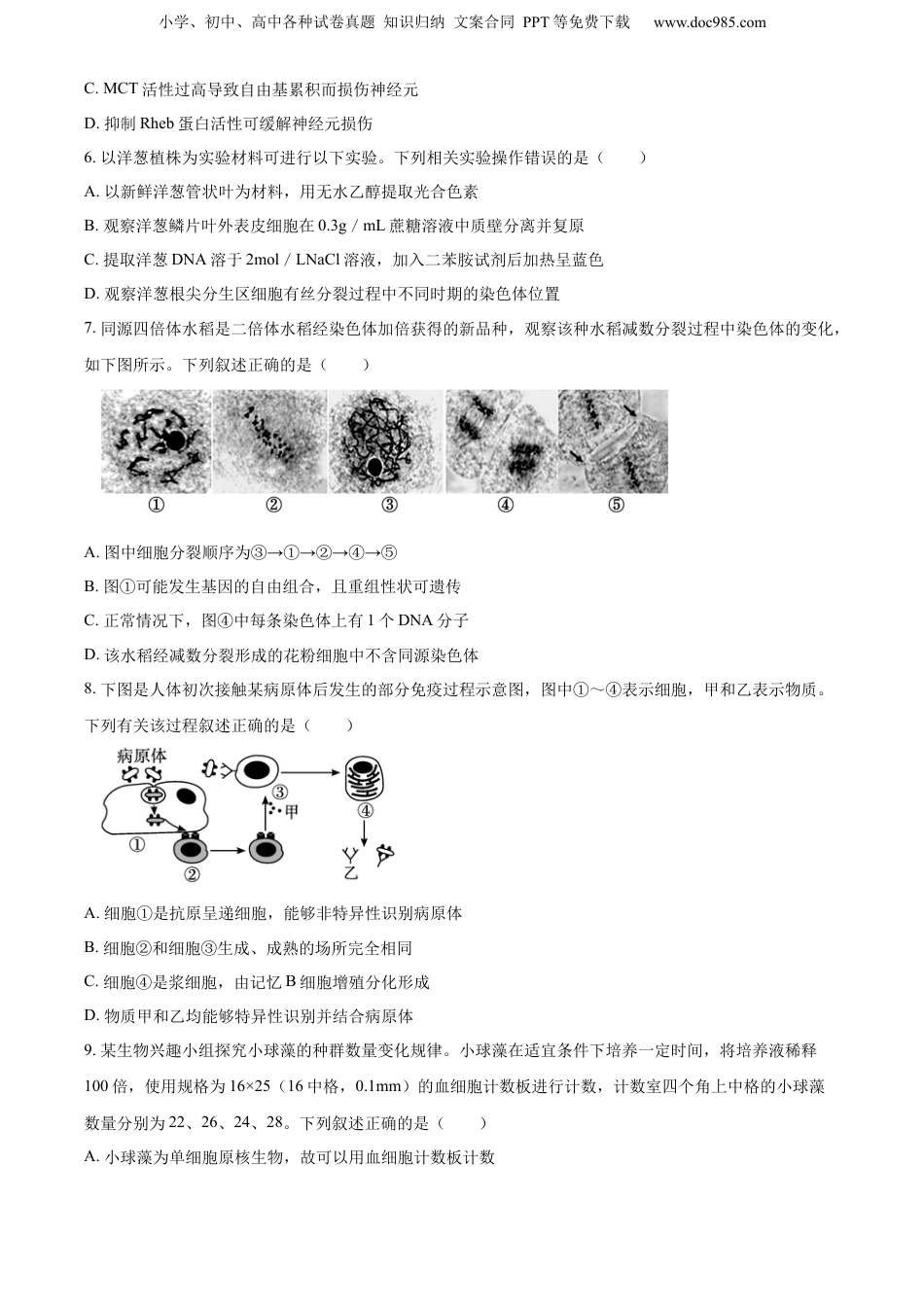 小学、初中、高中各种试卷真题知识归纳文案合同PPT等免费下载www.doc985.com2024届高三第一次调研考试生物试卷注意事项考生在答题前请认真阅读本注意事项及各题答题要求1.本试卷共8页,包含单项选择题(第1题~第14题,共28分)、多项选择题(第15题~第18题,共12分)、非选择题(第19题~第23题,共60分)三部分。本次考试满分为100分,考试时间为75分钟。考试结束后,请将答题纸交回。2.答题前,请您务必将自己的姓名、考试号等用书写黑色字迹的0.5毫米签字笔填写在答题纸上。3.请认真核对答题纸表头规定填写或填涂的项目是否准确。4.作答非选择题必须用书写黑色字迹的0.5毫米签字笔写在答题纸上的指定位置,在其它位置作答一律无效。作答选择题必须用2B铅笔把答题卡上对应题目的答案标号涂黑。如需改动,请用橡皮擦干净后,再选涂其它答案。5.如有作图需要,可用2B铅笔作答,并请加黑加粗,描写清楚。一、单项选择题:本部分包括14题,每题2分,共计28分。每题只有一个选项最符合题意。1.烟酰胺腺嘌呤二核苷酸(NAD+)是一种辅酶,由磷酸基团连接两个核苷酸构成,参与供能、DNA修复、抗氧化等多项生理活动。下列有关NAD+的叙述正确的是()A.由C、H、O、N、P五种元素构成B.以核苷酸为基本单位形成的生物大分子C.在线粒体内膜上催化水和ATP的生成D.可以作为还原剂,辅助H的传递2.经测定,溶酶体内pH为4.6~4.8。溶酶体膜上C1-/H+转运蛋白缺失会导致溶酶体内的吞噬物积累,严重时可导致溶酶体破裂。下列叙述正确的是()小学、初中、高中各种试卷真题知识归纳文案合同PPT等免费下载www.doc985.comA.H+通过质子泵顺浓度梯度进入溶酶体B.C1-跨膜进入溶酶体内利于维持其正常形态C.C1-/H+转运蛋白缺失导致腔内水解酶活性增强D.溶酶体破裂释放出蛋白酶催化质膜的基本骨架水解3.端粒是位于染色体两端的片段,端粒酶(RNA-蛋白质复合物)可催化其增长。研究表明牛磺酸可通过保护端粒酶,减少DNA损伤,抑制线粒体功能障碍。下列相关叙述错误的是()A.端粒的基本组成单位是脱氧核苷酸和氨基酸B.抑制癌细胞中端粒酶的活性,可促进癌细胞的衰老C.线粒体中的端粒会随着细胞分裂次数的增多而变短D.牛磺酸可能会减少与线粒体功能相关的核基因的损伤4.化疗药物5-FU能够有效抑制DNA复制,对早期结直肠癌的治疗效果显著。下列细胞生理过程中能被5-FU抑制的是()A.B.C.D.5.如图为两种细胞代谢过程的示意图,转运到神经元的乳酸过多会导致其损伤。下列叙述错误的是()A.胶质细胞中乳酸在细胞质基质中形成B.乳酸可以作为神经元细胞的能源物质小学、初中、高中各种试卷真题知识归纳文案合同PPT等免费下载www.doc985.comC.MCT活性过高导致自由基累积而损伤神经元D.抑制Rheb蛋白活性可缓解神经元损伤6.以洋葱植株为实验材料可进行以下实验。下列相关实验操作错误的是()A.以新鲜洋葱管状叶为材料,用无水乙醇提取光合色素B.观察洋葱鳞片叶外表皮细胞在0.3g/mL蔗糖溶液中质壁分离并复原C.提取洋葱DNA溶于2mol/LNaCl溶液,加入二苯胺试剂后加热呈蓝色D.观察洋葱根尖分生区细胞有丝分裂过程中不同时期的染色体位置7.同源四倍体水稻是二倍体水稻经染色体加倍获得的新品种,观察该种水稻减数分裂过程中染色体的变化,如下图所示。下列叙述正确的是()A.图中细胞分裂顺序为③→①→②→④→⑤B.图①可能发生基因的自由组合,且重组性状可遗传C.正常情况下,图④中每条染色体上有1个DNA分子D.该水稻经减数分裂形成的花粉细胞中不含同源染色体8.下图是人体初次接触某病原体后发生的部分免疫过程示意图,图中①~④表示细胞,甲和乙表示物质。下列有关该过程叙述正确的是()A.细胞①是抗原呈递细胞,能够非特异性识别病原体B.细胞②和细胞③生成、成熟的场所完全相同C.细胞④是浆细胞,由记忆B细胞增殖分化形成D.物质甲和乙均能够特异性识别并结合病原体9.某生物兴趣小组探究小球藻的种群数量变化规律。小球藻在适宜条件下培养一定时间,将培养液稀释100倍,使用规格为16×25(16中格,0.1mm)的血细胞计数板进行计数,计数室四个角上中格的小球藻数量分别为22、26、24、28。下列叙述正确的是()A...