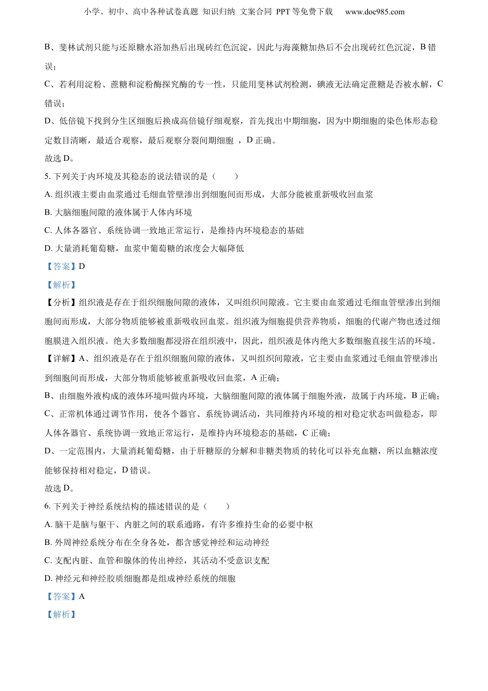 小学、初中、高中各种试卷真题知识归纳文案合同PPT等免费下载www.doc985.com高三生物学科模拟卷一、单选题:1.下列关于细胞中化合物的说法,正确的是()A.黄花蒿特有抗疟有效成分青蒿素是由其脱氧核苷酸决定的B.脂肪一般只在糖类代谢发生障碍,引起供能不足时才会分解供能C.坚果含有大量元素钙、铁、磷等,可以促进人体骨骼和牙齿的生长发育D.瓜子含有大量不饱和脂肪酸,与淀粉、糖原一起成为植物细胞内的储能物质【答案】B【解析】【分析】植物脂肪大多含有不饱和脂肪酸,在室温时呈液态,如日常炒菜用的食用油(花生油、豆油和菜籽油等);大多数动物脂肪含有饱和脂肪酸,室温时呈固态。糖类在供应充足的情况下,可以大量转化为脂肪,而脂肪一般只在糖类代谢发生障碍,引起供能不足时,才会分解供能,而且不能大量转化为糖类。【详解】A、基因决定生物性状,生物体内物质的合成从根上说是由基因决定的,因此黄花蒿特有抗疟有效成分青蒿素是由其脱氧核苷酸排列顺序决定的,不是脱氧核苷酸决定的,A错误;B、脂肪一般只在糖类代谢发生障碍,引起供能不足时,才会分解供能,而且不能大量转化为糖类,B正确;C、铁属于微量元素,不是大量元素,C错误;D、糖原是动物细胞内的储能物质,不是植物细胞内储能物质,D错误。故选B。2.原核生物的受体蛋白、粘附蛋白是经过糖基化修饰的蛋白质。下列有关原核生物蛋白糖基化的研究目的的描述错误的是()A.阐明原核病原菌的粘附及侵染机制B.利用原核生物糖蛋白研制相关疫苗C.在原核生物高尔基体中寻找多糖合成酶D.与真核生物糖基化途径对比获得进化的证据【答案】C【解析】【分析】原核细胞与真核细胞的区别有:原核细胞体积小,无核膜、核仁,DNA上无蛋白质,除核糖体外,无其他细胞器。真核细胞体积较大,有核膜、核仁,DNA与蛋白质形成染色质(染色体),细胞器的种类多,结构复杂。【详解】A、由题意“原核生物的受体蛋白、粘附蛋白是经过糖基化修饰的蛋白质”可知,研究原核生物小学、初中、高中各种试卷真题知识归纳文案合同PPT等免费下载www.doc985.com蛋白糖基化可以帮助阐明原核病原菌的粘附及侵染机制,A正确;B、糖蛋白具有识别作用,可以利用原核生物糖蛋白研制相关疫苗,B正确;C、原核生物不具有高尔基体,所以研究目的不包括在原核生物高尔基体中寻找多糖合成酶,C错误;D、生物进化一般是由简单向复杂的方向进化,对原核生物蛋白糖基化的研究不断深入可以与真核生物糖基化途径对比获得进化的证据,D正确。故选C。3.下列有关细胞生命历程的相关说法错误的是()A.端粒受损可能会导致细胞衰老B.细胞死亡是细胞凋亡的同义词C.细胞增殖是生物体生长、发育、繁殖、遗传的基础D.细胞分化贯穿于整个生命进程,且遗传物质不变【答案】B【解析】【分析】细胞分化的实质:基因的选择性表达。细胞凋亡是由基因决定的细胞编程性死亡的过程。细胞凋亡是生物体正常的生命历程,对生物体是有利的。【详解】A、端粒受损,导致DNA受损,可能会导致细胞衰老,A正确;B、细胞死亡包括细胞凋亡、细胞坏死等,B错误;C、细胞增殖是细胞的一个重要的生命历程,也是生物体生长、发育、繁殖、遗传的基础,C正确;D、细胞分化贯穿于整个生命历程,胚胎期达到最大限度;细胞分化的实质是基因的选择性表达,该过程遗传物质不变,D正确。故选B。4.下列关于教材实验的相关描述正确的是()A.用洋葱鳞片叶内表皮不能观察到质壁分离和复原现象B.海藻糖是非还原糖,可与斐林试剂水浴加热后出现砖红色沉淀C.若利用淀粉、蔗糖和淀粉酶探究酶的专一性,既可用碘液检测也可用斐林试剂检测D.低倍镜下找到分生区细胞后换成高倍镜仔细观察,首先找出中期细胞,最后观察分裂间期细胞【答案】D【解析】【分析】1、成熟的植物细胞都有质壁分离和复原现象,只是无色细胞需要染色才能观察到。2、探究酶的专一性,必须能够确定设置的两个组是否发生反应。【详解】A、用洋葱鳞片叶内表皮能观察到质壁分离和复原现象,只是因为细胞无色需要染色观察,A错误;小学、初中、高中各种试卷真题知识归纳文案合同PPT等免费下载www.doc985.comB、斐林试剂只能与还原糖水浴加热后出现砖红...