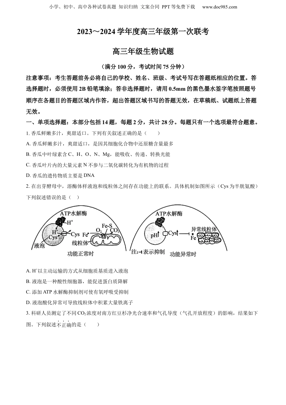 小学、初中、高中各种试卷真题知识归纳文案合同PPT等免费下载www.doc985.com2023~2024学年度高三年级第一次联考高三年级生物试题(满分100分,考试时间75分钟)注意事项:考生答题前务必将自己的学校、姓名、班级、考试号写在答题纸相应的位置。答选择题时,必须使用2B铅笔填涂;答非选择题时,请用0.5mm的黑色墨水签字笔按照题号顺序在各题目的答题区域内作答,超出答题区域书写的答题无效,在草稿纸、试题纸上答题无效。一、单项选择题:本部分包括14题,每题2分,共计28分。每题只有一个选项最符合题意。1.香瓜鲜嫩多汁,爽甜适口。下列有关叙述正确的是()A.香瓜鲜嫩多汁,爽甜适口,是因其细胞化合物中还原糖含量最多B.香瓜中叶绿素含C、H、O、N、Mg,能吸收、传递、转换光能C.香瓜叶片内的大量元素N不参与二氧化碳转化为有机物的过程D.香瓜的遗传物质主要是DNA2.在出芽酵母中,溶酶体样液泡和线粒体之间存在功能上的联系。具体机制如图所示(Cys为半胱氨酸)下列叙述错误的是()A.H+以主动运输的方式从细胞质基质进入液泡B.液泡是一种酸性细胞器,能促进蛋白质降解C.添加ATP水解酶抑制剂可使有氧呼吸受抑制D.液泡酸化异常可导致线粒体中积累大量铁离子3.科研人员测定了不同CO2浓度对南方红豆杉净光合速率和气孔导度(气孔开放程度)的影响,结果如下图。下列叙述不正确的是()小学、初中、高中各种试卷真题知识归纳文案合同PPT等免费下载www.doc985.comA.单位面积叶片在单位时间内的CO2吸收量可表示净光合速率B.低浓度CO2时,气孔导度较大有利于叶片吸收CO2C.CO2浓度达到1300×10-6时,限制光合速率的因素可能是光照强度D.进一步提高CO2浓度,净光合速率会继续增强4.鲫鱼不仅能在冬季结冰的水底生活,而且能在缺氧条件下通过无氧呼吸生活。下图表示鲫鱼的部分代谢过程。下列相关叙述错误的是()A.在寒冷、缺氧环境下,鲫鱼不同组织细胞中的代谢产物有差异B.鲫鱼比人类更能适应缺氧环境,这是生物长期进化的结果C.鲫鱼组织细胞无氧呼吸的终产物酒精和乳酸都会被排出体外,从而减轻其对细胞的伤害D.向鲫鱼的培养液中加入酸性的重铬酸钾溶液后可能会呈现灰绿色5.下列关于细胞生命历程的叙述,正确的是()A.动物卵细胞较大,是为了提高物质的运输效率,增加营养物质的摄入B.衰老细胞表现为酶失活,细胞代谢变慢,细胞中色素逐渐沉积C.处于营养缺乏条件下的细胞,通过细胞自噬可以获得维持生存所需的物质和能量D.蓝细菌是原核生物,不能进行有丝分裂,以无丝分裂的方式进行增殖6.黑腹果蝇(2n)的体细胞中含有8条染色体,其4号染色体(点状染色体)缺失一条时也可以存活,而且能够繁殖后代。下图为某黑腹果蝇正常体细胞的染色体组成示意图,下列有关叙述错误的是()小学、初中、高中各种试卷真题知识归纳文案合同PPT等免费下载www.doc985.comA.缺失一条染色体的果蝇发生的变异类型为染色体数目变异B.该变异类型的果蝇的后代中既有正常果蝇,也有异常果蝇C.染色体缺失有利于隐性基因表达,对个体的生存都是有利的D.缺失一条染色体的果蝇减数分裂Ⅰ时可以形成3个四分体7.孟德尔在利用豌豆进行杂交实验中,用到了“假说-演绎法”,相关叙述正确的()A.孟德尔认为遗传因子在减数分裂中会相互融合但在传递中不会消失B.“若F1(Dd)测交,则子代显隐性状比例为1∶1”属于演绎推理C.“F1产生配子时,等位基因分离,非等位基因自由组合”属于孟德尔“假说”的内容D.孟德尔假说的内容之一是“遗传因子在同源染色体上成对存在”8.某种蝇的翅形有正常和异常两种类型。让翅正常和翅异常两个纯合类型杂交,F1全为正常翅。让F1雌雄个体自由交配得到F2,剔除其中翅异常的个体,让翅正常的个体再自由交配,所得F3中,翅正常纯合个体出现的概率为()A.1/4B.4/9C.1/2D.1/169.人类视网膜上分布着能分辨红色或绿色的视锥细胞,编码红、绿色觉(感光色素)的基因位于X染色体上。图1是某红绿色盲家族系谱图,当A、B基因正常表达时,色觉表现为正常,否则为色弱或色盲。A、B基因高度同源,可发生片段交换形成嵌合基因。当嵌合基因表达时,色觉表现为异常。经检测,Ⅰ-1、Ⅰ-2和Ⅱ-1的A、B基因情...
