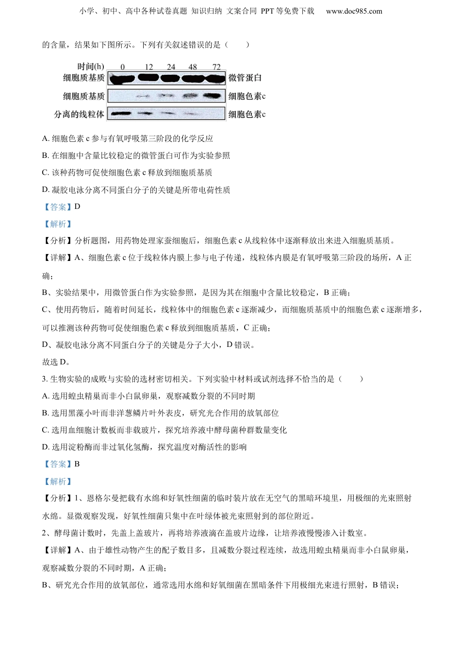 小学、初中、高中各种试卷真题知识归纳文案合同PPT等免费下载www.doc985.com2024.01苏州市2023~2024学年第一学期学业质量阳光指标调研卷高三生物本卷共8页,满分为100分,调研时间为75分钟。注意事项:1.答题前,请务必在答题卡上写清自己的学校、班级、姓名和调研序列号,并用2B铅笔涂写在答题卡上。2.作答选择题,请在答题卡的对应题号后,用2B铅笔把正确答案的字母涂黑。如需改动,用橡皮擦干净后,再选涂其它答案,不能答在调研卷上。作答非选择题,答案要用0.5毫米黑色墨水的签字笔填写在答题卡对应题号后的指定位置。3.答题结束后,将答题卡交回。一、单项选择题:共14题,每题2分,共28分。每题只有一个选项最符合题意。1.肺炎支原体和肺炎链球菌均可能引发肺炎。下列有关叙述正确的是()A.两者遗传物质彻底水解都能得到六种小分子物质B.两者均可利用宿主细胞的核糖体合成自身蛋白质C.两者引发的肺炎症状相似,都可用适量青霉素治疗D.两者均能引发特异性免疫,无法通过检测核酸区分【答案】A【解析】【分析】原核生物与真核生物的区别:原核生物没有以核膜为界限的细胞核,原核生物只有核糖体一种细胞器。【详解】A、两者遗传物质均为核酸,彻底水解都能得到六种小分子物质,包括1种磷酸、4种碱基、1种五碳糖,A正确;B、两者均含有核糖体,利用自身核糖体合成蛋白质,B错误;C、青霉素通过抑制细菌细胞壁的黏肽合成、造成细胞壁缺损,从而导致细菌细胞破裂直至死亡,支原体没有细胞壁,不能用适量青霉素治疗,C错误;D、两者的遗传物质不同,可以通过检测核酸区分,D错误。故选A。2.当细胞接受到凋亡信号后,位于线粒体内膜上的细胞色素c(参与电子传递)会释放进而引发细胞凋亡。研究人员用某种药物处理家蚕细胞不同时间后,用凝胶电泳法测定细胞不同结构中细胞色素c及微管蛋白小学、初中、高中各种试卷真题知识归纳文案合同PPT等免费下载www.doc985.com的含量,结果如下图所示。下列有关叙述错误的是()A.细胞色素c参与有氧呼吸第三阶段的化学反应B.在细胞中含量比较稳定的微管蛋白可作为实验参照C.该种药物可促使细胞色素c释放到细胞质基质D.凝胶电泳分离不同蛋白分子的关键是所带电荷性质【答案】D【解析】【分析】分析题图,用药物处理家蚕细胞后,细胞色素c从线粒体中逐渐释放出来进入细胞质基质。【详解】A、细胞色素c位于线粒体内膜上参与电子传递,线粒体内膜是有氧呼吸第三阶段的场所,A正确;B、实验结果中,用微管蛋白作为实验参照,是因为其在细胞中含量比较稳定,B正确;C、使用药物后,随着时间延长,线粒体中的细胞色素c逐渐减少,而细胞质基质中的细胞色素c逐渐增多,可以推测该种药物可促使细胞色素c释放到细胞质基质,C正确;D、凝胶电泳分离不同蛋白分子的关键是分子大小,D错误。故选D。3.生物实验的成败与实验的选材密切相关。下列实验中材料或试剂选择不恰当的是()A.选用蝗虫精巢而非小白鼠卵巢,观察减数分裂的不同时期B.选用黑藻小叶而非洋葱鳞片叶外表皮,研究光合作用的放氧部位C.选用血细胞计数板而非载玻片,探究培养液中酵母菌种群数量变化D.选用淀粉酶而非过氧化氢酶,探究温度对酶活性的影响【答案】B【解析】【分析】1、恩格尔曼把载有水绵和好氧性细菌的临时装片放在无空气的黑暗环境里,用极细的光束照射水绵。显微观察发现,好氧性细菌只集中在叶绿体被光束照射到的部位附近。2、酵母菌计数时,先盖上盖玻片,再将培养液滴在盖玻片边缘,让培养液慢慢渗入计数室。【详解】A、由于雄性动物产生的配子数目多,且减数分裂过程连续,故选用蝗虫精巢而非小白鼠卵巢,观察减数分裂的不同时期,A正确;B、研究光合作用的放氧部位,通常选用水绵和好氧细菌在黑暗条件下用极细光束进行照射,B错误;小学、初中、高中各种试卷真题知识归纳文案合同PPT等免费下载www.doc985.comC、血细胞计数板是一种特制的计数板,选用血细胞计数板而非载玻片,探究培养液中酵母菌种群数量变化,C正确;D、过氧化氢不稳定,受热易分解,故选用淀粉酶而非过氧化氢酶,探究温度对酶活性的影响,D正确。故选B。4.下列有关进化的叙述错误的是()A.物种之间的协...
