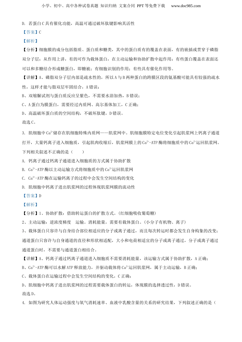 小学、初中、高中各种试卷真题知识归纳文案合同PPT等免费下载www.doc985.com南京师范大学附属中学2021届高三年级模拟考试生物一、单项选择题:1.科学家在加利福尼亚州东部的莫诺湖里发现了一种被称作GFAJ1的细菌,这种细菌能利用砷来代替磷元素构筑生命分子,进行一些关键的生化反应。已知在元素周期表中,砷排在磷下方,两者化学性质相似。下列叙述错误的是()A.GFAJ1细菌中含量较多的六种元素可能是碳、氢、氧、氮、砷、硫B.砷对多数生物有毒,可能是因为砷能够替代磷参与生化反应,导致混乱C.砷元素存在于GFAJ1细菌细胞膜、核糖体以及DNA和RNA等物质中D.该细菌的分泌蛋白在核糖体上合成后,需经过内质网和高尔基体的加工【答案】D【解析】【分析】细菌属于原核细胞,主要元素是碳、氢、氧、氮、磷、硫;糖类的元素组成是碳、氢、氧;蛋白质的主要元素是碳、氢、氧、氮绝大部分含有硫,DNA、RNA、ATP和磷脂的元素组成是碳、氢、氧、氮、磷。【详解】A、细胞内含有较多的元素有碳、氢、氧、氮、磷、硫,同时根据题干可以知道,砷元素可以代替磷元素,说明GFAJ-1的细菌体内含量较多的是碳、氢、氧、氮、砷、硫,A正确;B、因为题干已强调“在元素周期表中,砷排在磷下方,两者属于同族化学性质相似”,因此对多数生物来说,砷之所以有毒,是因为砷与磷化学性质相似,它能够代替磷参与的生化反应制造混乱,B正确;C、细胞膜、核糖体以及DNA和RNA中都有磷元素,所以砷元素可以替代磷存在于GFAJ-1细菌细胞膜以及核糖体以及DNA和RNA中,C正确;D、细菌属于原核生物,没有内质网和高尔基体,D错误。故选D。2.下图表示细胞膜上3种膜蛋白与磷脂双分子层之间的位置关系。下列叙述正确的是()A.蛋白A和蛋白B的跨膜中间区段主要由亲水性氨基酸构成B.用双缩脲试剂鉴定蛋白A,需用水浴加热才能呈紫色C.A蛋白在核糖体上合成,需要经过内质网、高尔基体加工小学、初中、高中各种试卷真题知识归纳文案合同PPT等免费下载www.doc985.comD.若蛋白C具有催化功能,高温可通过破坏肽键影响其活性【答案】C【解析】【分析】细胞膜的成分包括脂质、蛋白质和糖类,其中的蛋白质有的覆盖在表面,有的嵌插或贯穿于磷脂双分子层;从作用上讲,有的可作为载体蛋白,在主动运输和协助扩散中起作用;有些蛋白覆盖在表面还可以和多糖结合形成糖蛋白,即糖被;有细胞识别的作用;有些具有催化作用等。【详解】A、磷脂双分子层内部是疏水性的,所以A与B两种蛋白的跨膜区段的氨基酸可能具有较强的疏水性,这样才能与脂双层牢固结合,A错误;B、双缩脲试剂与蛋白质反应呈紫色,不需要水浴加热,B错误;C、A蛋白为膜蛋白,需要经过内质网、高尔基体加工,C正确;D、高温破坏蛋白质的空间结构,不破坏肽键,D错误。故选C。3.肌细胞中Ca2+储存在肌细胞特殊内质网——肌浆网中。肌细胞膜特定电位变化引起肌浆网上钙离子通道打开,大量钙离子进入细胞质,引起肌肉收缩后,肌浆网膜上的Ca2+-ATP酶将细胞质中的Ca2+运回肌浆网。下列相关叙述不正确的是()A.钙离子通过钙离子通道进入细胞质的方式属于协助扩散B.Ca2+-ATP酶以主动运输方式将细胞质中的Ca2+运回肌浆网C.Ca2+-ATP酶在运输钙离子的过程中会发生空间结构的变化D.肌细胞中钙离子进出肌浆网的过程体现肌浆网膜的流动性【答案】D【解析】【分析】1、协助扩散:借助转运蛋白的扩散方式。(红细胞吸收葡萄糖)2、主动运输:逆浓度梯度的运输。消耗能量,需要有载体蛋白。(小分子有机物、离子)3、载体蛋白只容许与自身结合部位相适应的分子或离子通过,而且每次转运时都会发生自身构象的改变;通道蛋白只容许与自身通道的直径和形状相适配,大小和电荷相适宜的分子或离子通过,分子或离子通过通道蛋白时,不需要与通道蛋白相结合。【详解】A、钙离子通过钙离子通道进入细胞质不需要消耗能量,该运输方式属于协助扩散,A正确;B、Ca2+-ATP酶可以水解ATP释放能力,并驱动载体将Ca2+运回肌浆网,属于主动运输,B正确;C、载体蛋白在运输过程中会发生空间结构的变化,C正确;D、肌细胞中钙离子进出肌浆网的过程需要载体蛋白的转运,体现膜的选择透过性,D错误。故选D。4.如图...