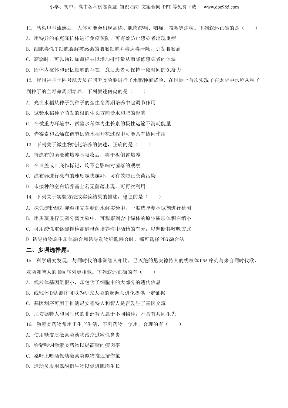 小学、初中、高中各种试卷真题知识归纳文案合同PPT等免费下载www.doc985.com2022~2023学年度苏锡常镇四市高三教学情况调研(一)生物一、单项选择题1.发菜的营养细胞呈绿色能进行光合作用,其异形细胞具有固氮能力。下列关于发菜的叙述,错误的是()A.营养细胞中含有叶绿体B.属于自养生物C.能生存在缺氮的土壤中D.无核膜包被的细胞核2.某病毒可由其刺突蛋白与人肺泡细胞表面的一种受体蛋白结合,发生膜融合从而进入细胞,下列叙述错误的是()A.病毒的生活离不开细胞B.该病毒含有蛋白质和脂质C.病毒的遗传物质是DNA和RNAD.在普通光镜下无法观察到其刺突蛋白3.线粒体在代谢中会产生H2O2、含氧自由基等活性氧,大量活性氧会导致线粒体膜结构损伤,并产生更多活性氧。下列叙述错误的是()A.H2O2能被细胞内的过氧化氢酶催化分解B.含氧自由基不会损害细胞中的DNAC.大量活性氧的产生会导致有氧呼吸的第三阶段受阻D.大量活性氧的产生可能是导致细胞衰老的原因之一4.高身形的长颈鹿能耐受其他哺乳动物2倍以上的血压,这与其心血管发育相关的FGFRL1基因编码的蛋白质含有7个特异氨基酸突变有关。下列叙述正确的是()A.高身形使长颈鹿能采食高处的树叶,这降低了与其它草食动物的生态位竞争B.为了将血液输送到大脑,长颈鹿的心血管系统和高身形之间发生了协同进化C.高身形诱导产生的FGFRL1基因突变,为预防和治疗高血压的研究提供了新的靶点D.基因组学能解析长颈鹿耐受高血压的机制,为生物进化提供最直接的证据5.生物遗传信息传递的一般规律可用中心法则表示,下列叙述错误的是()A.遗传信息可以从核酸流向蛋白质,不能从蛋白质流向核酸B.一种多聚体的序列能被用作合成另一种多聚体的模板C.线粒体和叶绿体中的遗传信息传递不遵循中心法则D.表观遗传未改变中心法则中遗传信息的流向6.洄游鱼类在从海水环境移动到淡水时,生理调节机制会改变水和盐的摄入和排出以维持水盐平衡。下小学、初中、高中各种试卷真题知识归纳文案合同PPT等免费下载www.doc985.com列关于洄游鱼类进入淡水后发生的变化的叙述中,错误的是()A.饮水量明显增加B.肾小管对水的重吸收减少C.Na+和Cl-排出量减少D.从淡水中主动吸收Na+和Cl-7.下列关于小鼠肾小管上皮细胞体外培养及应用的叙述,错误的是()A.将肾皮质充分剪碎、过滤、离心,获得肾小管上皮组织块B.实验开始前,实验器械和试剂都必须经过高压蒸汽灭菌处理C.进行传代培养时,贴壁肾小管上皮细胞需用胰蛋白酶等处理D.建立小鼠肾小管上皮细胞培养体系可为肾病的体外研究提供实验基础8.“古遗六法”中对黄酒酿造作了如是描述:黍米必齐、曲蘖必时、水泉必香、陶器必良、湛炽必洁、火剂必得。下列叙述错误的是()A.“黍米必齐”是指发酵原材料需优良,为酵母菌发酵提供物质和能量B.“曲蘖必时”是指制曲时应选择适宜的节气,确保酵母菌繁殖所需的温度等条件C.“陶器必良”“火剂必得”“湛炽必洁”均指需控制发酵过程的环境条件D.通过上述过程酿出的鲜酒成分单一,无需灭菌可直接罐装为成品销售9.下图表示某自然保护区中,五种植物种群内部各级胸径个体所占的比例。相关分析错误的是()A.图中数据可通过样方法获取,操作中要随机取样B.各胸径径级个体的比例可表示种群的年龄结构C.径级较低群体中金钱槭占据竞争优势,数量较多D.白辛树种群将走向衰退,应给予重点保护10.细胞在进行DNA复制时所用的引物不是DNA,而是RNA,下列叙述正确的是()A.DNA复制时,引物均沿2条模板链的5’→3’延伸B.RNA引物可从子链DNA上移除,表明限制酶可特异性切割RNAC.在补齐移除RNA引物后留下的缺口时,需要DNA聚合酶的参与D.细胞内DNA复制不直接以DNA为引物,与DNA聚合酶催化活性直接相关小学、初中、高中各种试卷真题知识归纳文案合同PPT等免费下载www.doc985.com11.感染甲型流感后,人体可能会出现高烧、肌肉酸痛、咽痛、咳嗽等症状。下列叙述正确的是()A.用特异的单克隆抗体进行免疫预防,可有效防止感染者出现重症B.细胞毒性T细胞裂解被感染的咽喉细胞并将病毒清除,引发咽喉痛C.高烧时,可以通过加盖棉被以增加排汗量从而降低感染者的体温D.因体内抗体和记忆细胞的存在...