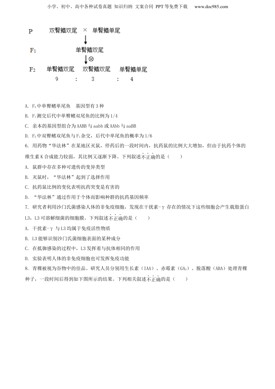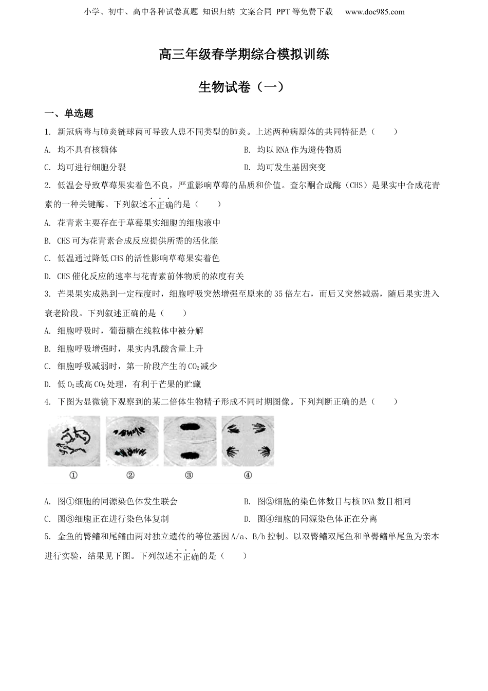 小学、初中、高中各种试卷真题知识归纳文案合同PPT等免费下载www.doc985.com高三年级春学期综合模拟训练生物试卷(一)一、单选题1.新冠病毒与肺炎链球菌可导致人患不同类型的肺炎。上述两种病原体的共同特征是()A.均不具有核糖体B.均以RNA作为遗传物质C.均可进行细胞分裂D.均可发生基因突变2.低温会导致草莓果实着色不良,严重影响草莓的品质和价值。查尔酮合成酶(CHS)是果实中合成花青素的一种关键酶。下列叙述不正确的是()A.花青素主要存在于草莓果实细胞的细胞液中B.CHS可为花青素合成反应提供所需的活化能C.低温通过降低CHS的活性影响草莓果实着色D.CHS催化反应的速率与花青素前体物质的浓度有关3.芒果果实成熟到一定程度时,细胞呼吸突然增强至原来的35倍左右,而后又突然减弱,随后果实进入衰老阶段。下列叙述正确的是()A.细胞呼吸时,葡萄糖在线粒体中被分解B.细胞呼吸增强时,果实内乳酸含量上升C.细胞呼吸减弱时,第一阶段产生的CO2减少D.低O2或高CO2处理,有利于芒果的贮藏4.下图为显微镜下观察到的某二倍体生物精子形成不同时期图像。下列判断正确的是()A.图①细胞的同源染色体发生联会B.图②细胞的染色体数目与核DNA数目相同C.图③细胞正在进行染色体复制D.图④细胞的同源染色体正在分离5.金鱼的臀鳍和尾鳍由两对独立遗传的等位基因A/a、B/b控制。以双臀鳍双尾鱼和单臀鳍单尾鱼为亲本进行实验,结果见下图。下列叙述不正确的是()小学、初中、高中各种试卷真题知识归纳文案合同PPT等免费下载www.doc985.comA.F2中单臀鳍单尾鱼的基因型有3种B.F1测交后代中单臀鳍双尾鱼的比例为1/4C.亲本的基因型组合为AABB与aabb或AAbb与aaBBD.F2中双臀鳍双尾鱼与F1杂交,后代中单尾鱼的概率为1/66.用药物“华法林”在某地区灭鼠,停药后的一段时间内,抗药鼠的比例大大增加,但由于抗药个体的维生素K合成能力较弱,其比例又逐渐下降。下列叙述不正确的是()A.鼠群中存在多种可遗传的变异类型B.灭鼠时,“华法林”起到了选择作用C.抗药鼠比例的变化表明抗药突变是有害的D.“华法林”通过作用于个体而影响种群的抗药基因频率7.研究者利用沙门氏菌感染人体的非免疫细胞,发现在干扰素-γ存在的情况下这些细胞会产生载脂蛋白L3,L3可溶解细菌的细胞膜。下列叙述不正确的是()A.干扰素-γ与L3均属于免疫活性物质B.L3能够识别沙门氏菌细胞表面的某种成分C.在抵御感染的过程中,L3发挥着与抗体相同的作用D.实验表明人体的非免疫细胞也可发挥免疫功能8.青稞被视为谷物中的佳品。研究人员分别用生长素(IAA)、赤霉素(GA3)、脱落酸(ABA)处理青稞种子,一段时间后得到如下图所示的结果。下列相关叙述不正确的是()小学、初中、高中各种试卷真题知识归纳文案合同PPT等免费下载www.doc985.comA.上述实验中,各组青稞的根均可生长B.IAA促进青稞根生长的最适浓度约为6µmol/LC.GA3与ABA调节青稞根生长的效果相反D.该实验结果并未体现出IAA作用的两重性9.调查某森林群落乔木层的5个优势种的年龄结构,结果如下图。下列叙述正确的是()A.5个优势种与其他乔木、灌木、草本植物共同构成了森林群落B.调查乔木年龄结构时应采用样方法,选取1m×1m的正方形C.香果树和野核桃的种群年龄结构为增长型,其余3种接近衰退型D.随着群落的演替,香果树种群的优势地位将更加明显10.柴油是重要的燃料油之一,泄漏或不当排放会造成环境污染。研究者从被柴油污染的土壤中获取了3种柴油降解菌进行研究,结果见下表。下列叙述不正确的是()柴油浓度(%)菌株降解率(%)1245小学、初中、高中各种试卷真题知识归纳文案合同PPT等免费下载www.doc985.comY190.960.853.541.0Y292.8---Y370.142.5--注:“-”表示菌株不能生长A.为获得降解菌,应用以柴油为唯一碳源的培养基B.所用培养基和土壤样液均需进行严格灭菌C.可采用稀释涂布平板法获得降解菌的单菌落D.Y1对高浓度柴油的耐受性更强11.“筛选”是生物技术与工程中常用的技术手段。下列叙述不正确的是()A.单倍体育种时,需对F1的花药进行筛选后才可继续进行组织培养B.制备单克隆抗体时,需从分子水平筛选能产生所需抗体的杂交瘤细胞C.胚胎移植...
