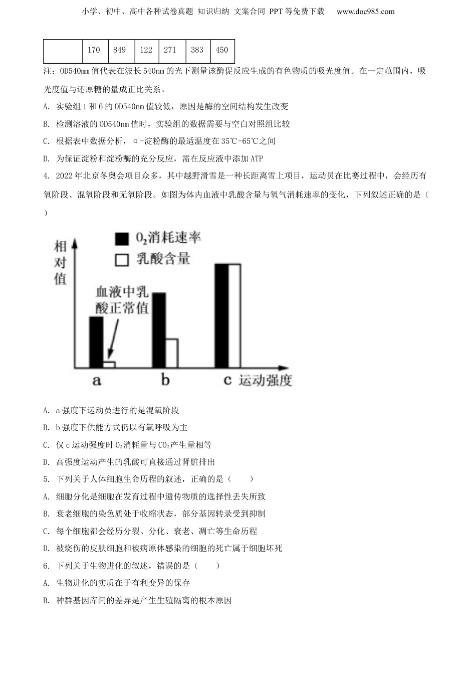 小学、初中、高中各种试卷真题知识归纳文案合同PPT等免费下载www.doc985.com徐州七中高三年级高考考前模拟(一)生物试卷一、单项选择题1.下列关于组成生物体化合物的叙述,正确的是()A.组成中心体的磷脂分子具有亲水性的头部和疏水性的尾部B.蛋白质经碱性蛋白酶处理后能与双缩脲试剂发生紫色反应C.生物体内能发生水解反应生成单体的化合物属于生物大分子D.由2个氨基酸分子脱水缩合而成的肽称为二肽,可被双缩脲试剂检测2.研究表明,氰化物对线粒体具有毒害作用。研究人员测定了氰化物对豌豆细胞膜电位变化的影响,结果如图所示。下列相关叙述错误的是()A.豌豆细胞膜电位的形成,与多种离子的主动运输或被动运输有关B.该电位测定时,两个电极分别放在膜内外两侧且膜外定为零电位C.移除氰化物后,豌豆细胞膜内外各种离子的进出处于平衡状态D.加入氰化物后细胞内酸性增强,表明H+主动运输排出细胞过程受阻3.某研究小组利用α-淀粉酶与淀粉溶液探究温度对酶活性的影响时,使用二硝基水杨酸法检测还原糖含量,各组实验结果如下表所示。下列相关叙述正确的是()组别123456温度(℃)02235456585OD540nm0.0.1.1.1.0.小学、初中、高中各种试卷真题知识归纳文案合同PPT等免费下载www.doc985.com170849122271383450注:OD540mm值代表在波长540nm的光下测量该酶促反应生成的有色物质的吸光度值。在一定范围内,吸光度值与还原糖的量成正比关系。A.实验组1和6的OD540nm值较低,原因是酶的空间结构发生改变B.检测溶液的OD540nm值时,实验组的数据需要与空白对照组比较C.根据表中数据分析,α-淀粉酶的最适温度在35℃-65℃之间D.为保证淀粉和淀粉酶的充分反应,需在反应液中添加ATP4.2022年北京冬奥会项目众多,其中越野滑雪是一种长距离雪上项目,运动员在比赛过程中,会经历有氧阶段、混氧阶段和无氧阶段。如图为体内血液中乳酸含量与氧气消耗速率的变化,下列叙述正确的是()A.a强度下运动员进行的是混氧阶段B.b强度下供能方式仍以有氧呼吸为主C.仅c运动强度时O2消耗量与CO2产生量相等D.高强度运动产生的乳酸可直接通过肾脏排出5.下列关于人体细胞生命历程的叙述,正确的是()A.细胞分化是细胞在发育过程中遗传物质的选择性丢失所致B.衰老细胞的染色质处于收缩状态,部分基因转录受到抑制C.每个细胞都会经历分裂、分化、衰老、凋亡等生命历程D.被烧伤的皮肤细胞和被病原体感染的细胞的死亡属于细胞坏死6.下列关于生物进化的叙述,错误的是()A.生物进化的实质在于有利变异的保存B.种群基因库间的差异是产生生殖隔离的根本原因小学、初中、高中各种试卷真题知识归纳文案合同PPT等免费下载www.doc985.comC.适应的形成离不开生物的遗传和变异及与环境的相互作用D.不同生物蛋白质差异的大小可代表生物种类亲缘关系的远近7.下图表示NAT10蛋白介导的mRNA乙酰化修饰参与癌症进展的机制,相关叙述错误的是()A.过程②中的mRNA乙酰化修饰,可以提高mRNA的稳定性B.过程③发生在游离的核糖体上,且需要相关酶和ATP的参与C.发生转移的胃癌患者体内,NAT10蛋白和COL5A1蛋白水平均较高D.靶向干预NAT10蛋白介导的mRNA乙酰化修饰,可抑制癌细胞扩散8.某植物的重瓣花与单瓣花是常染色体上基因A、a控制的一对相对性状。选用一株单瓣花植株自交,F1中单瓣和重瓣花各占50%。对F1单瓣花植株进行花粉离体培养后再用秋水仙素处理,获得的全为重瓣花植株。下列叙述错误的是()A.该植株可能是含A基因花粉败育,a基因花粉育性正常B.让单瓣花植株每代都自由交配,F3代个体中Aa:aa=1:7C.秋水仙素能使纺锤丝断裂,从而抑制着丝粒的分裂D.花粉离体培养需经历多个阶段,体现了细胞的全能性9.某种蝗虫正常二倍体雌性个体染色体组成为22+XX,雄性个体染色体组成为22+XO(只有一条性染色体)。下列相关叙述正确的是()A.雄蝗虫精巢细胞中的X染色体数可能是0条、1条、2条B.有丝分裂后期雄蝗虫体细胞中的染色体数比雌蝗虫少一条C.雄蝗虫在形成精原细胞的过程中会出现11个四分体D.蝗虫的基因组测序应测定13条染色体上的DNA序列10.抗利尿激素是由六肽环和三肽侧链构成的九肽化合物,能促进肾小管和集合管对水...