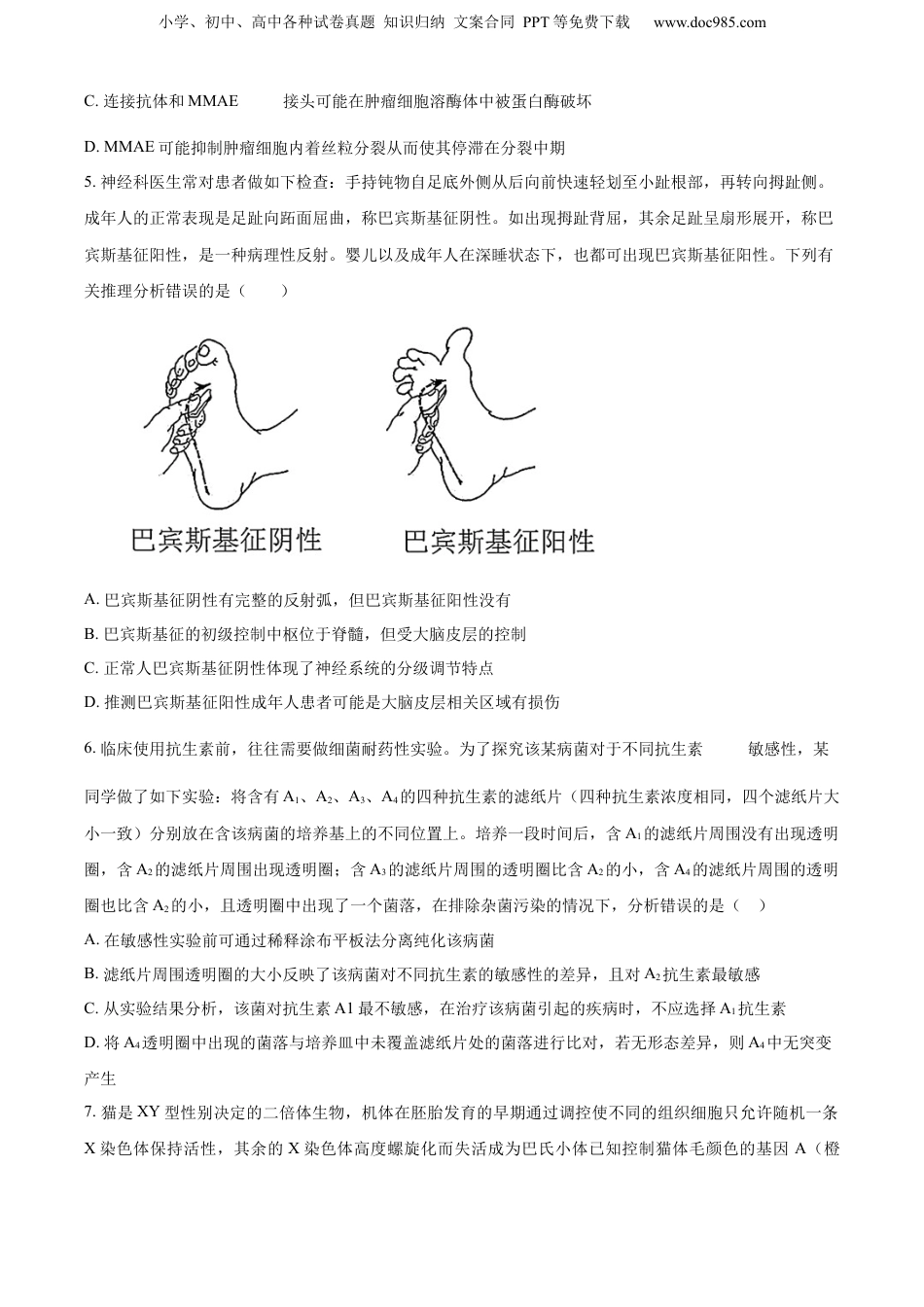 小学、初中、高中各种试卷真题知识归纳文案合同PPT等免费下载www.doc985.com江苏省前黄中学2023届高三考前攀登行动(二)生物试卷一、单项选择题。1.我国力争2060年前实现“碳中和”,发酵制氢技术是为实现“碳中和”研发的新技术,研究团队将秸秆制成发酵液培养某种细菌,进行发酵制氢。下列说法错误的是()A.碳循环平衡的破坏主要是因为煤、石油等化石燃料的大量燃烧B.“碳中和”的结果是实现CO2的排放速率和吸收速率达到平衡C.水稻、小麦的秸秆中富含纤维素,可为产氢细菌提供碳源和氮源D.与传统农业相比,发酵制氢技术既能减少CO2的排放量又能获得新能源2.在真菌细胞壁、甲壳类动物和昆虫的外骨骼中存在一种多糖称为几丁质。下列相关叙述正确的是()A.几丁质是细胞中的重要储能物质之一B.几丁质的基本骨架是若干个相连的碳原子构成的碳链C.蘑菇、虾壳中的几丁质能被人体细胞直接吸收D.几丁质的组成元素与糖原、脂肪、脱氧核糖相同3.自由基含有未配对电子,表现出高度的反应活泼性。自由基学说认为衰老过程中的退行性变化是由细胞正常代谢过程中产生的自由基造成的,下图是自由基的有害作用示意图。下列分析正确的是()A.磷脂遭攻击引起的效应属于负反馈调节,对生物膜损伤较大B.若酪氨酸酶遭攻击后活性降低,则会导致细胞内黑色素的积累C.DNA碱基对缺失、替换会导致DNA碱基序列改变,必然导致基因突变D.细胞衰老可能与生物膜损伤、蛋白质活性降低、基因突变等有关4.2021年6月,我国首个原创性抗体偶联药物(ADC)获批上市。该药采用人源化抗HER2抗体,通过可切割的接头与高效毒性分子MMAE偶联。ADC被肿瘤细胞内吞后,载荷MMAE被释放到细胞质中后,可抑制细胞中微管蛋白聚合,进而影响纺锤体的形成。下列叙述错误的是()A.传统鼠源性单抗可能会引起人体产生相应抗体进而影响ADC的效果B.ADC中接头稳定性偏低会导致药物分子脱落而对正常细胞造成损伤小学、初中、高中各种试卷真题知识归纳文案合同PPT等免费下载www.doc985.comC.连接抗体和MMAE的接头可能在肿瘤细胞溶酶体中被蛋白酶破坏D.MMAE可能抑制肿瘤细胞内着丝粒分裂从而使其停滞在分裂中期5.神经科医生常对患者做如下检查:手持钝物自足底外侧从后向前快速轻划至小趾根部,再转向拇趾侧。成年人的正常表现是足趾向跖面屈曲,称巴宾斯基征阴性。如出现拇趾背屈,其余足趾呈扇形展开,称巴宾斯基征阳性,是一种病理性反射。婴儿以及成年人在深睡状态下,也都可出现巴宾斯基征阳性。下列有关推理分析错误的是()A.巴宾斯基征阴性有完整的反射弧,但巴宾斯基征阳性没有B.巴宾斯基征的初级控制中枢位于脊髓,但受大脑皮层的控制C.正常人巴宾斯基征阴性体现了神经系统的分级调节特点D.推测巴宾斯基征阳性成年人患者可能是大脑皮层相关区域有损伤6.临床使用抗生素前,往往需要做细菌耐药性实验。为了探究该某病菌对于不同抗生素的敏感性,某同学做了如下实验:将含有A1、A2、A3、A4的四种抗生素的滤纸片(四种抗生素浓度相同,四个滤纸片大小一致)分别放在含该病菌的培养基上的不同位置上。培养一段时间后,含A1的滤纸片周围没有出现透明圈,含A2的滤纸片周围出现透明圈;含A3的滤纸片周围的透明圈比含A2的小,含A4的滤纸片周围的透明圈也比含A2的小,且透明圈中出现了一个菌落,在排除杂菌污染的情况下,分析错误的是()A.在敏感性实验前可通过稀释涂布平板法分离纯化该病菌B.滤纸片周围透明圈的大小反映了该病菌对不同抗生素的敏感性的差异,且对A2抗生素最敏感C.从实验结果分析,该菌对抗生素A1最不敏感,在治疗该病菌引起的疾病时,不应选择A1抗生素D.将A4透明圈中出现的菌落与培养皿中未覆盖滤纸片处的菌落进行比对,若无形态差异,则A4中无突变产生7.猫是XY型性别决定的二倍体生物,机体在胚胎发育的早期通过调控使不同的组织细胞只允许随机一条X染色体保持活性,其余的X染色体高度螺旋化而失活成为巴氏小体已知控制猫体毛颜色的基因A(橙小学、初中、高中各种试卷真题知识归纳文案合同PPT等免费下载www.doc985.com色)、a(黑色)位于X染色体上下列分析正确的是()A.构成巴氏小体的主要成分是RNA和蛋白质B.正常雄猫...