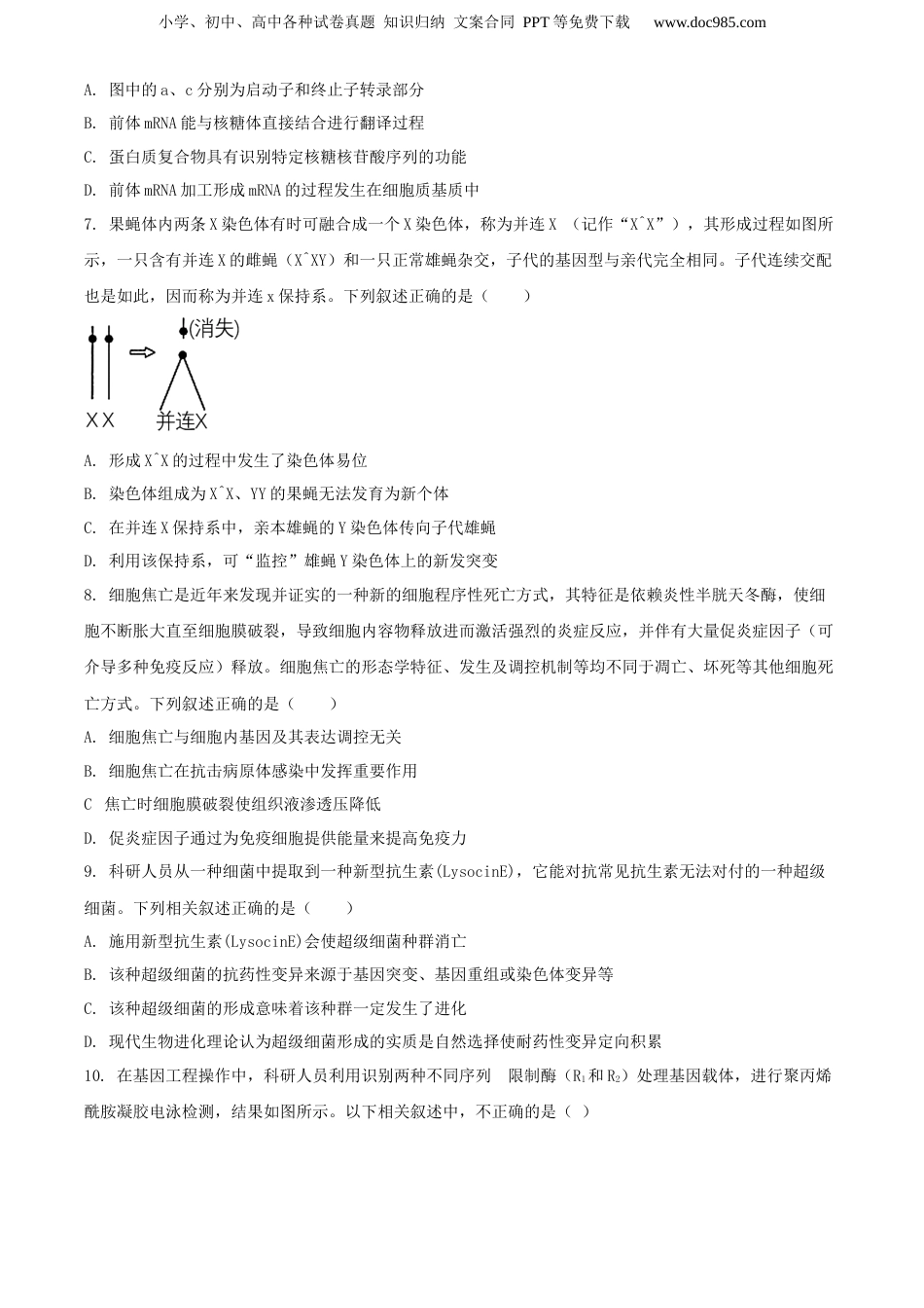 小学、初中、高中各种试卷真题知识归纳文案合同PPT等免费下载www.doc985.com2021届高三年级模拟试卷生物一、单项选择题1.TMCOI是内质网上的跨膜蛋白,当内质网中钙离子浓度过高时,TMCOI形成具有活性的钙离子载体,并将内质网中的钙离子排出。一旦内质网中的钙离子浓度恢复到正常水平,钙离子载体活性随之消失。下列有关叙述正确的是()A.高浓度的钙离子会导致钙离子载体失活B.若敲除TMCOI基因,则内质网中钙离子浓度会下降C.TMCOI需要经内质网加工后,再由高尔基体分泌出细胞D.内质网中钙离子浓度失衡可能会导致细胞代谢紊乱2.美国科学家阿格雷和麦金农因研究细胞膜中的通道蛋白获得诺贝尔奖。通道蛋白分为两大类:水通道蛋白和离子通道蛋白。阿格雷成功分离了水通道蛋白,麦金农测得K+通道蛋白的立体结构。如图为肾小管上皮细胞重吸收水分和K+通道蛋白的立体结构的示意图。下列与通道蛋白有关的叙述错误的是()A.通道蛋白或贯穿、或嵌入、或覆盖于磷脂双分子层B.K+通道蛋白运输物质的方式为协助扩散,不需要消耗ATPC.抗利尿激素对肾小管上皮细胞上水的通透性具有调节作用D.机体可通过调节细胞膜上通道蛋白的数量或开关来调节物质的运输3.很多生物实验都需要用到强酸或强碱。下列相关叙述正确的是()A.检测还原糖时使用NaOH为显色反应提供碱性条件B.检测蛋白质时要先将NaOH与CuSO4混合产生沉淀C.浓硫酸为重铬酸钾与酒精的显色反应创造酸性条件D.使用盐酸除去植物细胞壁以达到细胞相互分离的目的4.丙酮酸进入线粒体的过程如图所示,孔蛋白为亲水通道,分子量较小的物质可自由通过。下列说法错误的是()小学、初中、高中各种试卷真题知识归纳文案合同PPT等免费下载www.doc985.comA.丙酮酸进入线粒体基质不消耗能量B.线粒体内膜上既有载体蛋白也有呼吸酶C.外膜上的孔蛋白对物质进出具有选择透过性D.缺氧条件下丙酮酸将难以进入线粒体5.由于海洋的“公有性”,许多国家每年都向海洋中倾倒大量废物,其中多数为有机营养盐。下列说法正确的是()A.有机废物的倾倒,导致浮游藻类的大量繁殖,有助于缓解温室效应B.海洋污染导致水产品体内残留毒素增加,鱼类受这--影响比藻类更加严重C.海洋水体有净化功能,只要向海洋中倾倒的废物适量就不会对环境造成污染D.污染物排放导致赤潮的爆发,说明海洋生态系统的恢复力稳定性较低6.真核生物的基因中含有外显子和内含子。细胞核内刚刚转录而来的RNA为前体mRNA,前体mRNA中的内含子在RNA自身以及其他蛋白复合物的作用下被剪切,形成mRNA运出细胞核。如图为前体mRNA的剪切示意图,相关叙述正确的是()小学、初中、高中各种试卷真题知识归纳文案合同PPT等免费下载www.doc985.comA.图中的a、c分别为启动子和终止子转录部分B.前体mRNA能与核糖体直接结合进行翻译过程C.蛋白质复合物具有识别特定核糖核苷酸序列的功能D.前体mRNA加工形成mRNA的过程发生在细胞质基质中7.果蝇体内两条X染色体有时可融合成一个X染色体,称为并连X(记作“X^X”),其形成过程如图所示,一只含有并连X的雌蝇(X^XY)和一只正常雄蝇杂交,子代的基因型与亲代完全相同。子代连续交配也是如此,因而称为并连x保持系。下列叙述正确的是()A.形成X^X的过程中发生了染色体易位B.染色体组成为X^X、YY的果蝇无法发育为新个体C.在并连X保持系中,亲本雄蝇的Y染色体传向子代雄蝇D.利用该保持系,可“监控”雄蝇Y染色体上的新发突变8.细胞焦亡是近年来发现并证实的一种新的细胞程序性死亡方式,其特征是依赖炎性半胱天冬酶,使细胞不断胀大直至细胞膜破裂,导致细胞内容物释放进而激活强烈的炎症反应,并伴有大量促炎症因子(可介导多种免疫反应)释放。细胞焦亡的形态学特征、发生及调控机制等均不同于凋亡、坏死等其他细胞死亡方式。下列叙述正确的是()A.细胞焦亡与细胞内基因及其表达调控无关B.细胞焦亡在抗击病原体感染中发挥重要作用C.焦亡时细胞膜破裂使组织液渗透压降低D.促炎症因子通过为免疫细胞提供能量来提高免疫力9.科研人员从一种细菌中提取到一种新型抗生素(LysocinE),它能对抗常见抗生素无法对付的一种超级细菌。下列相关叙述正确的是()A.施用新型抗生素(Lys...